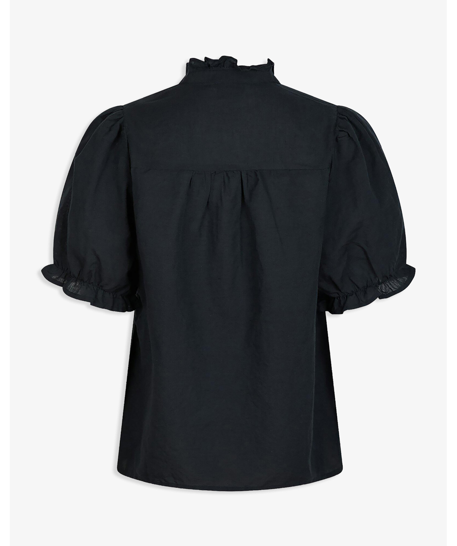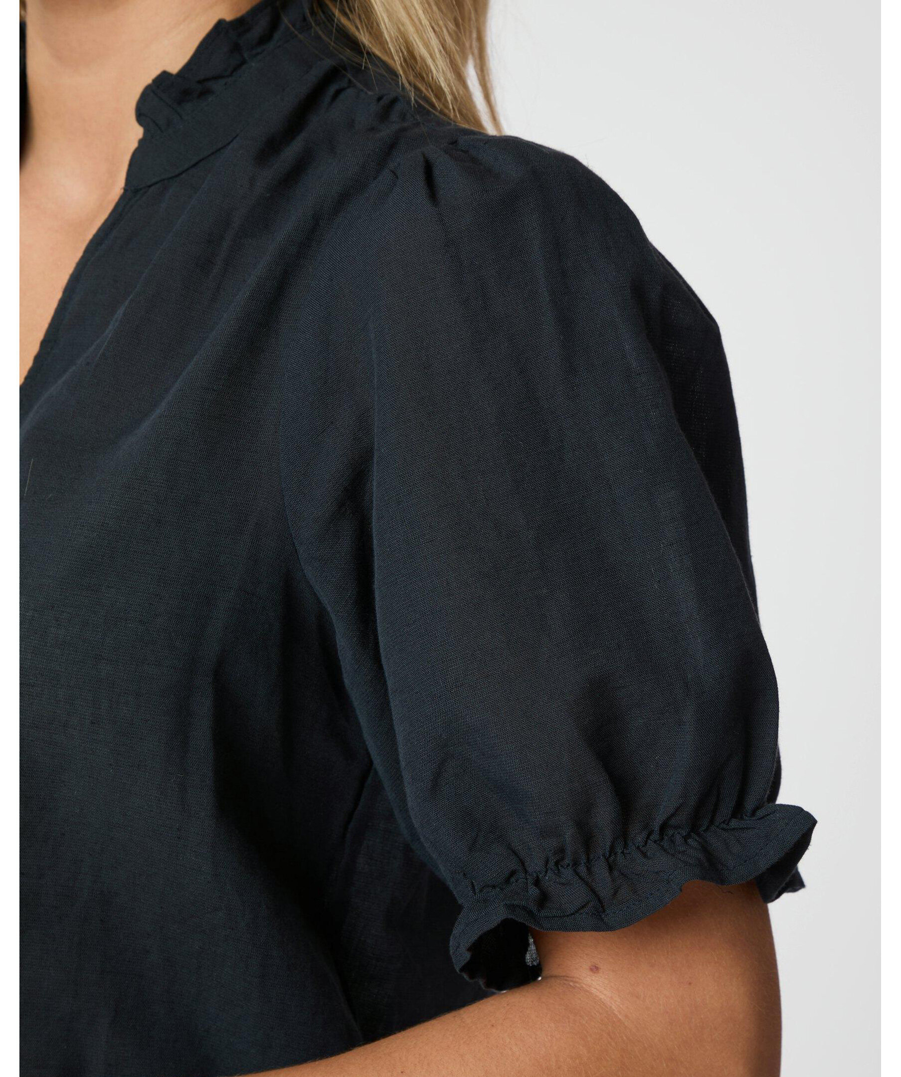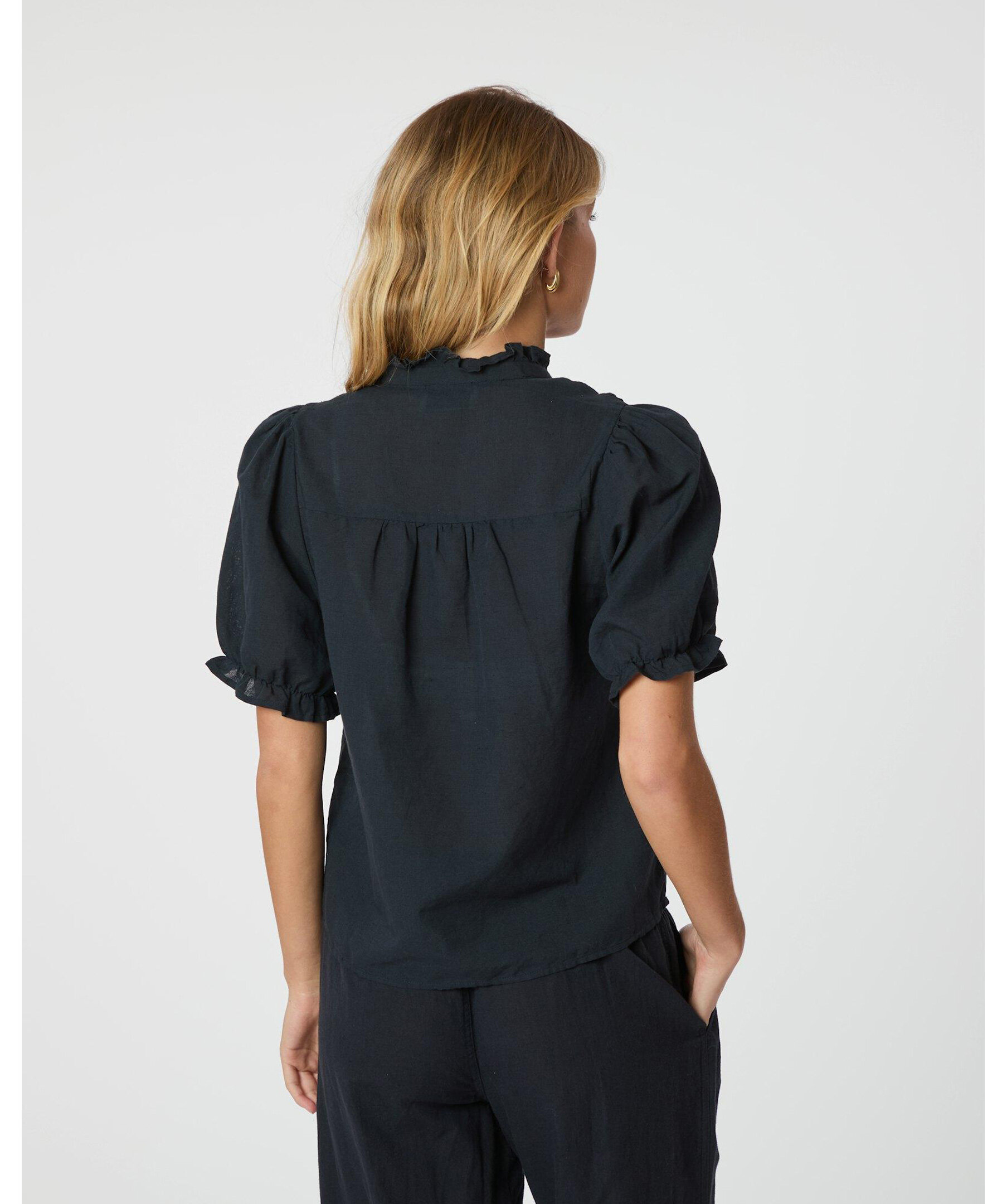 Mörkblå kortärmad blus med fint volangdetalj vid kragen och axeln. Blusen har öppning fram och puffdetalj vid ärmen.