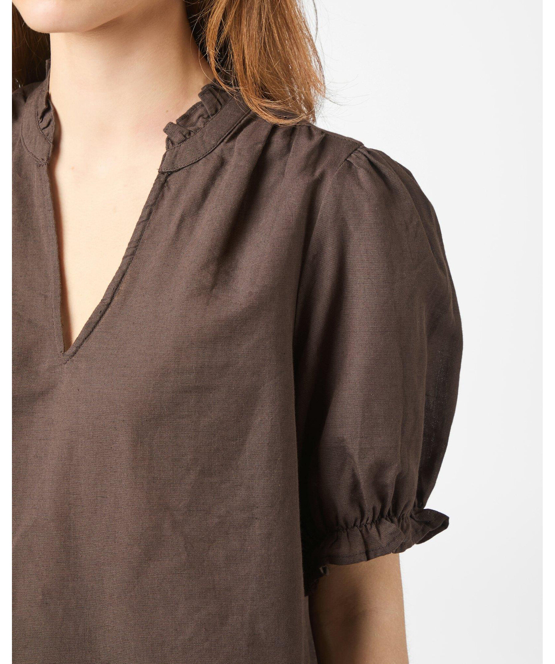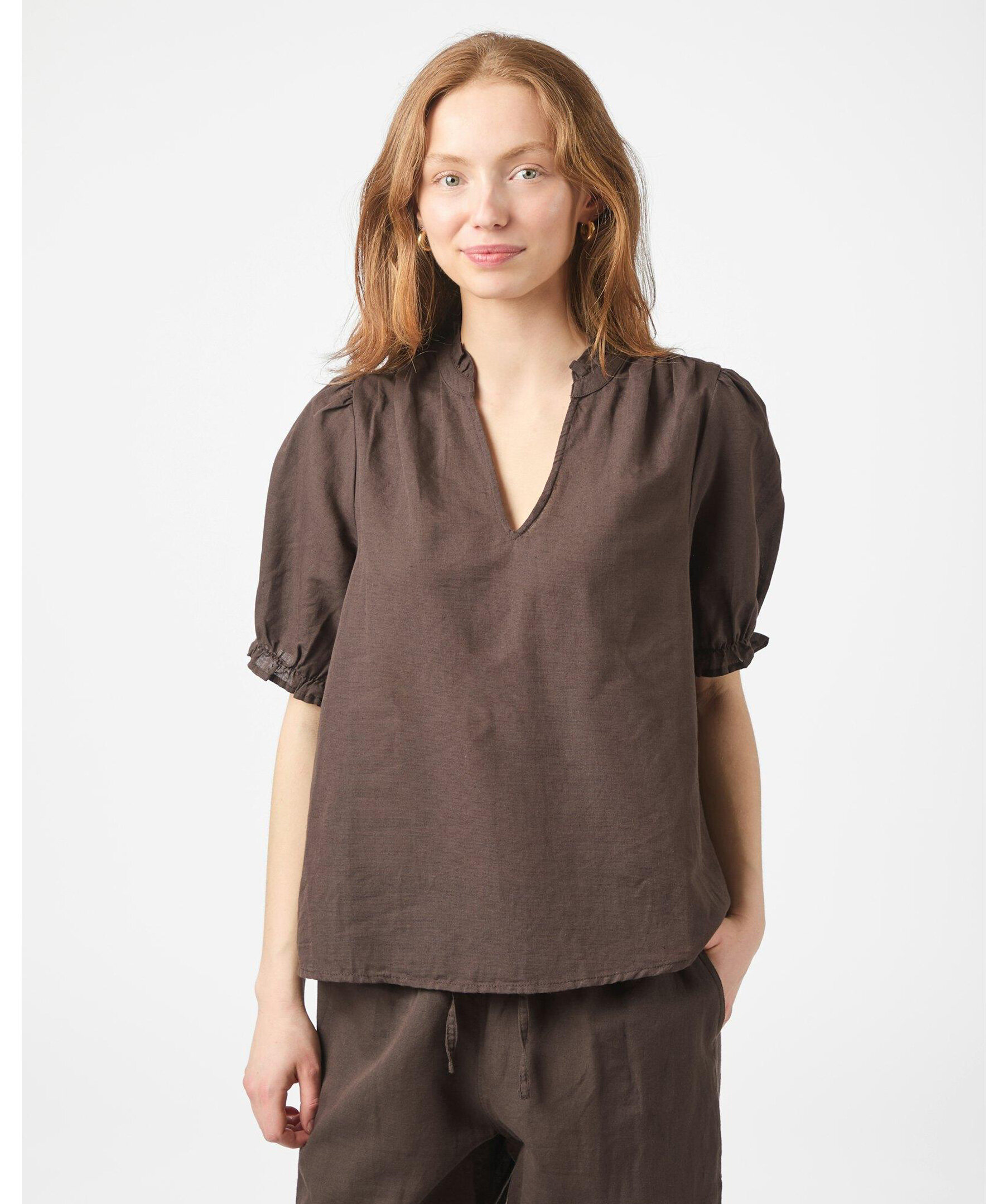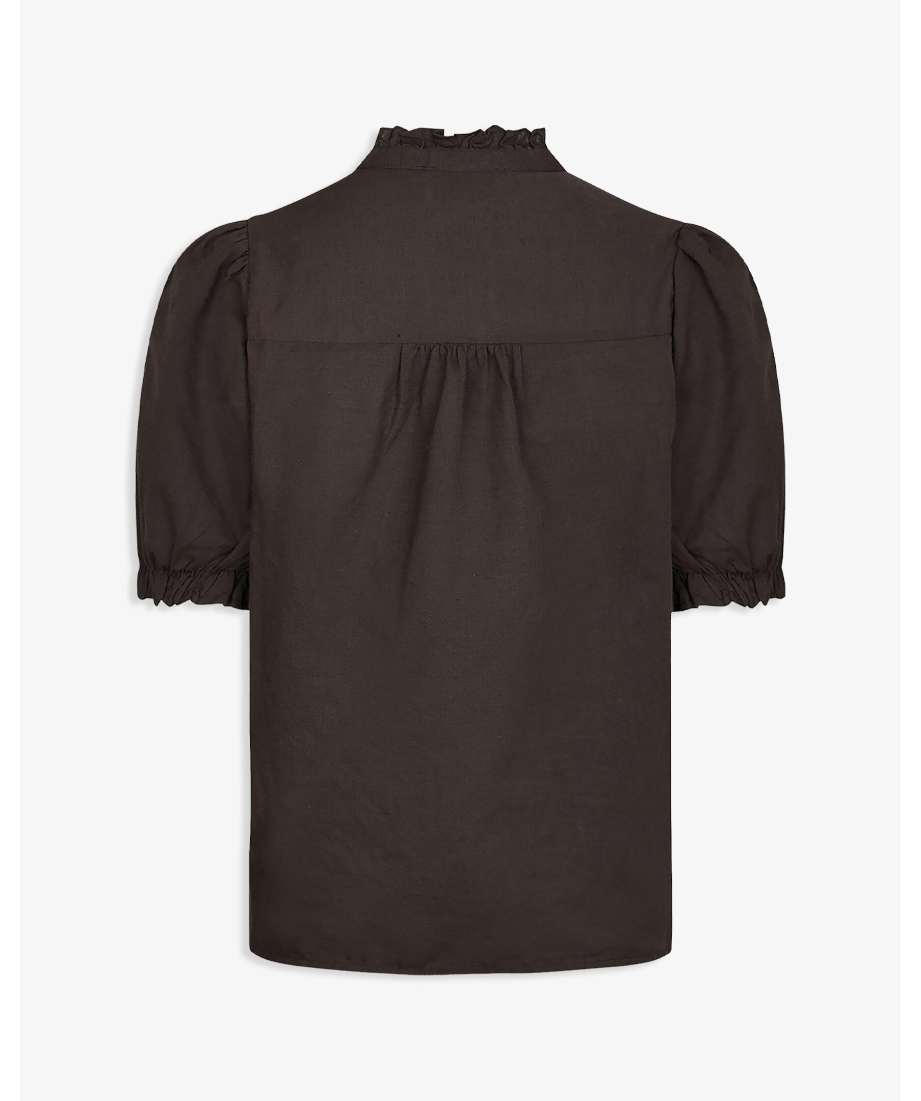 Brun kortärmad blus med fint volangdetalj vid kragen och axeln. Blusen har öppning fram och puffdetalj vid ärmen.