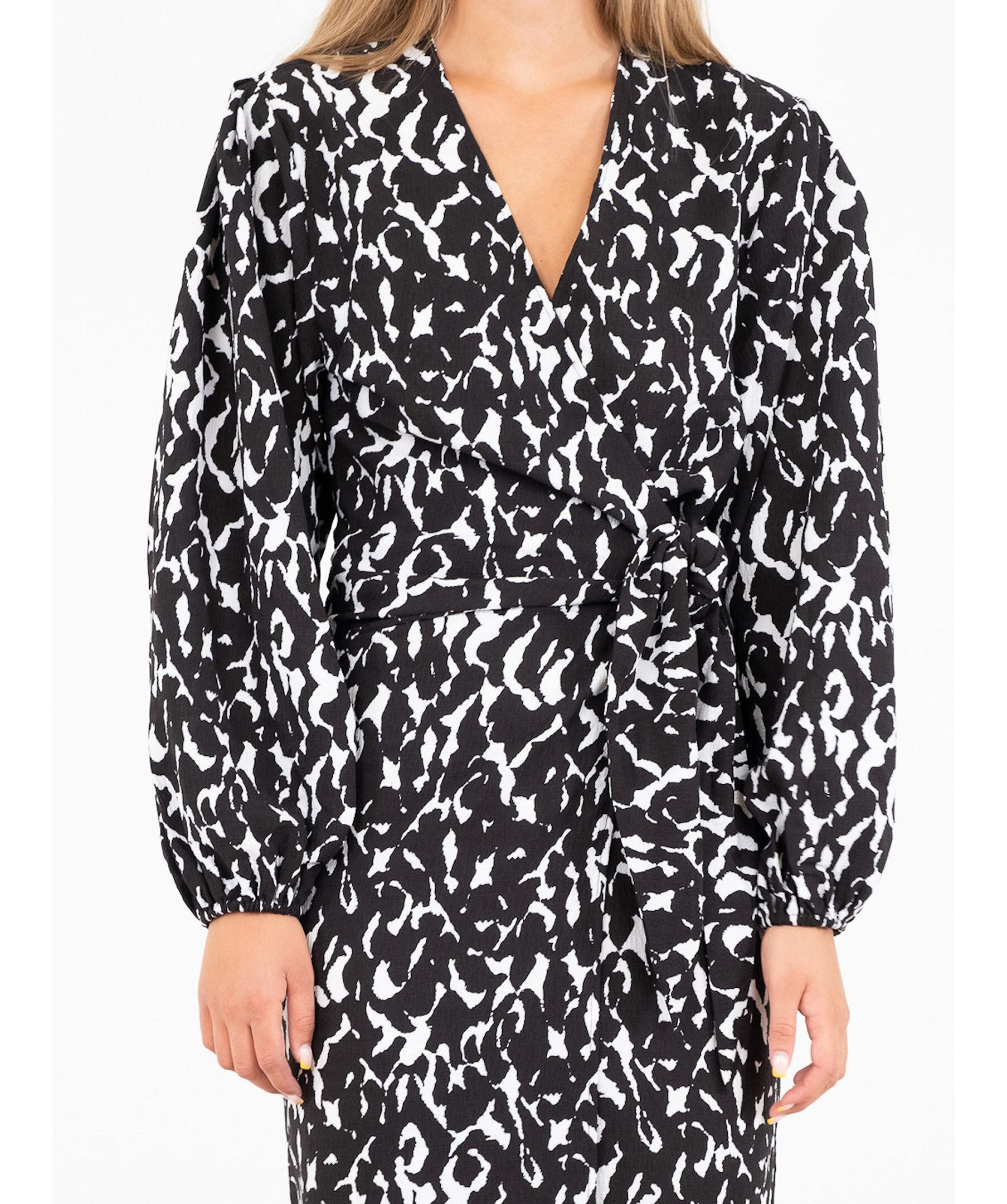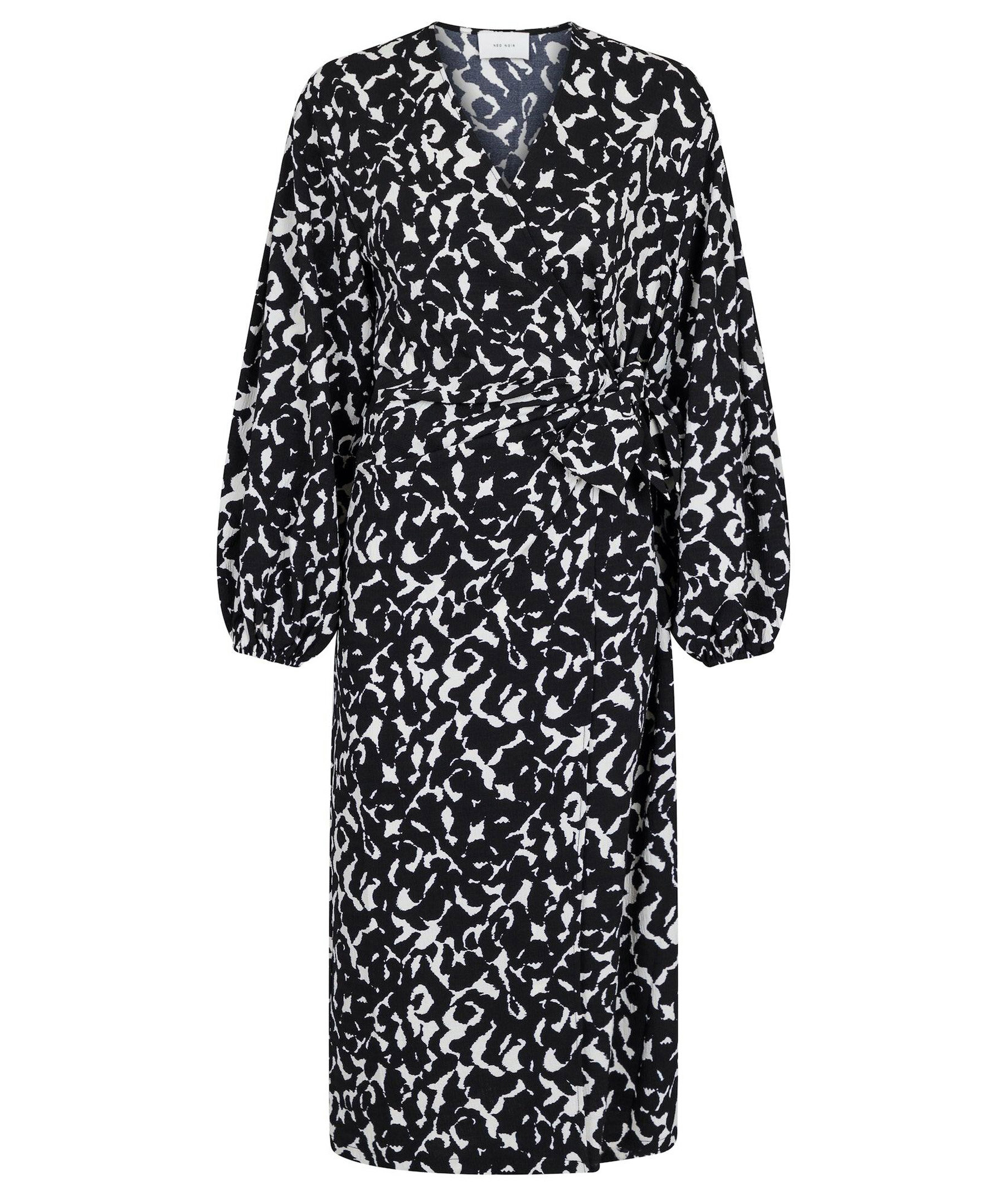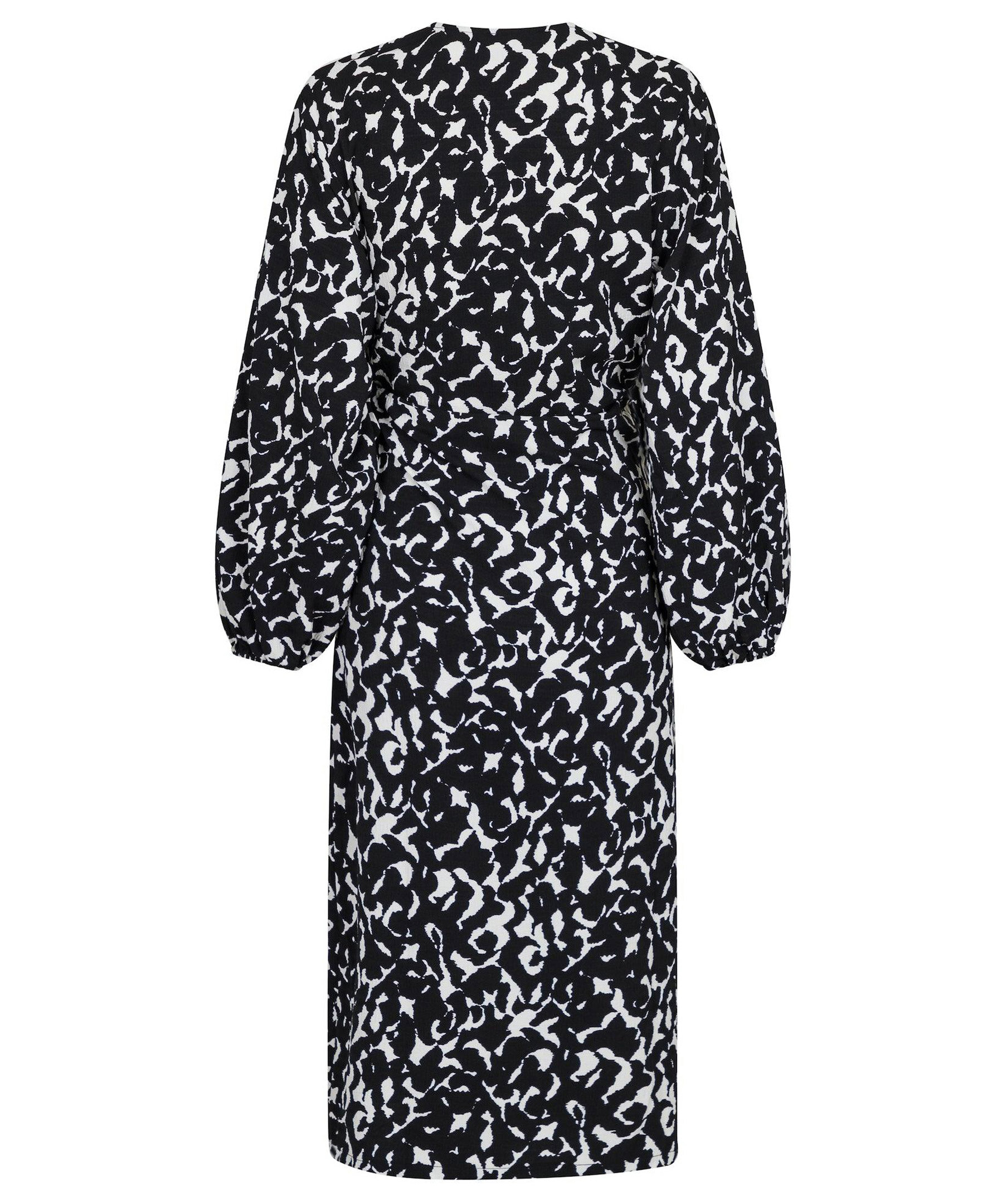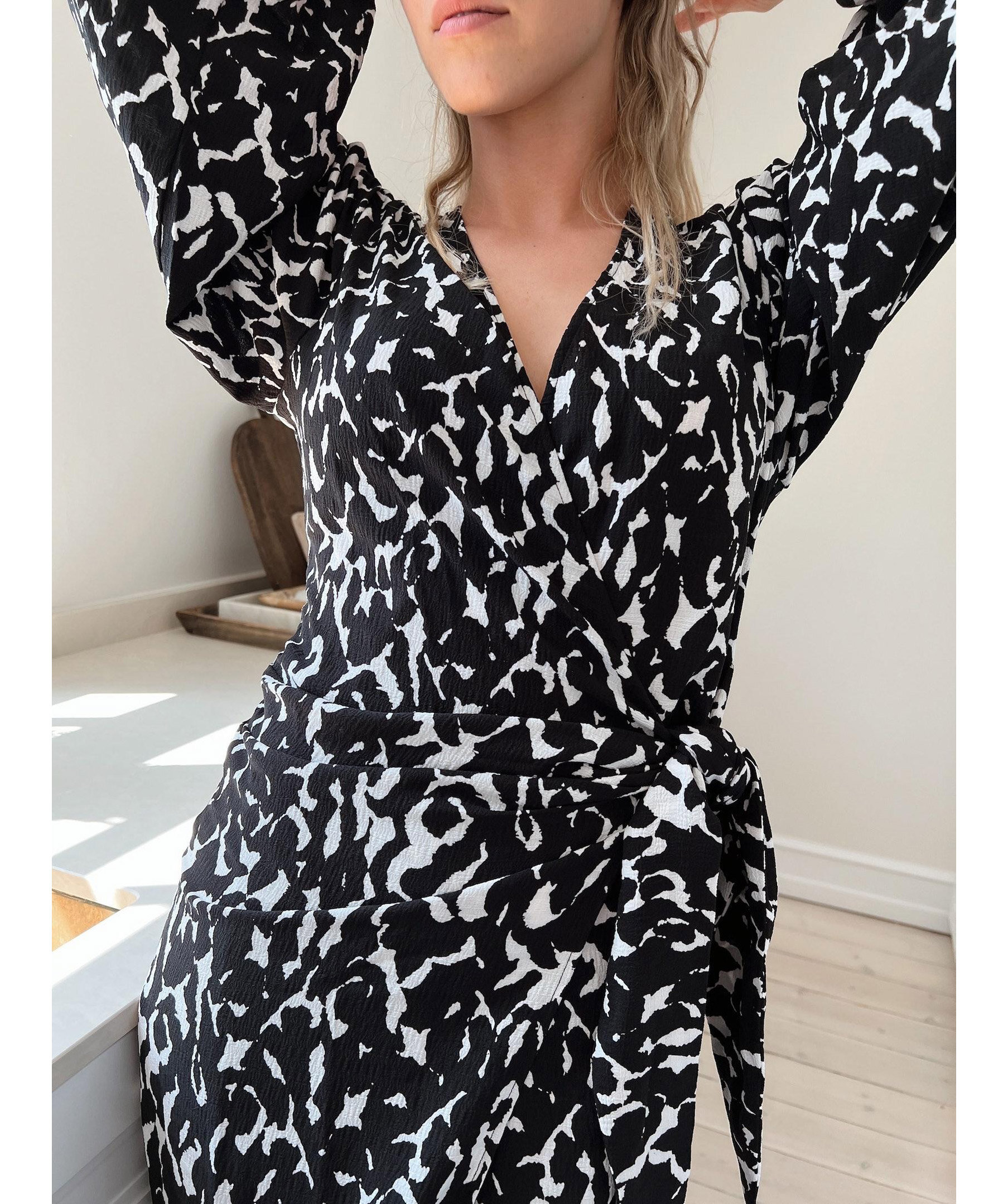 Mönstrad, midi-lång omlottklänning från Neo Noir. I bekvämt stretchigt material med grafiskt tryck. Klänningen är v-ringad och kan justeras i midjan och är bekväm och smickrande att bära. Ärmarna är avslutade med en elastisk mudd.