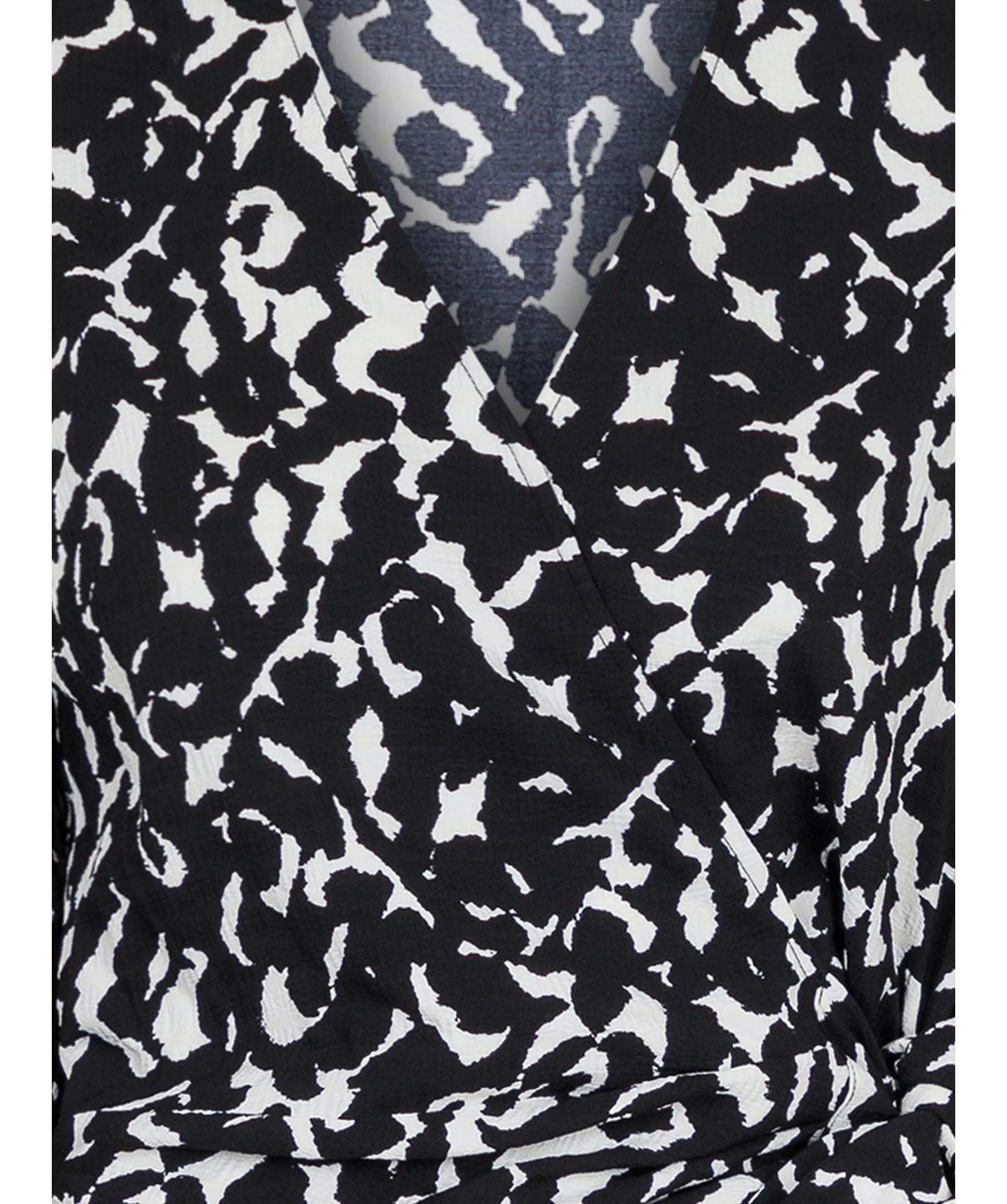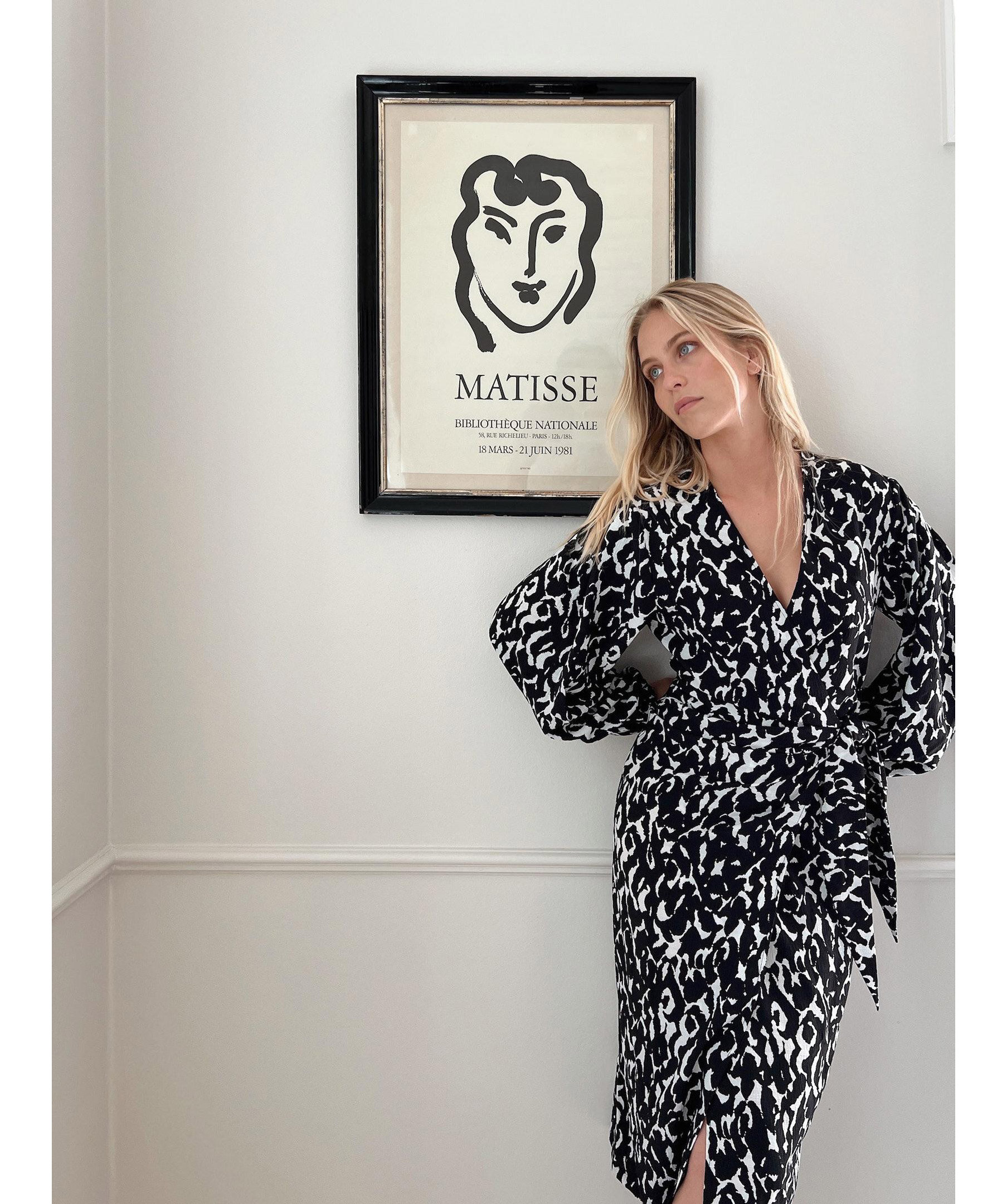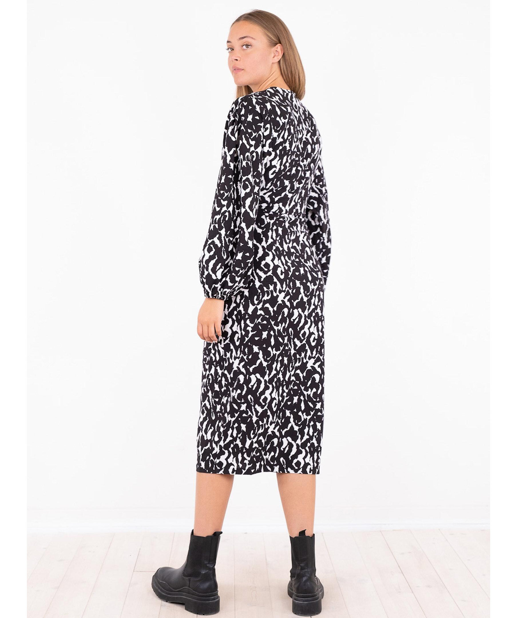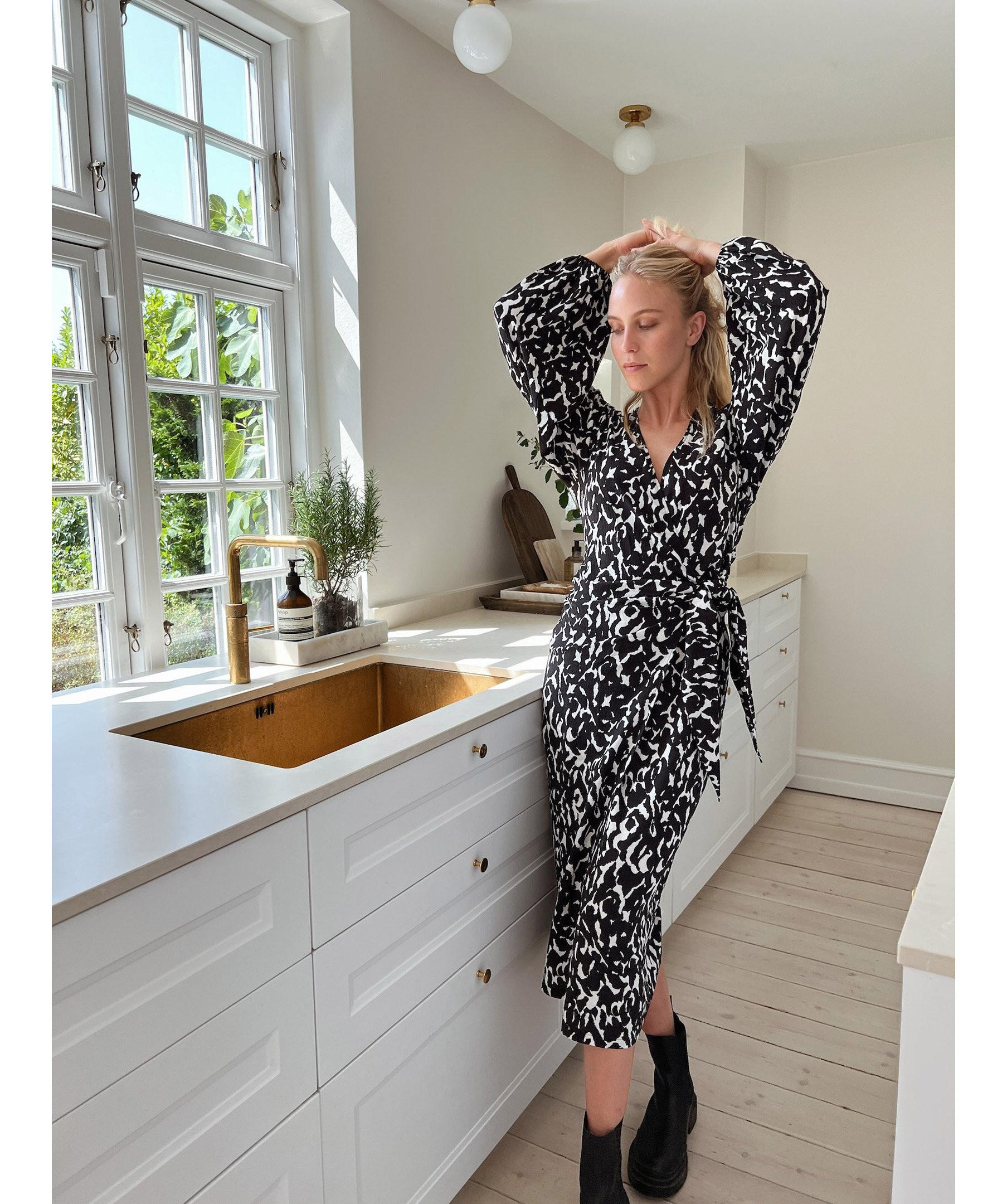 Mönstrad, midi-lång omlottklänning från Neo Noir. I bekvämt stretchigt material med grafiskt tryck. Klänningen är v-ringad och kan justeras i midjan och är bekväm och smickrande att bära. Ärmarna är avslutade med en elastisk mudd.