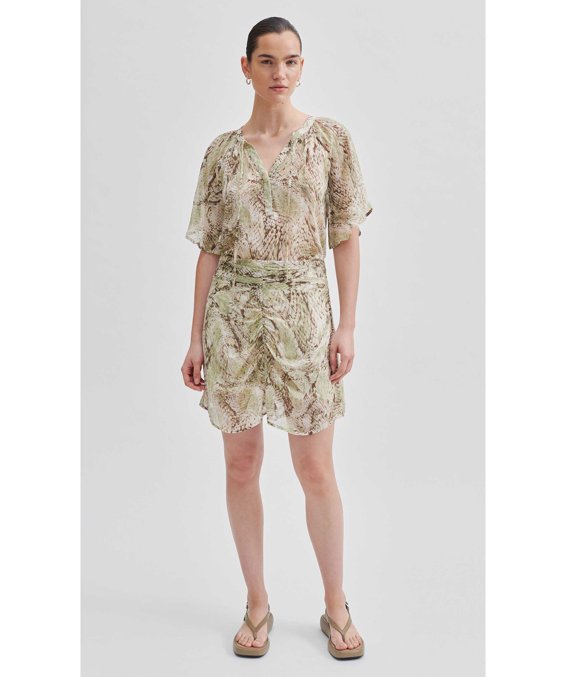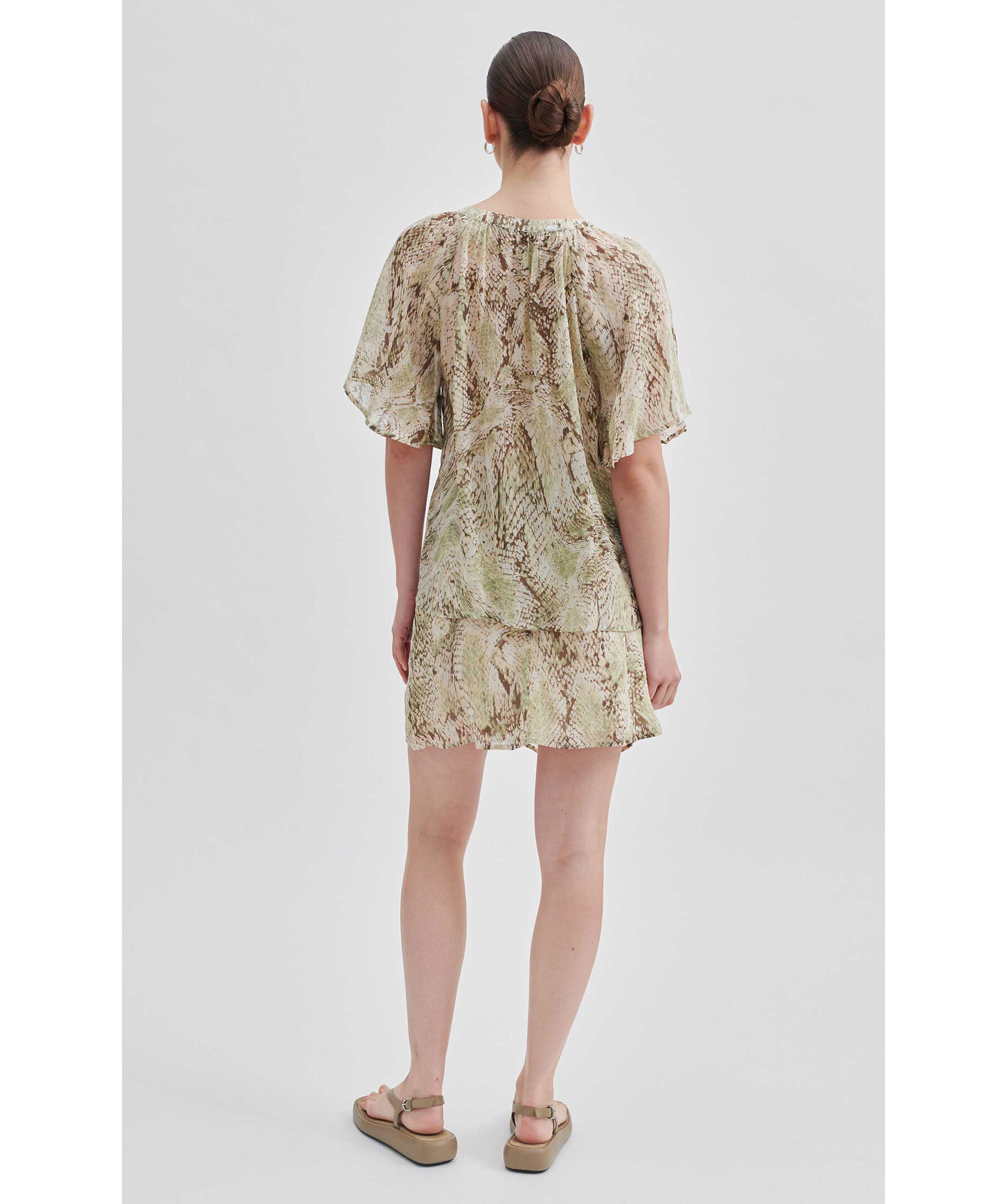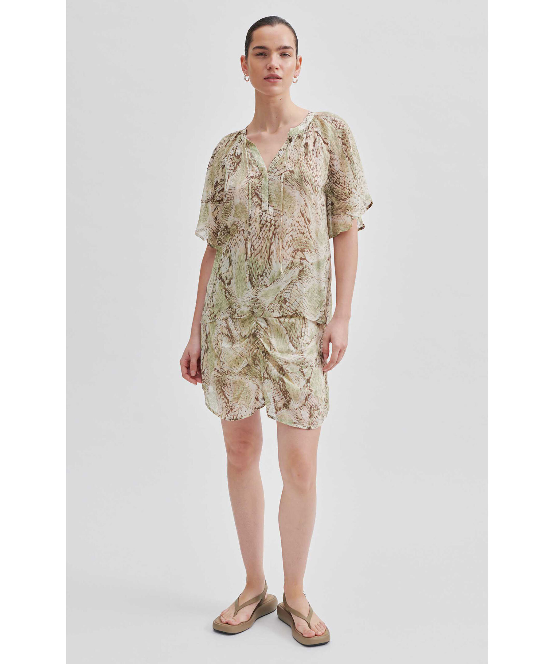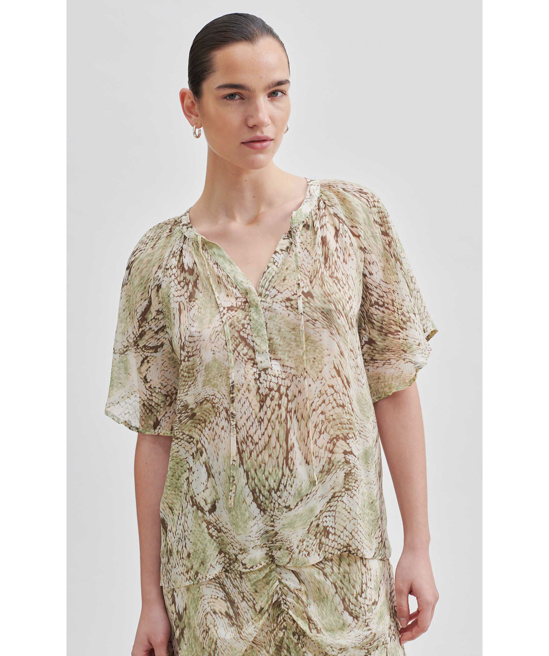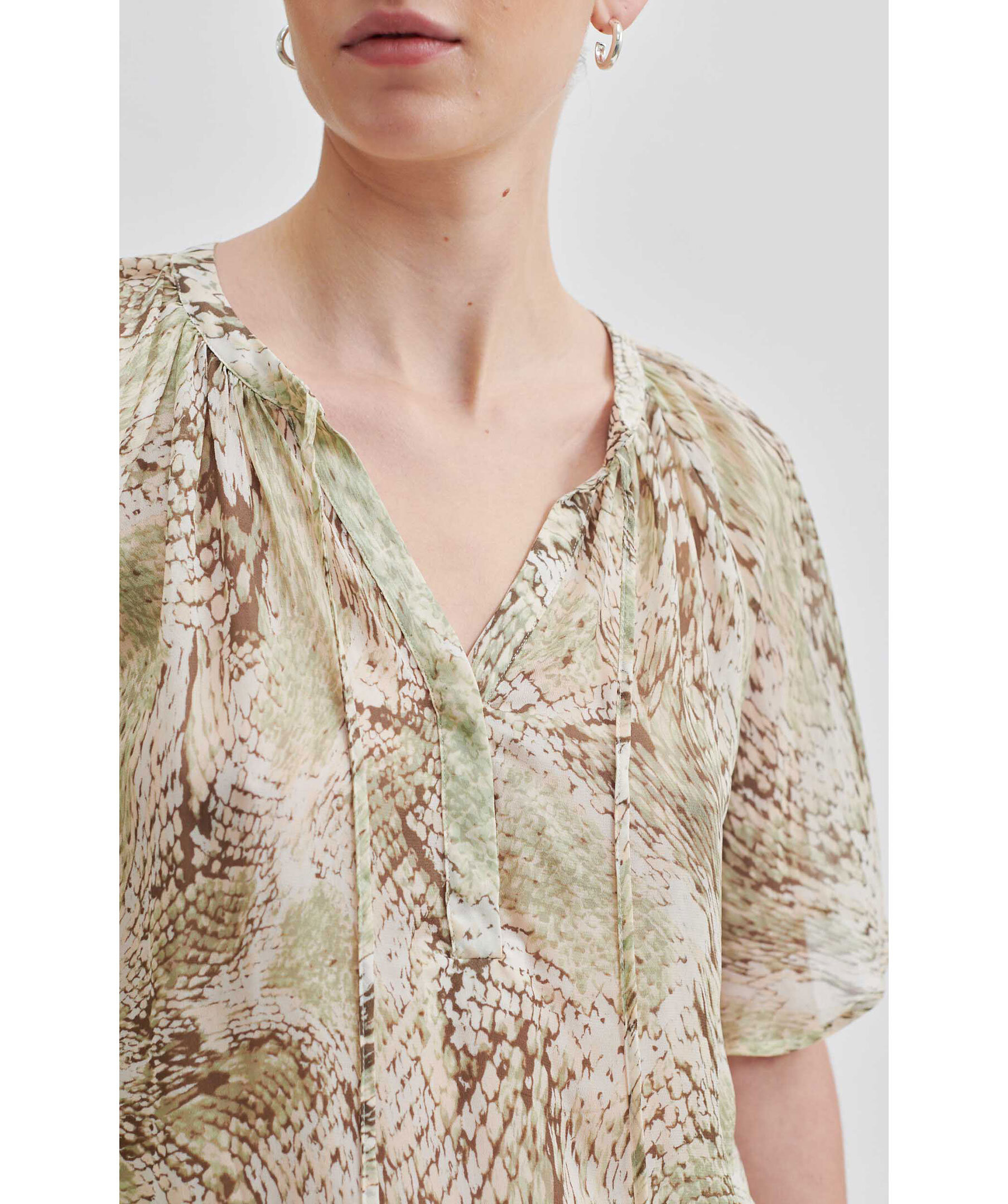 Ljusgrön och brun mönstrad blus från Second Female. Knappslå och snörning vid kragen. Tillverkad i tunn halvtransparent viskos. Volang. och resår detalj vid midjan. Vida ärmar.