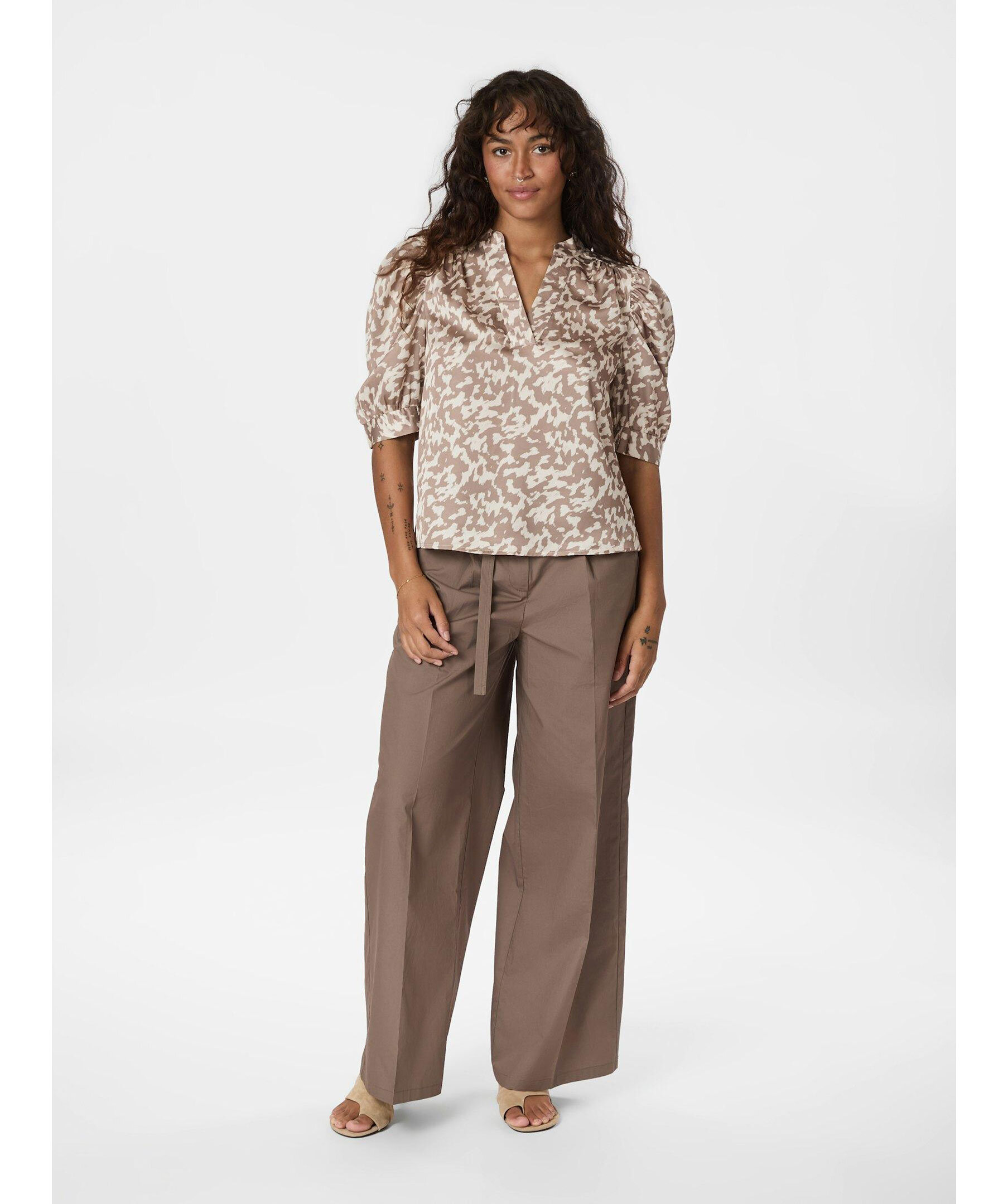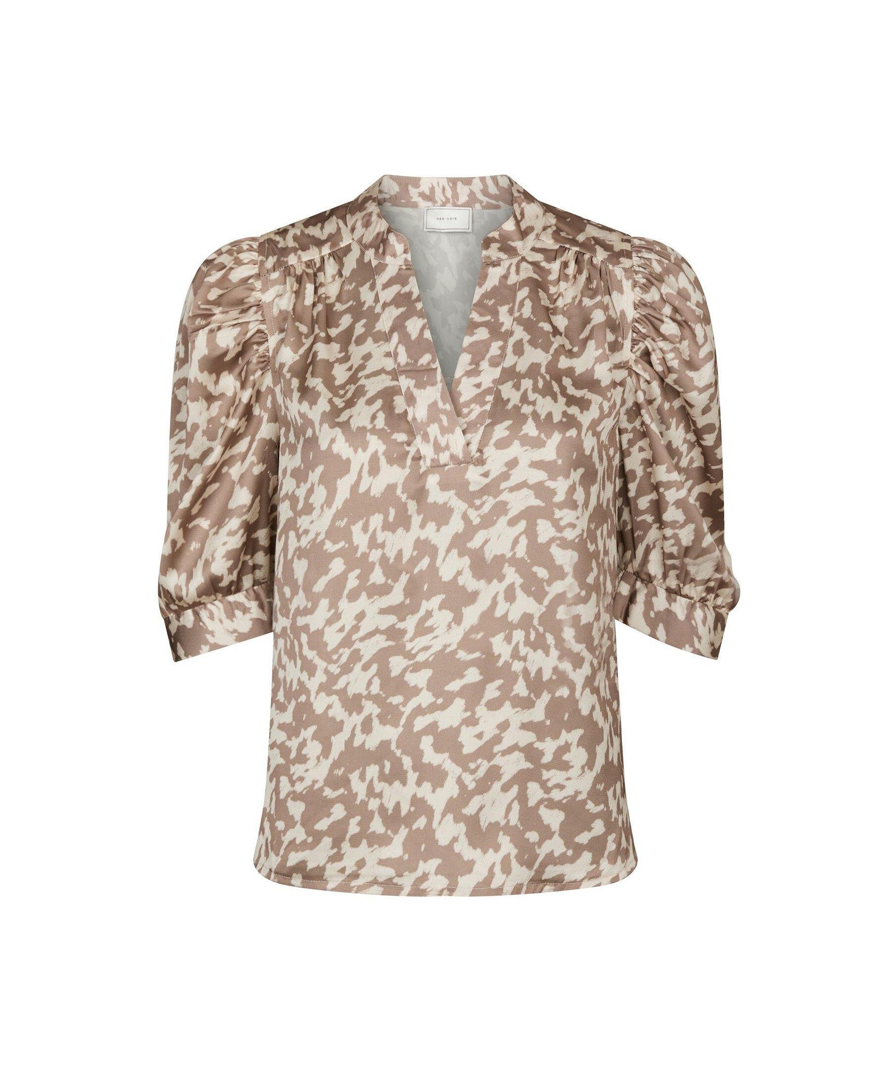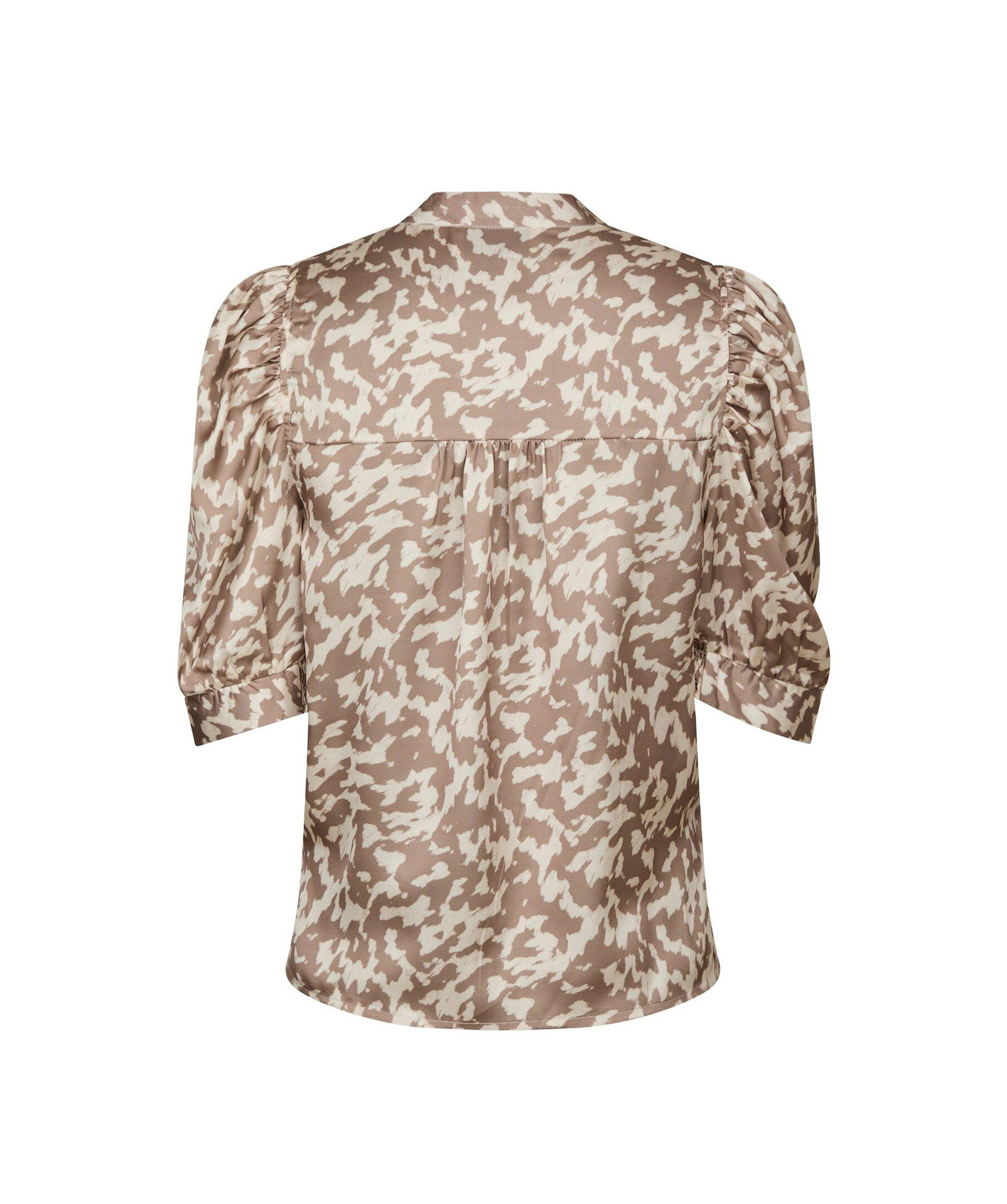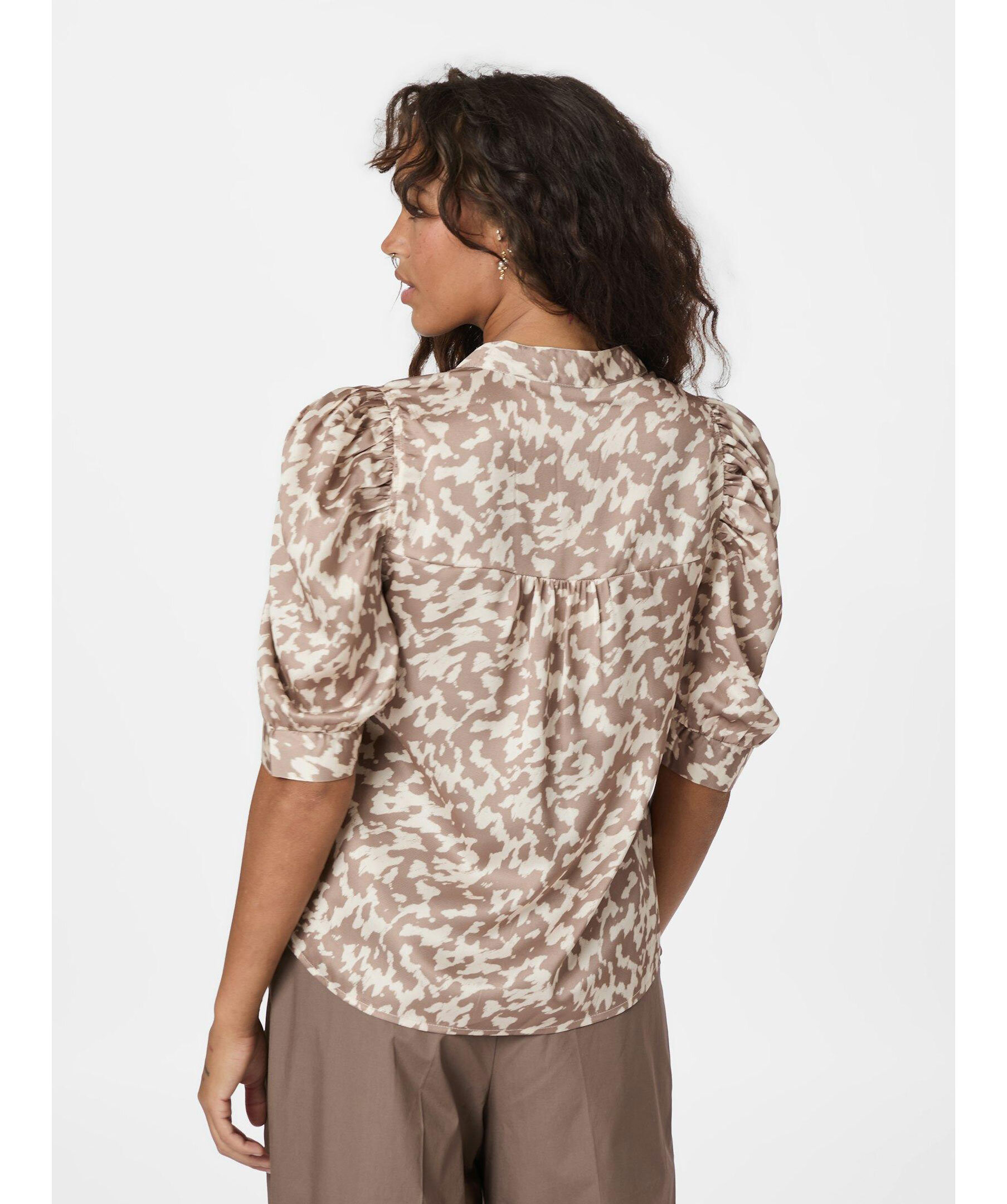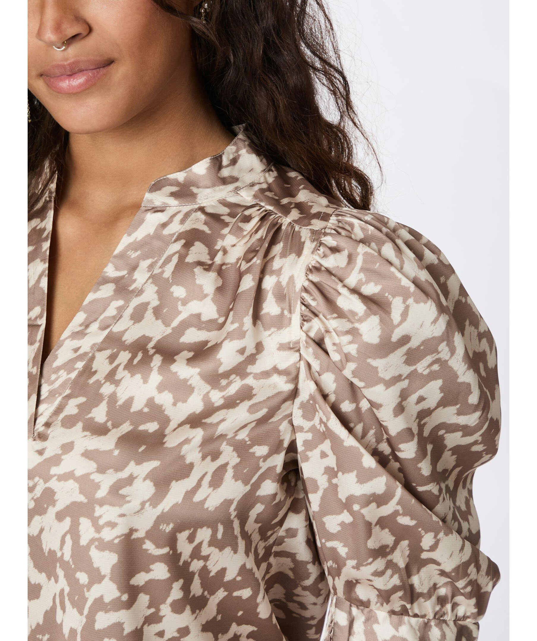 Mönstrad blus från Neo Noir. Abstrakt mönster i beige och vitt som ger ett elegant men lekfullt uttryck. Den är tillverkad i ett glansigt material och har en V-ringning, lätt puffade axlar samt trekvartsärmar med veck och manschett. En mångsidig topp som passar både till kontoret och till middagen.
