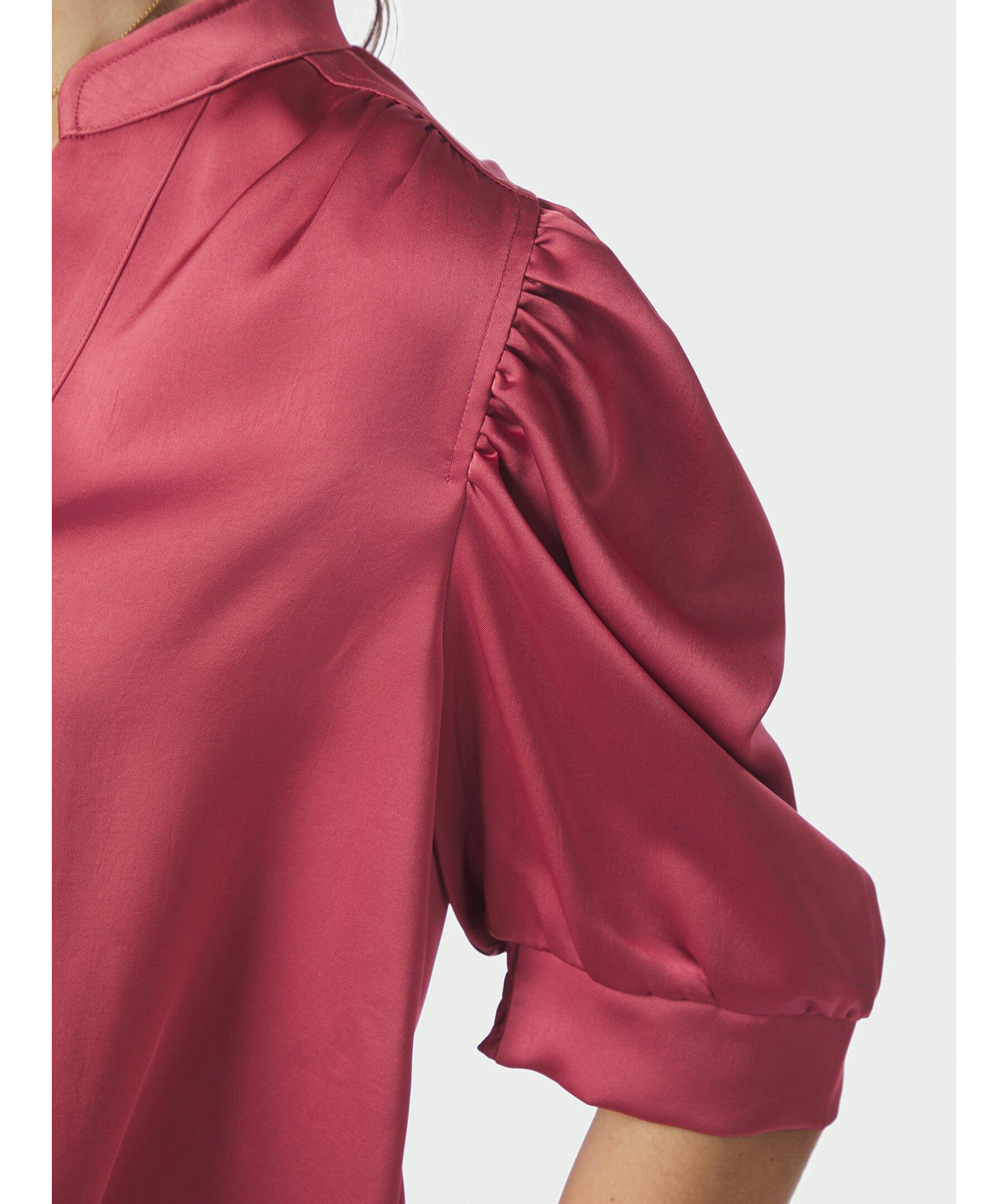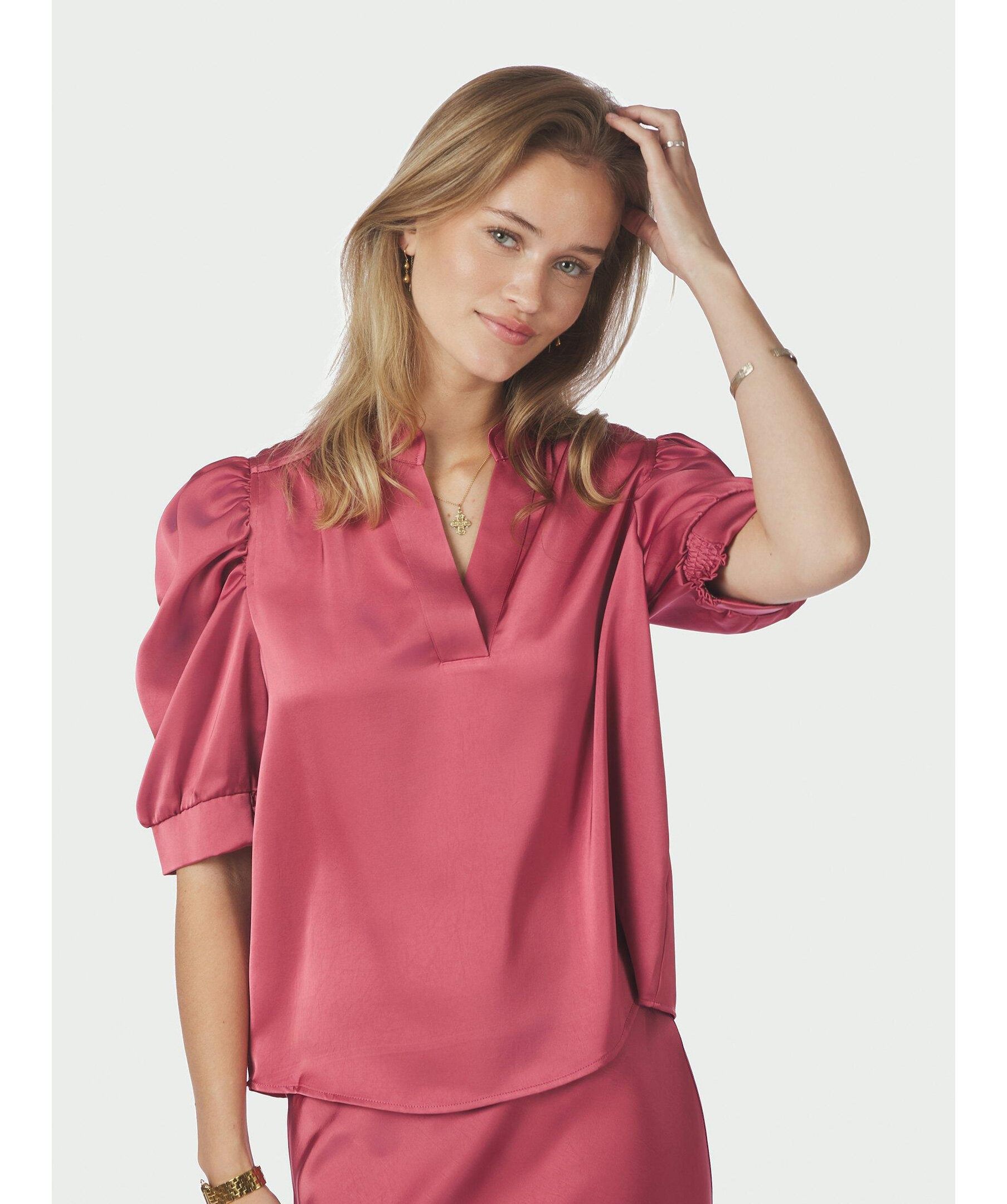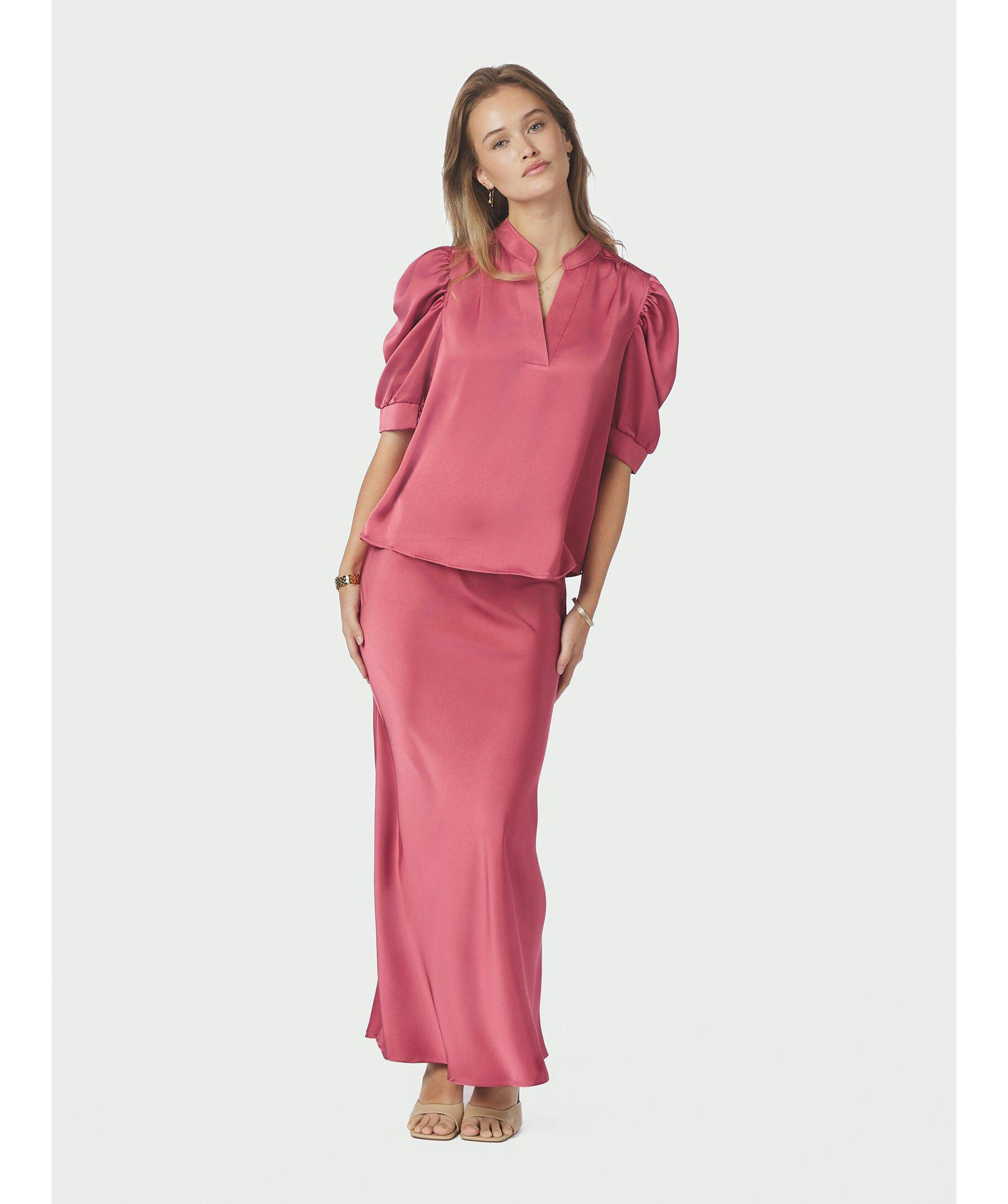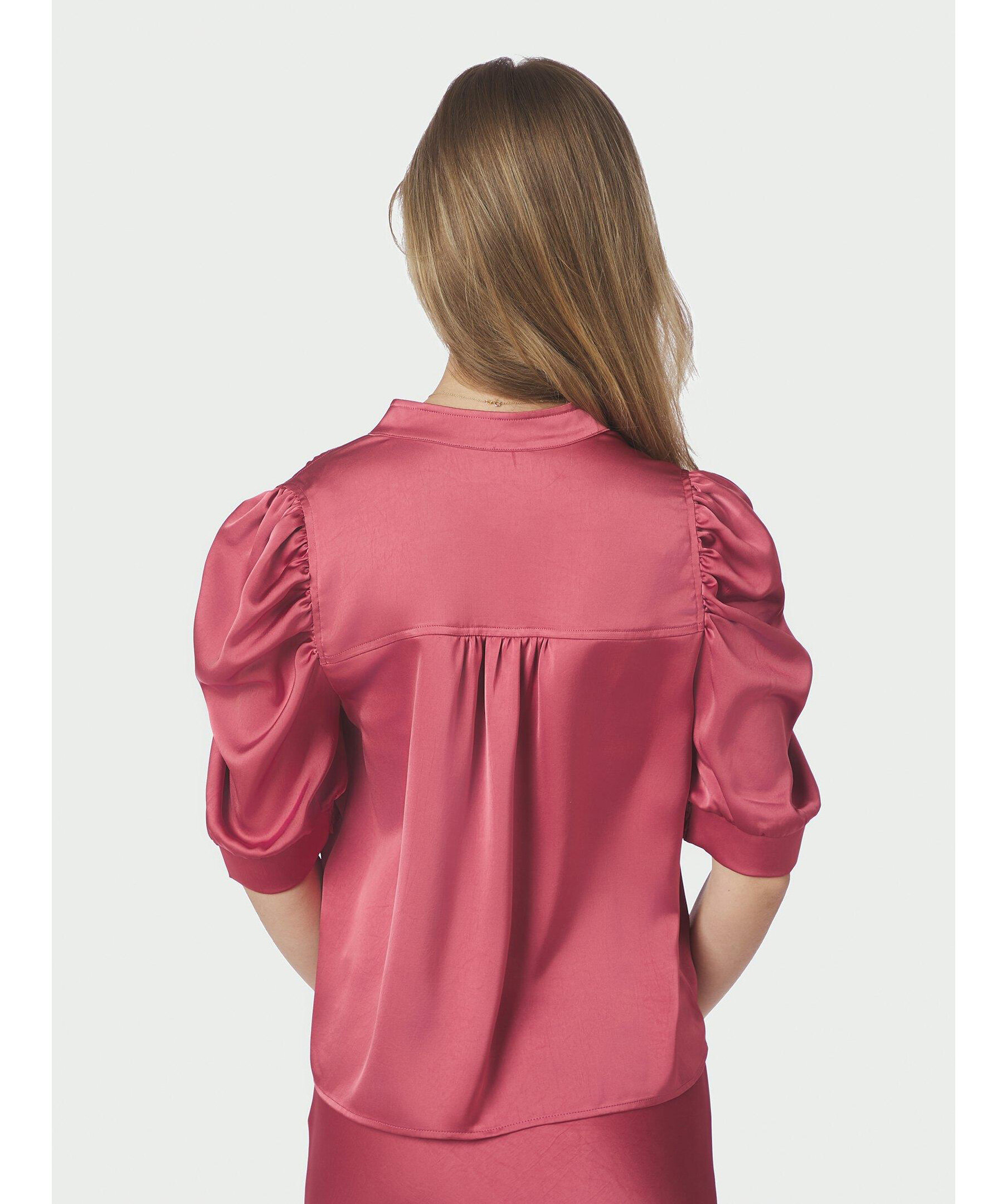 Rosa satinblus från Neo Noir. Tillverkad i ett tungt satängtyg som ger en lyxig känsla. Den har en rak passform, korta puffärmar och en diskret ståkrage. Perfekt för både vardag och fest. Tillverkad i 97 % polyester och 3 % elastan.