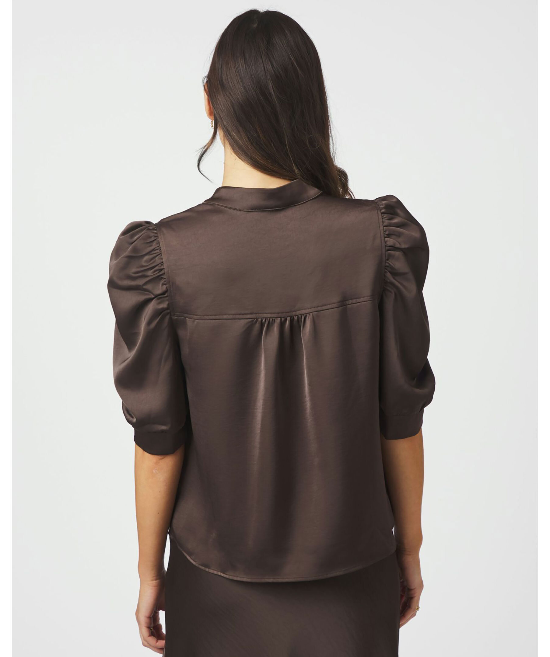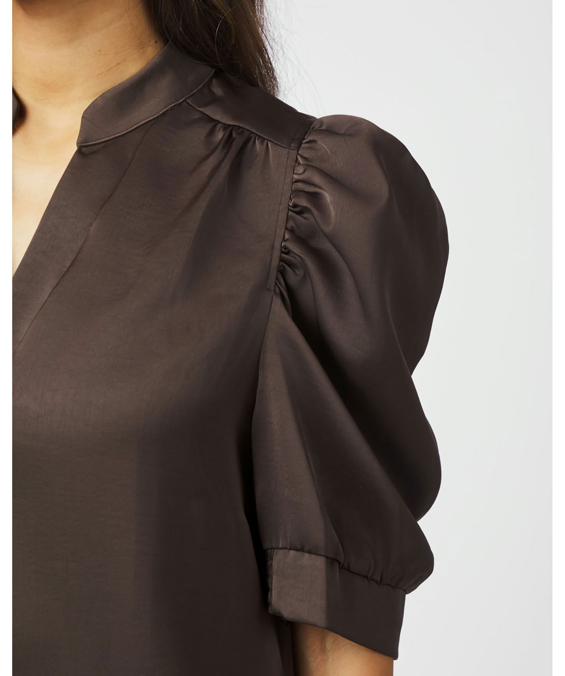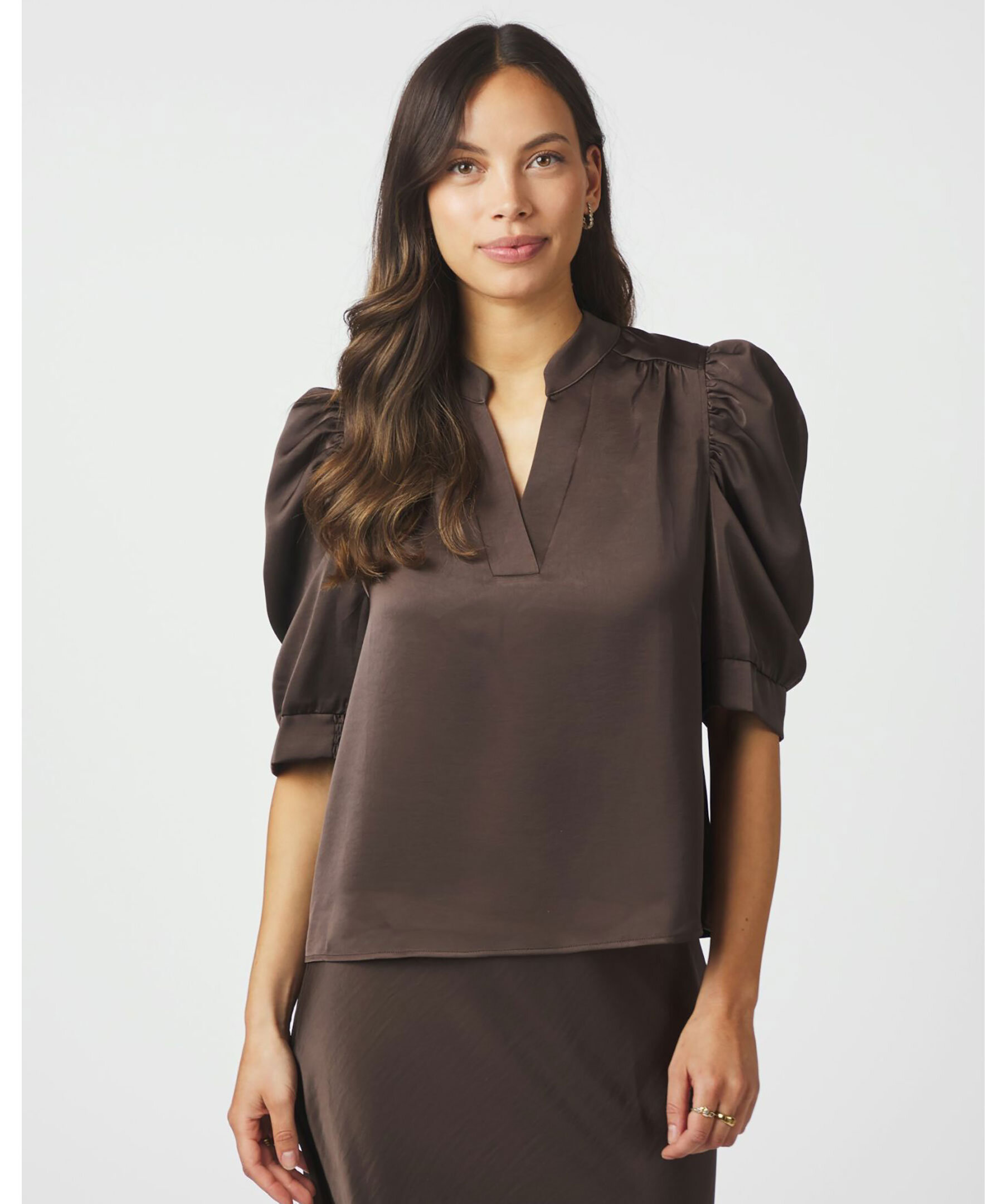 Roella Heavy Sateen Blouse från Neo Noir är en elegant blus i mörkbrun färg, tillverkad i ett tungt satängtyg som ger en lyxig känsla. Den har en rak passform, korta puffärmar och en diskret ståkrage. Perfekt för både vardag och fest. Tillverkad i 97 % polyester och 3 % elastan.