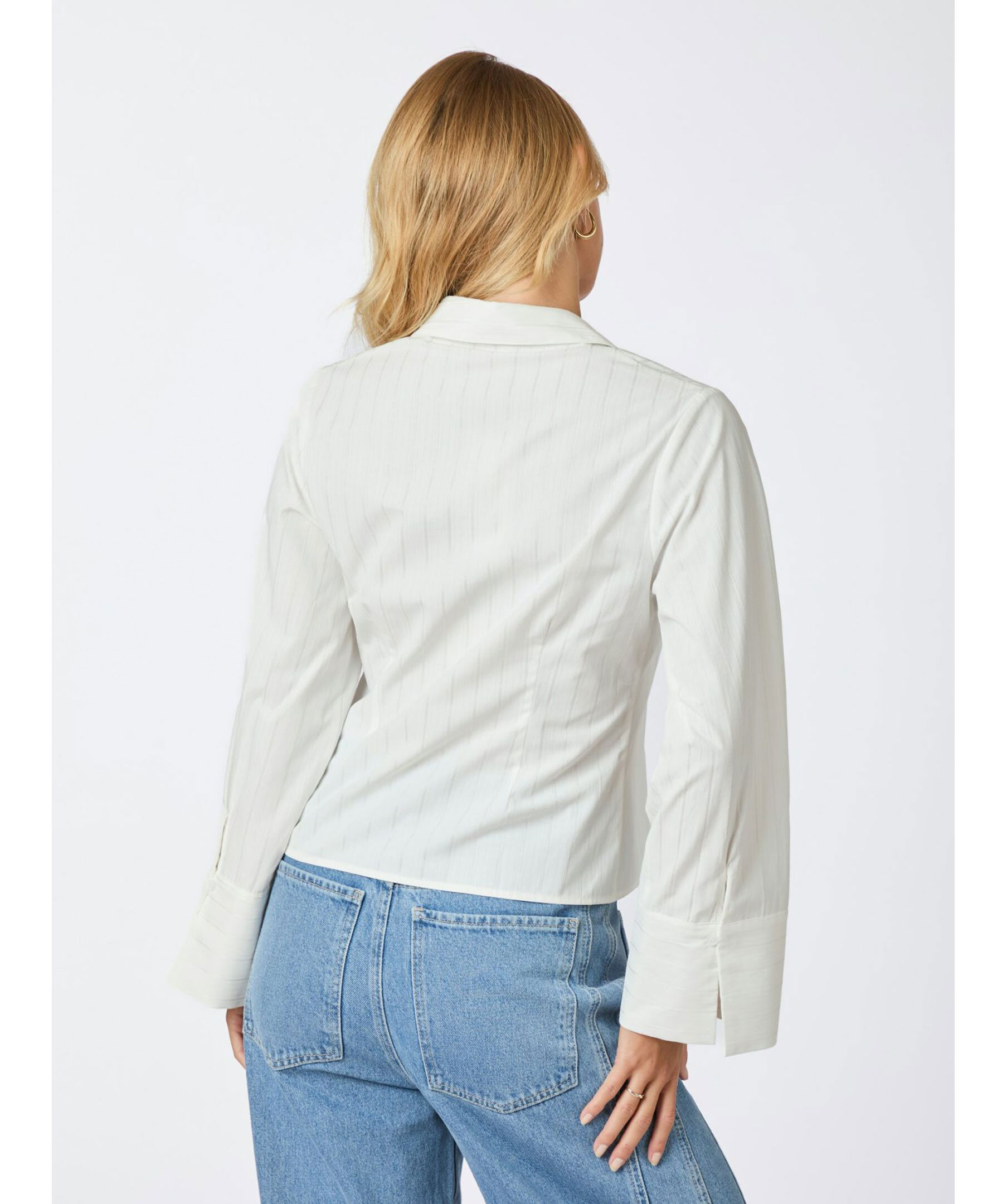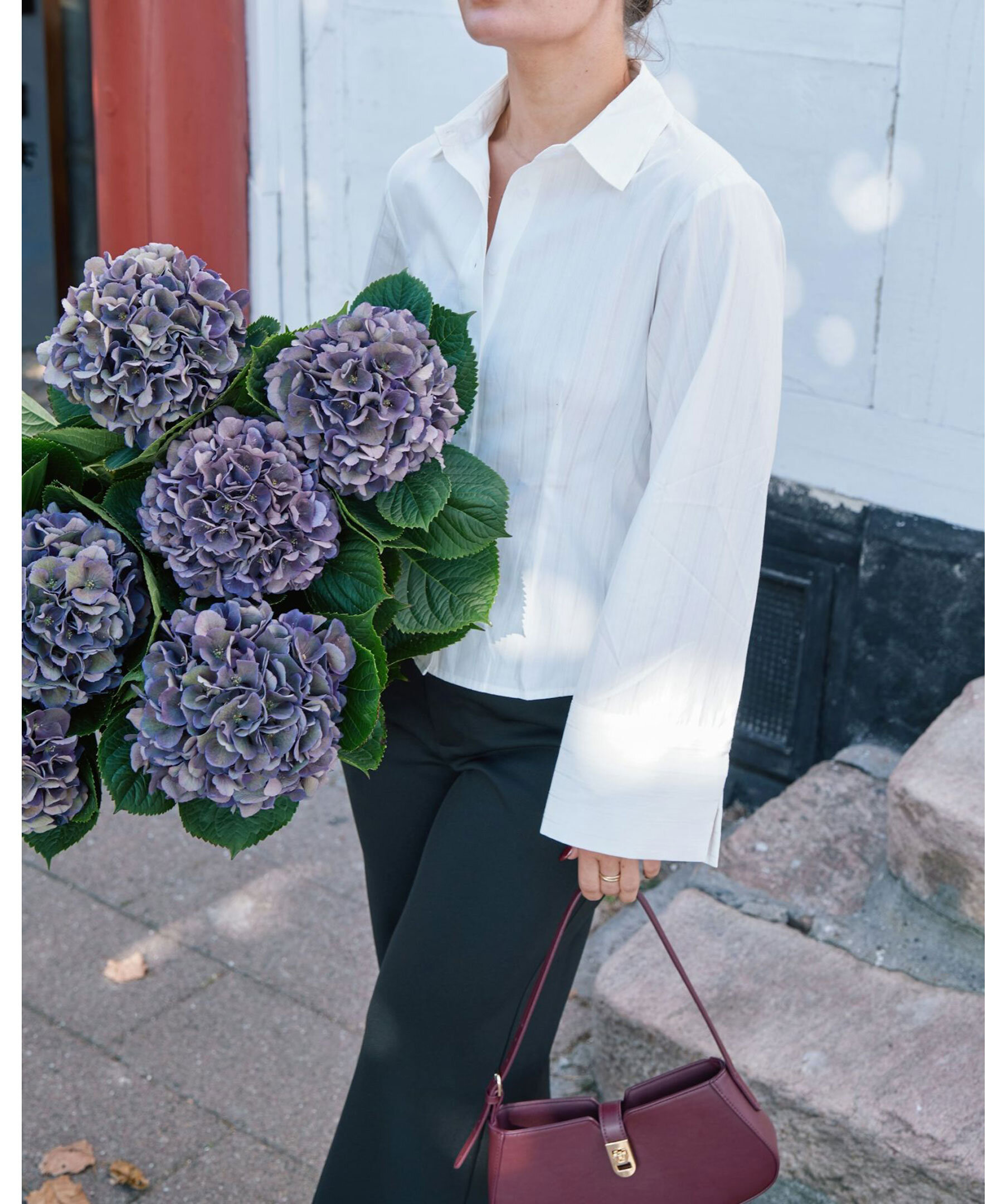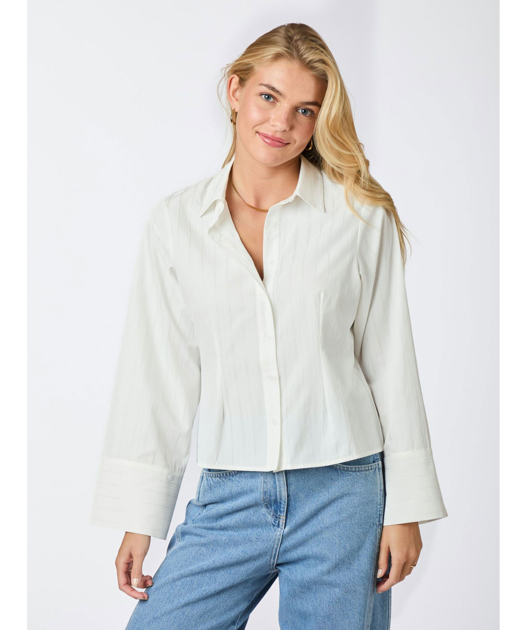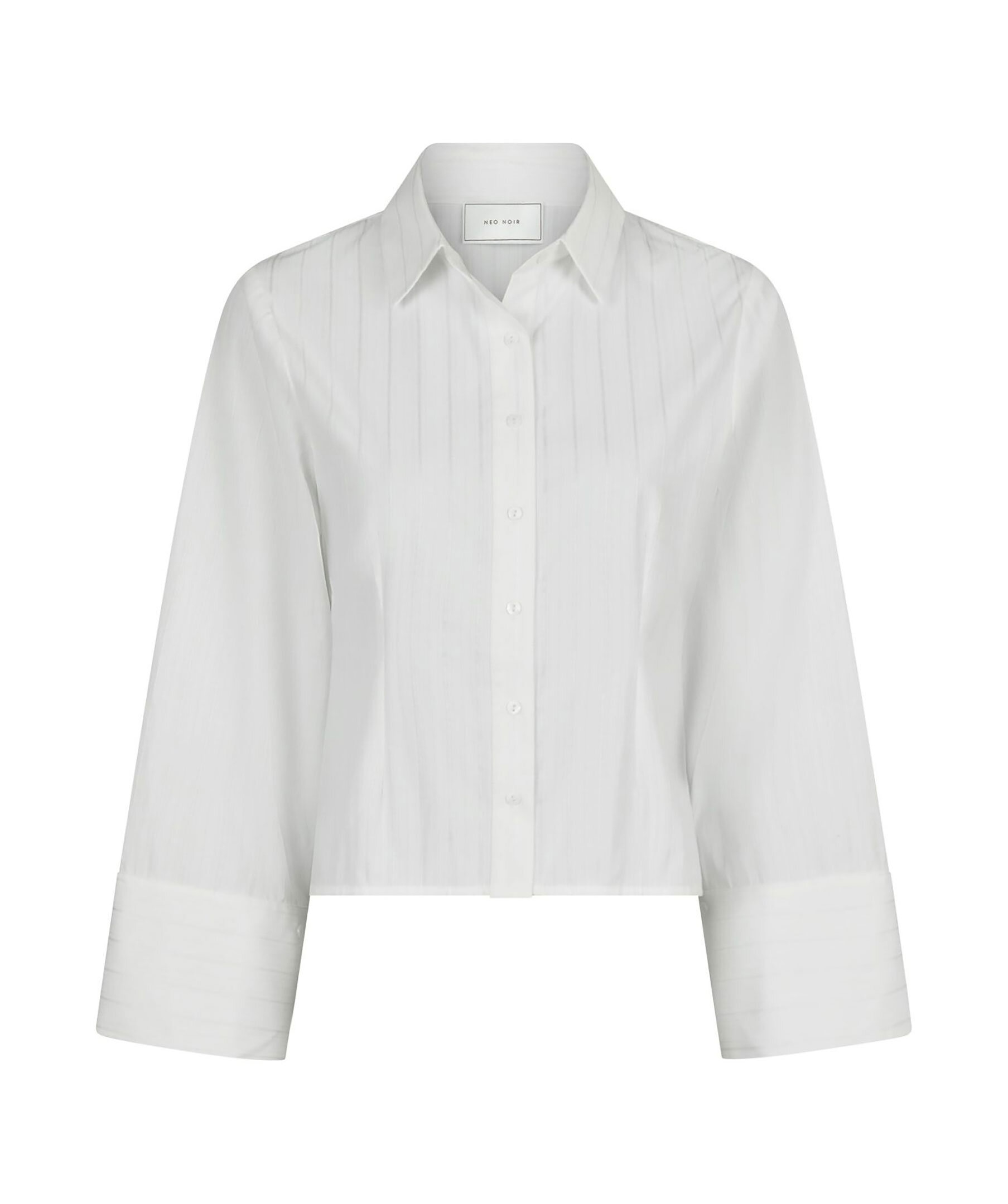 Vit figursydd skjorta från Neo Noir. Skjortan har vida ärmar och mudd. Modellen är 176 cm och bär storlek 36.