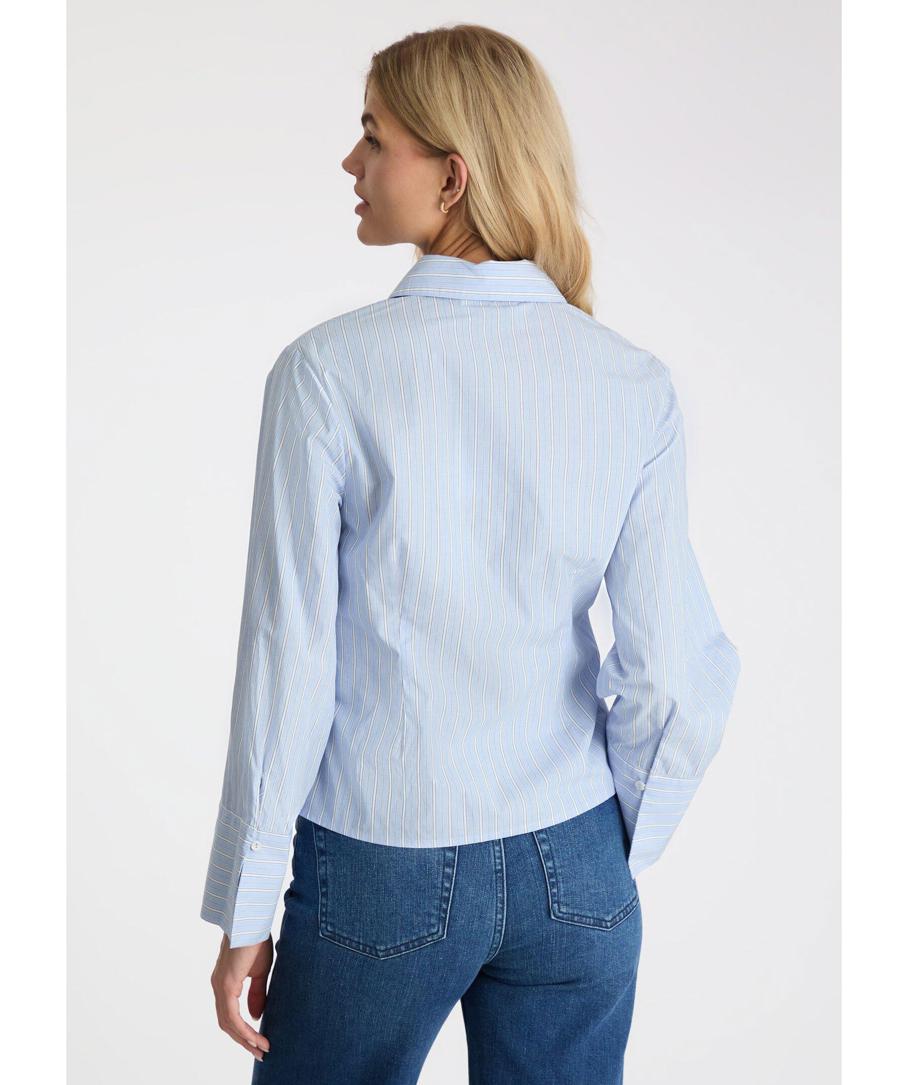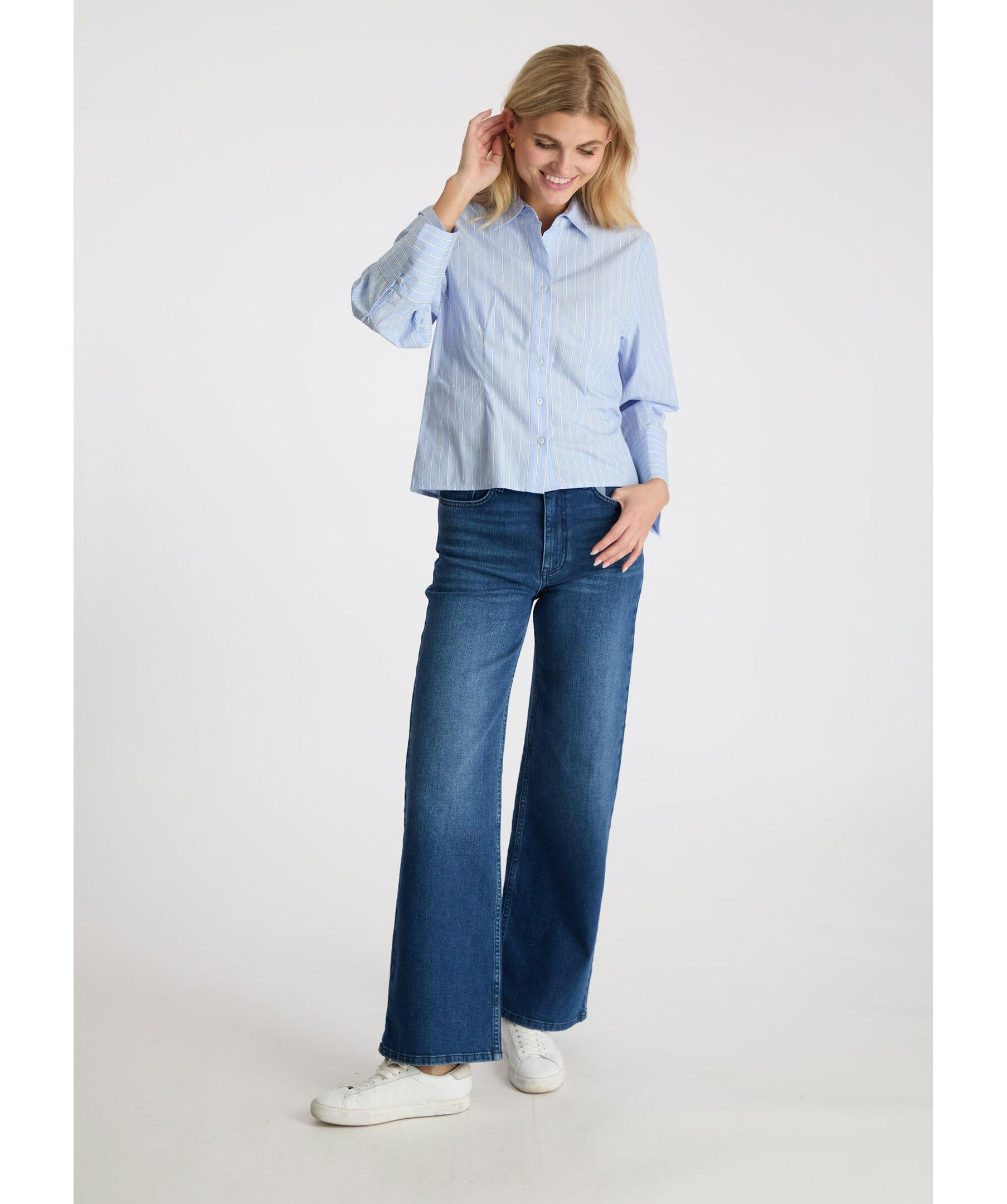 Ljusblå, randig skjorta från Neo Noir. Skjortan är något croppad i längden och har button-down krage samt vida ärmar. Tillverkad i bomull.