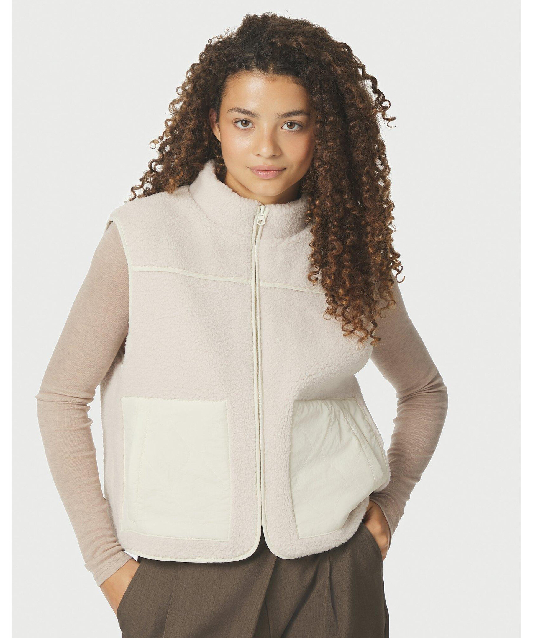 Vit kort väst i en fin och mjuk teddy-kvalitet. Vesten har även dragkedja, en kontrastficka och liten krage.