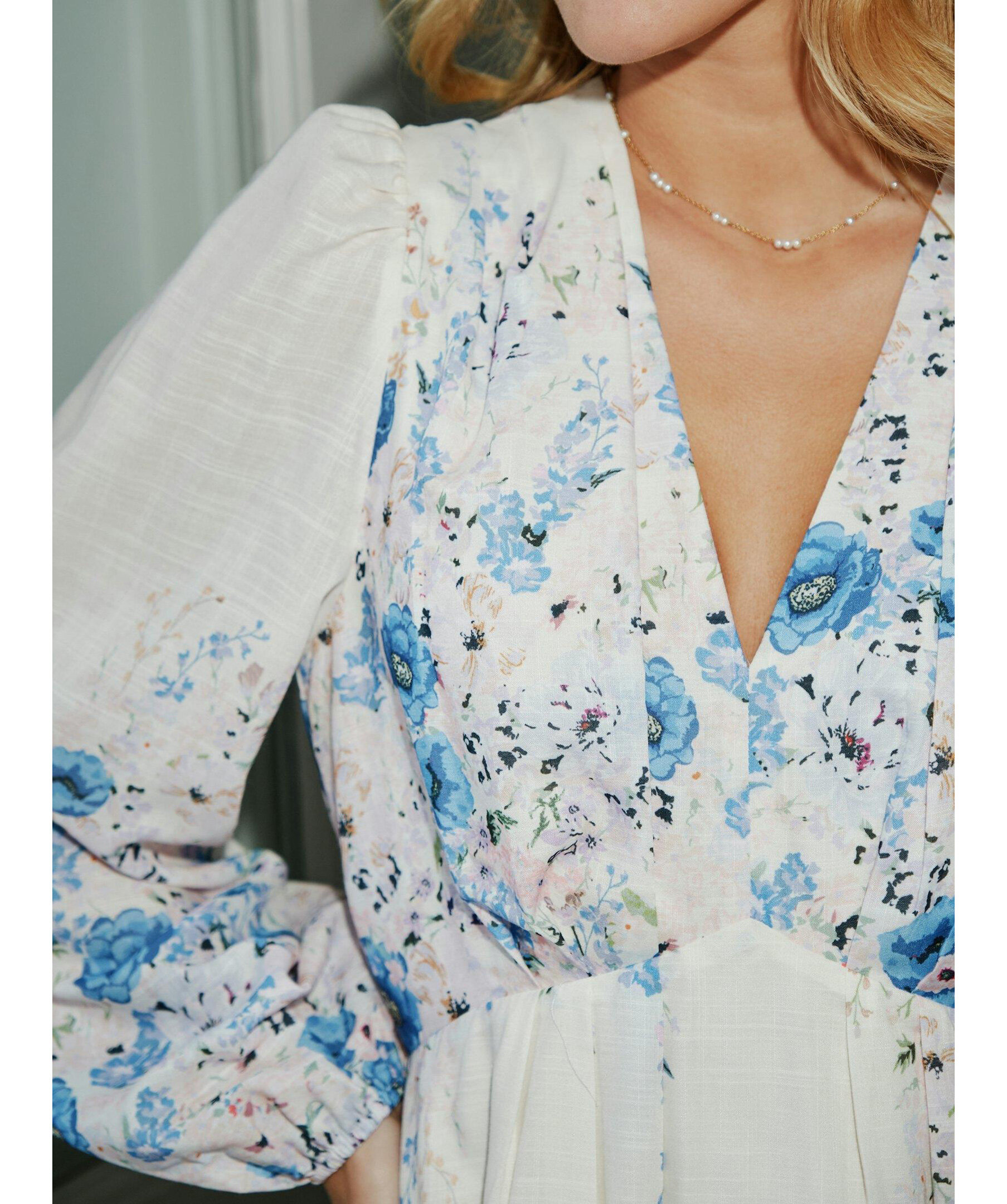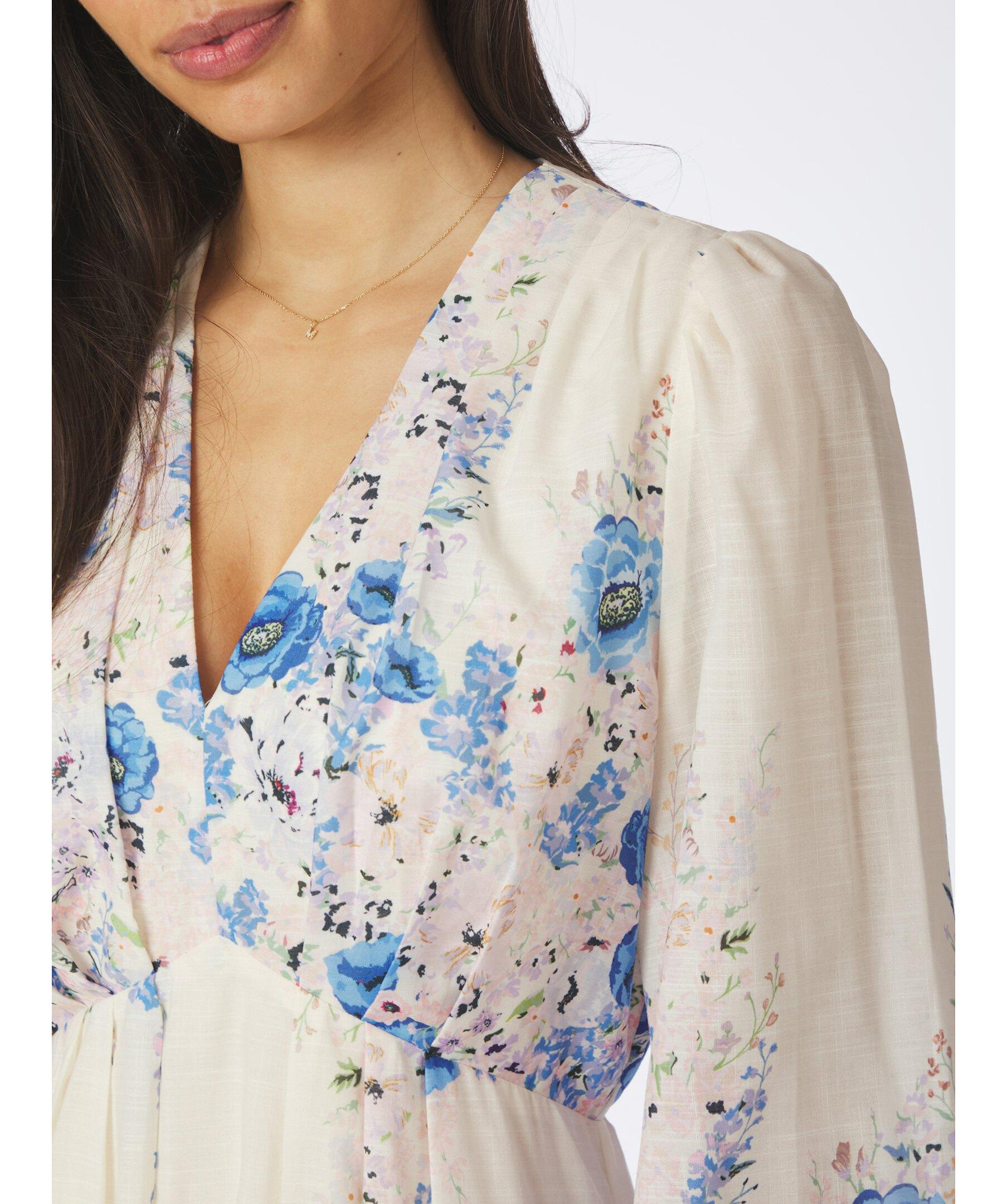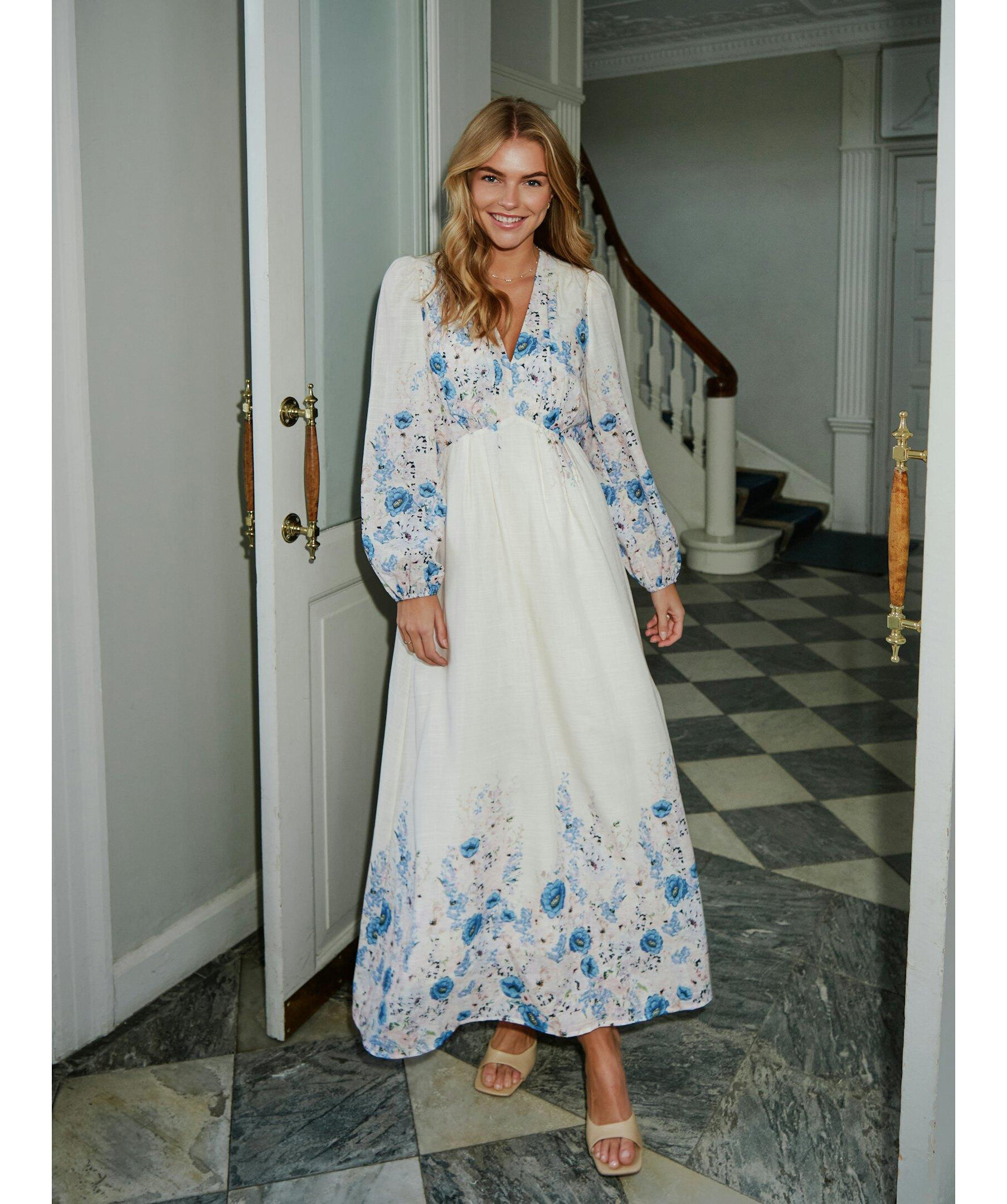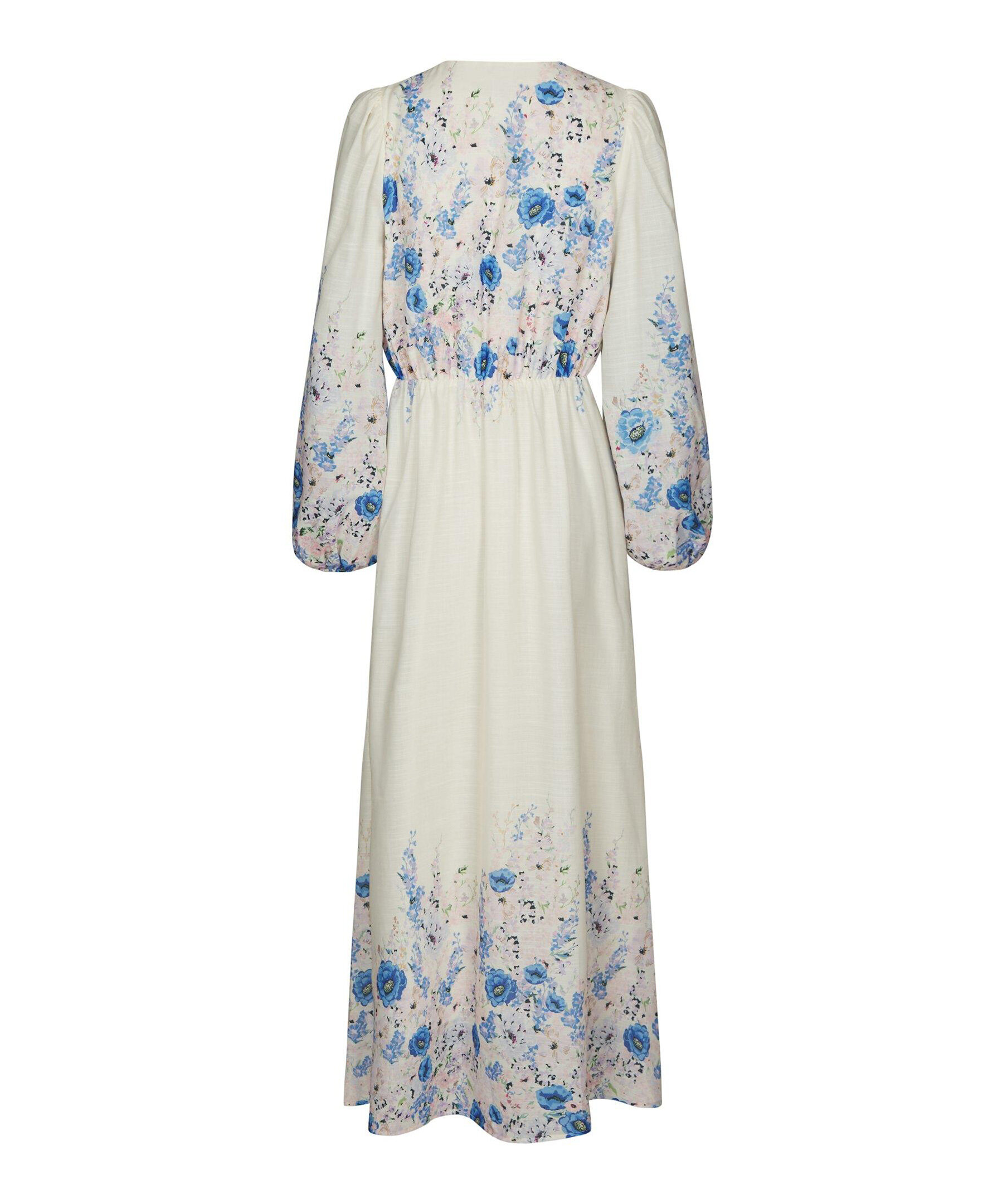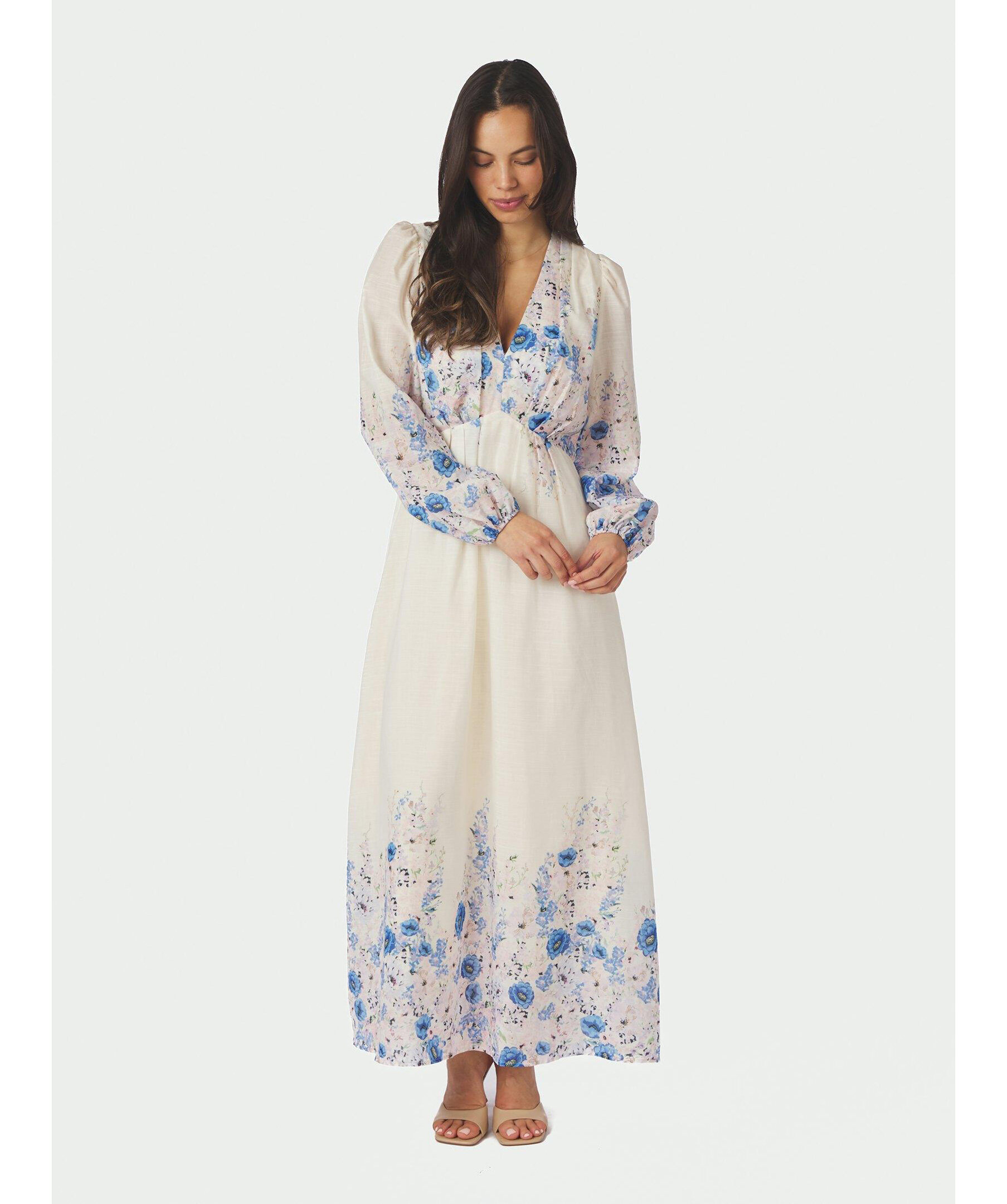 Maxiklänning i en härlig blommig print. Klänningen har en avslappnad men ändå feminin passform. Ärmarna är långa och avslutade med resår. Modellen är 176 cm lång och bär storlek 36.