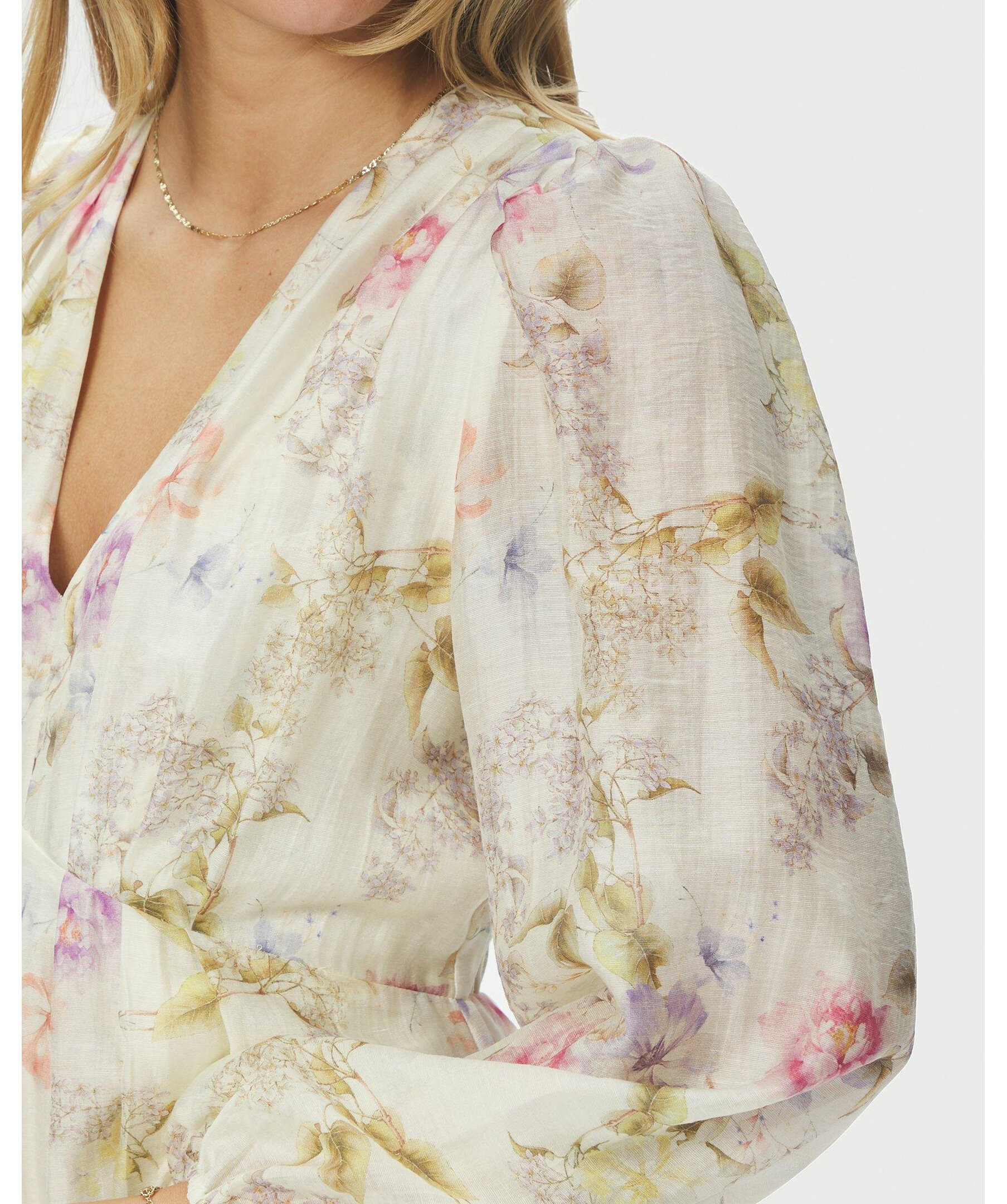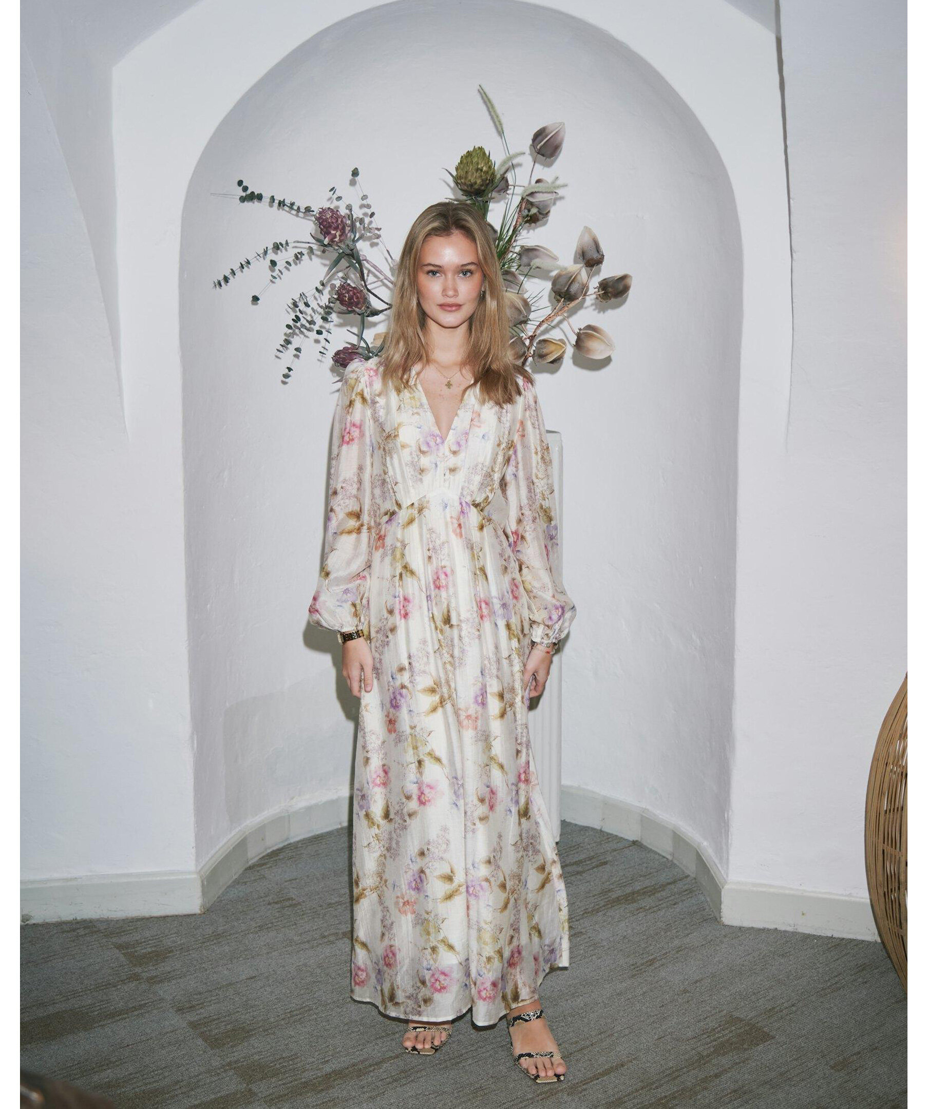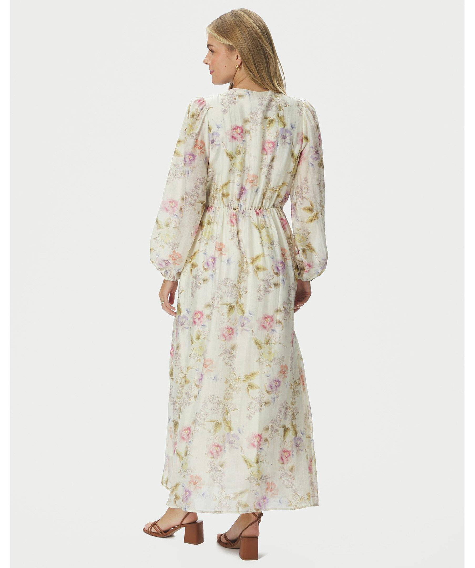 Blommig maxiklänning. Klänningen har en avslappnad men ändå feminin passform. Ärmarna är långa och avslutade med elastik. Modellen är 176 cm lång och bär storlek 36.