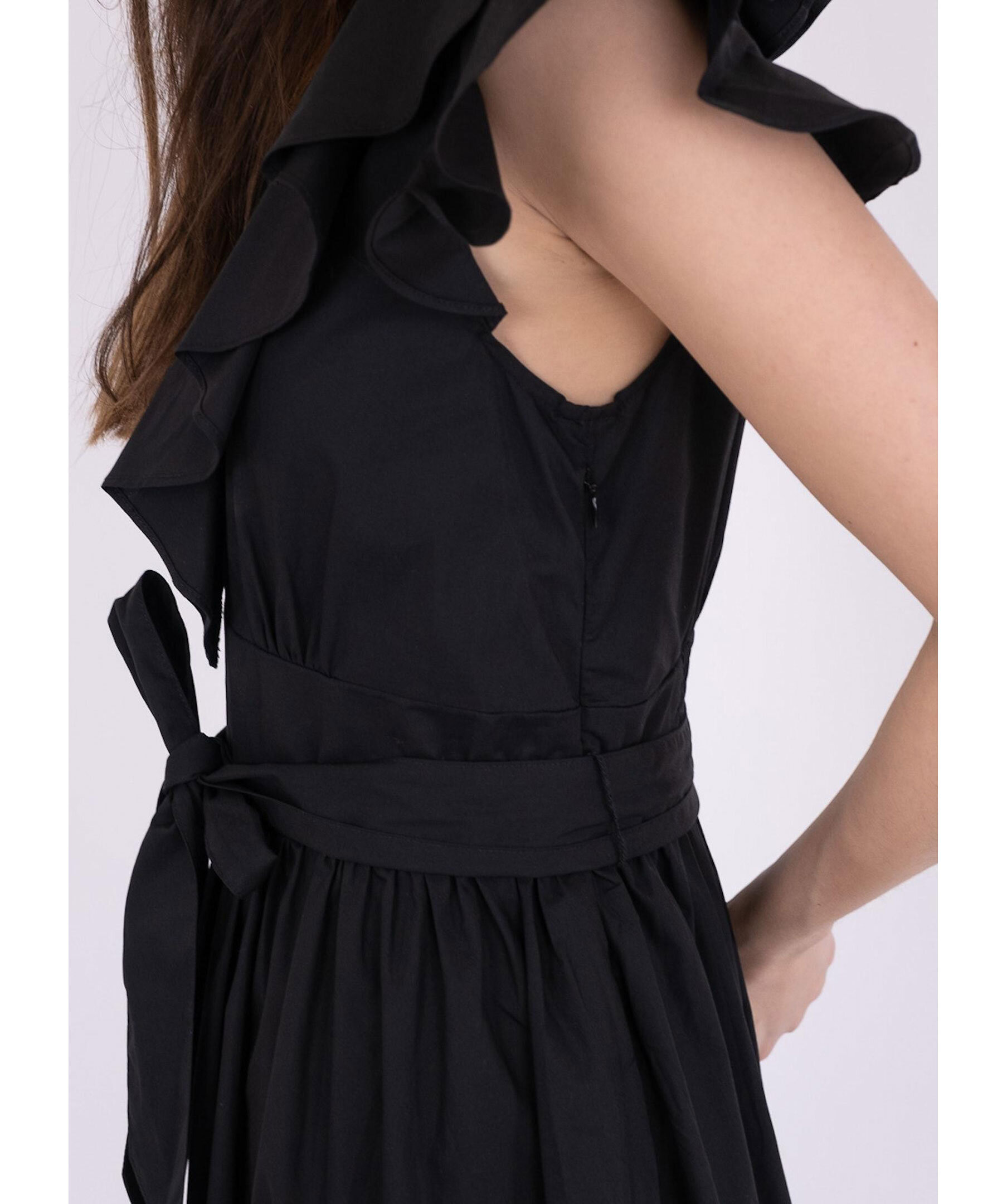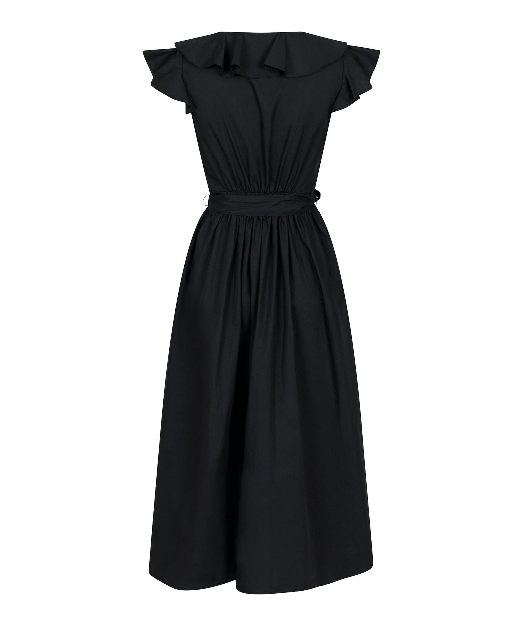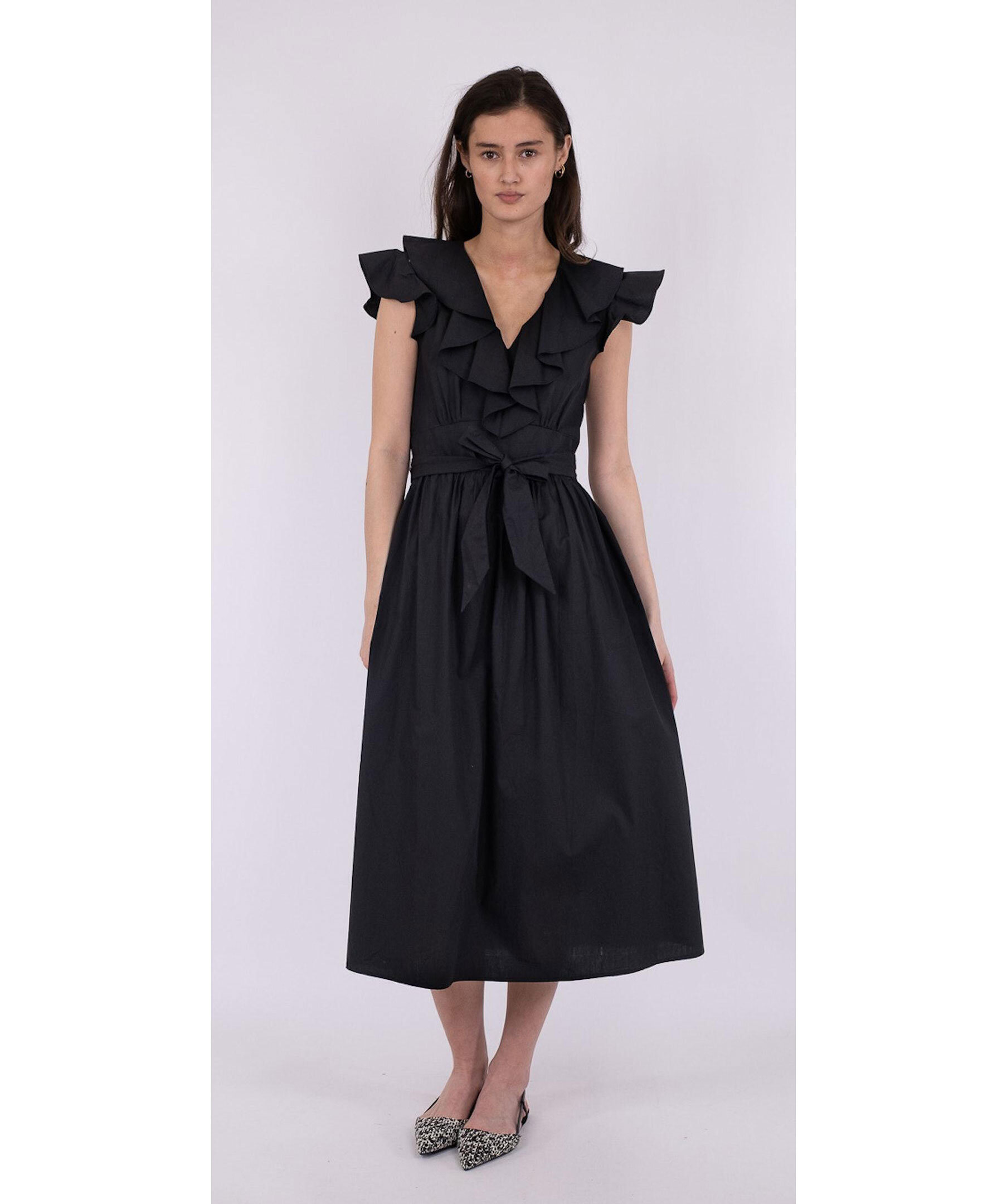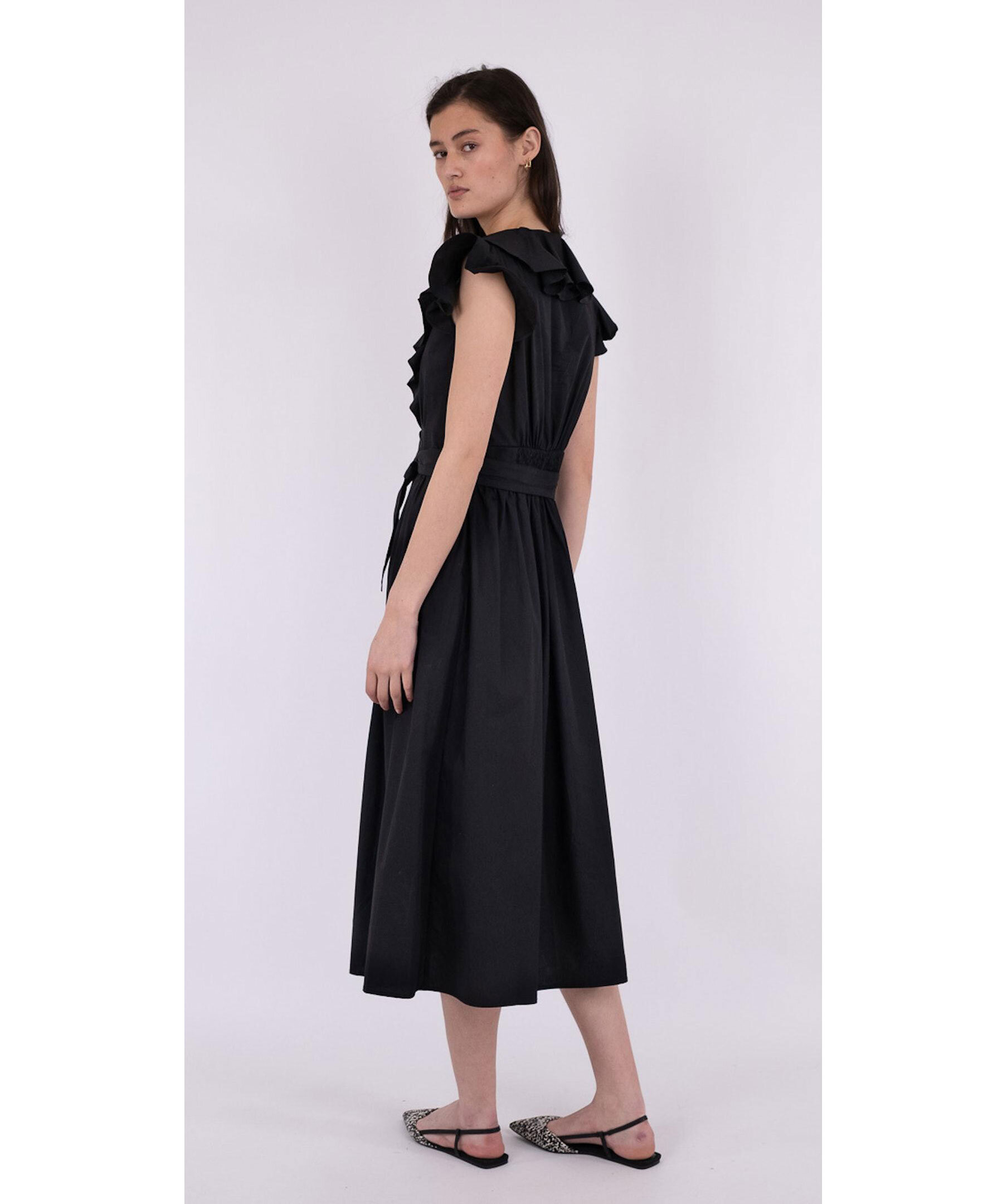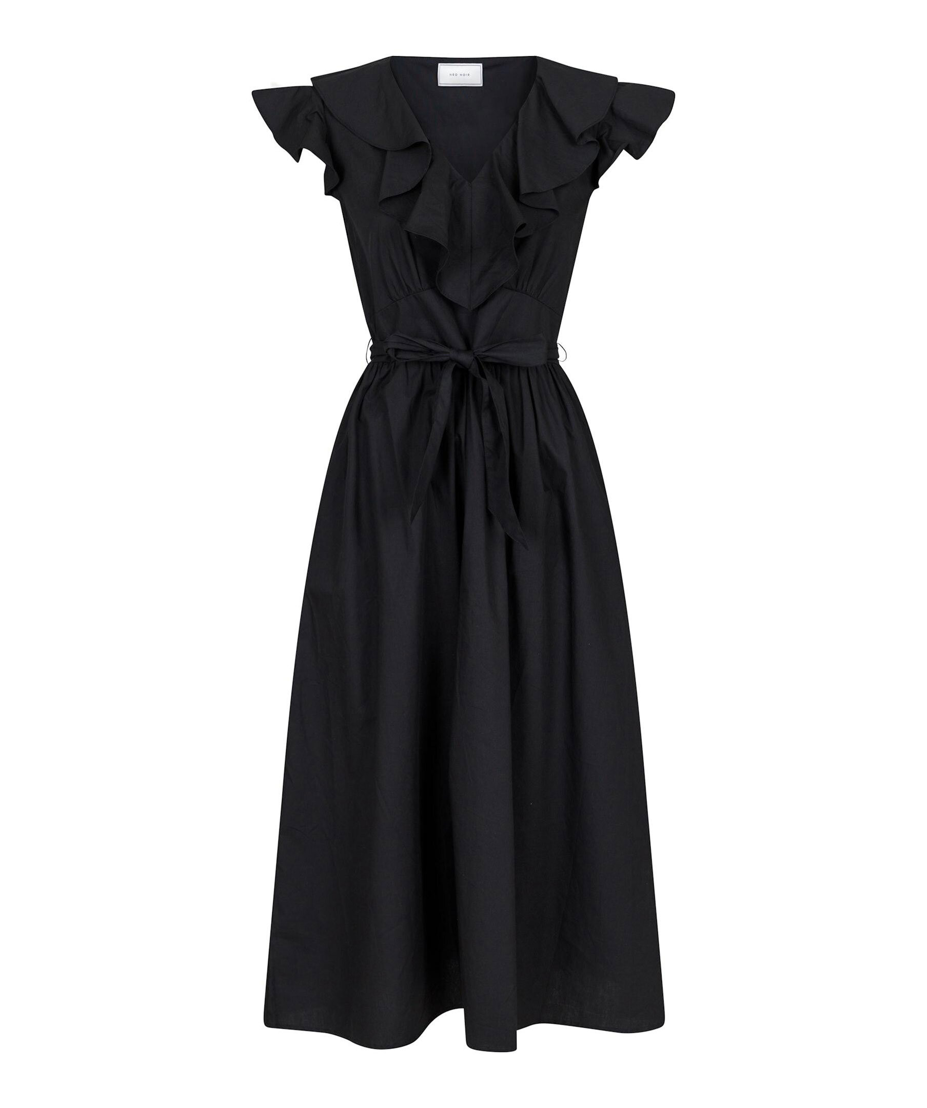 Svart klänning från Neo Noir. Volanger vid kragen och ärmslut, V-ringad halsringning. Band som knyts i midjan. Klänningen slutar strax över knäna. Tillverkad i Bomullsblandning.