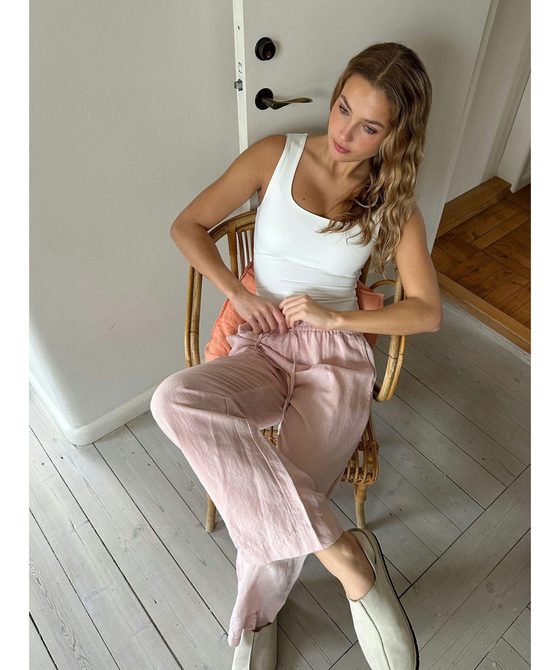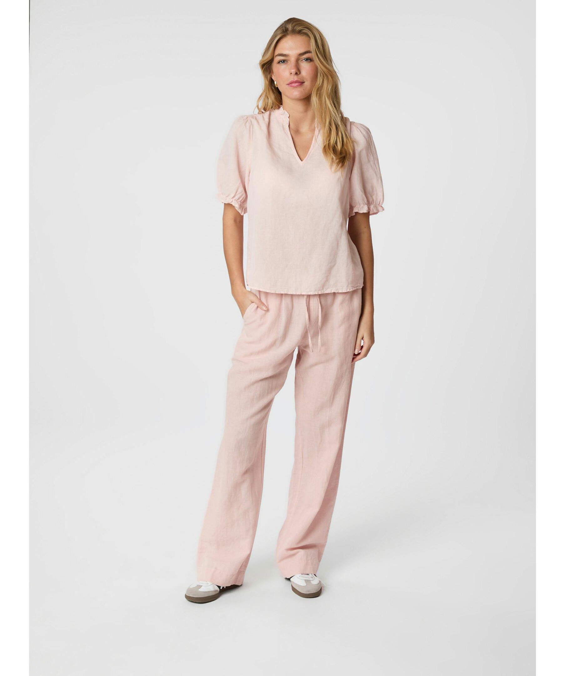 Linnebyxor i en rosa färg från Neo Noir. Resår och dragsko i midjan samt två sidfickor. Tillverkade i en linneblandning.