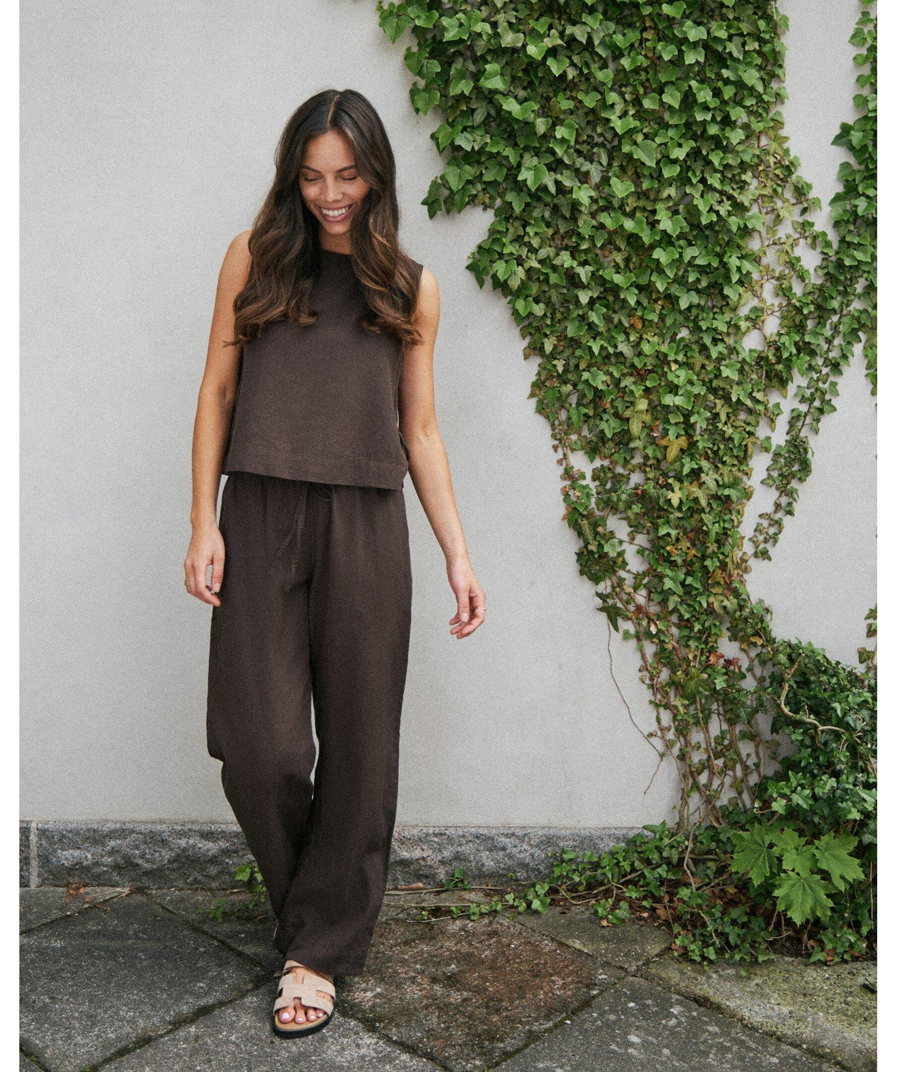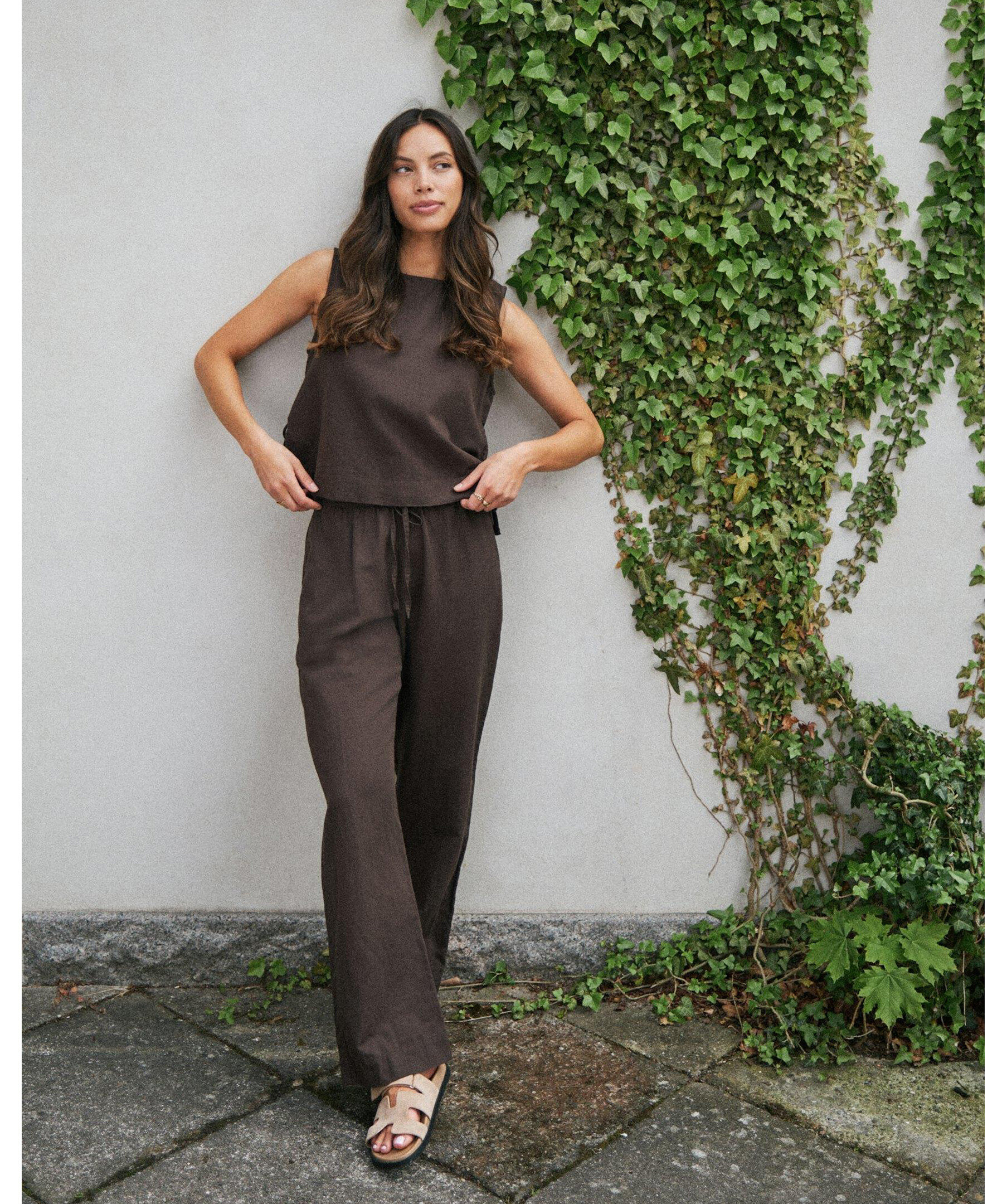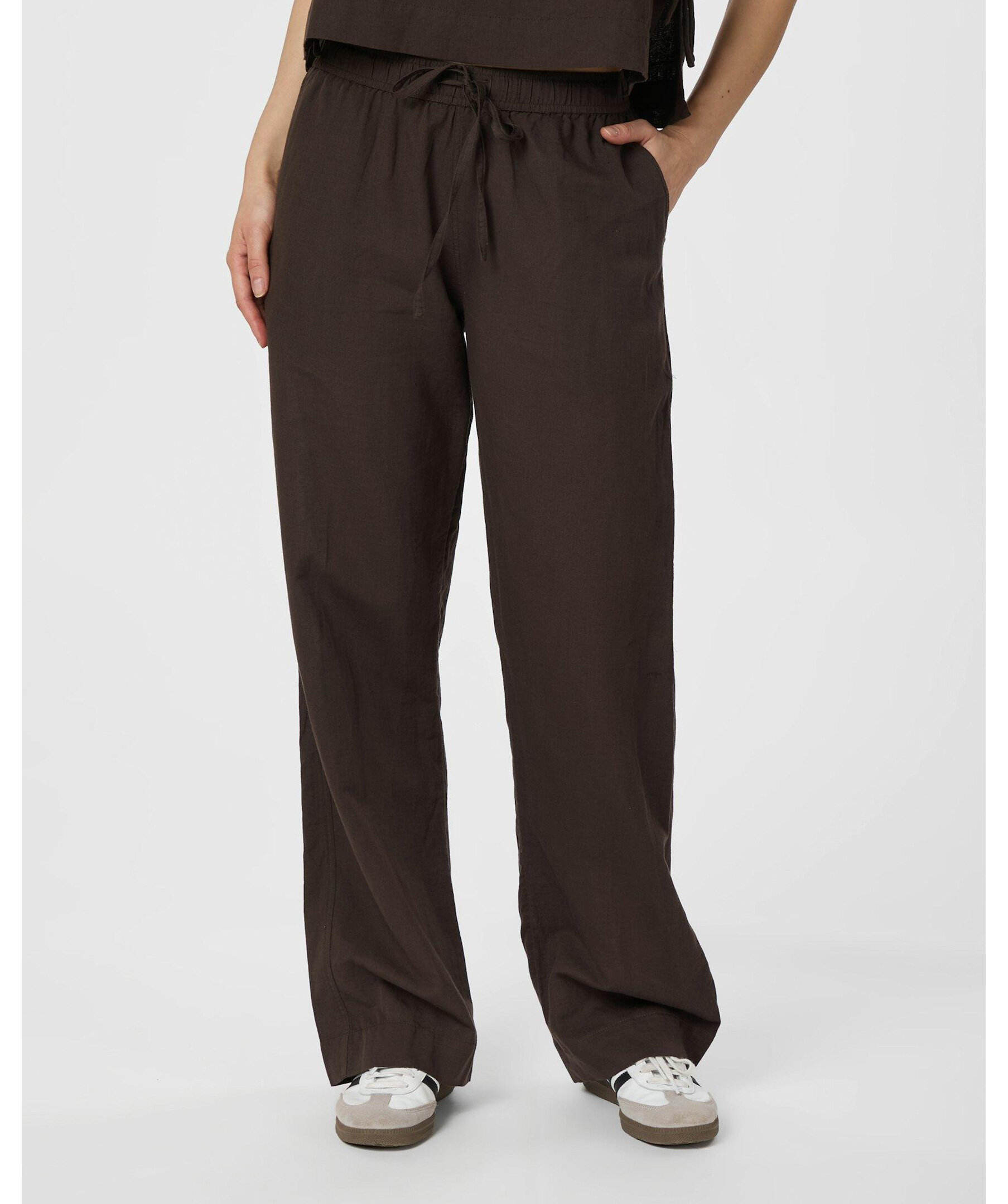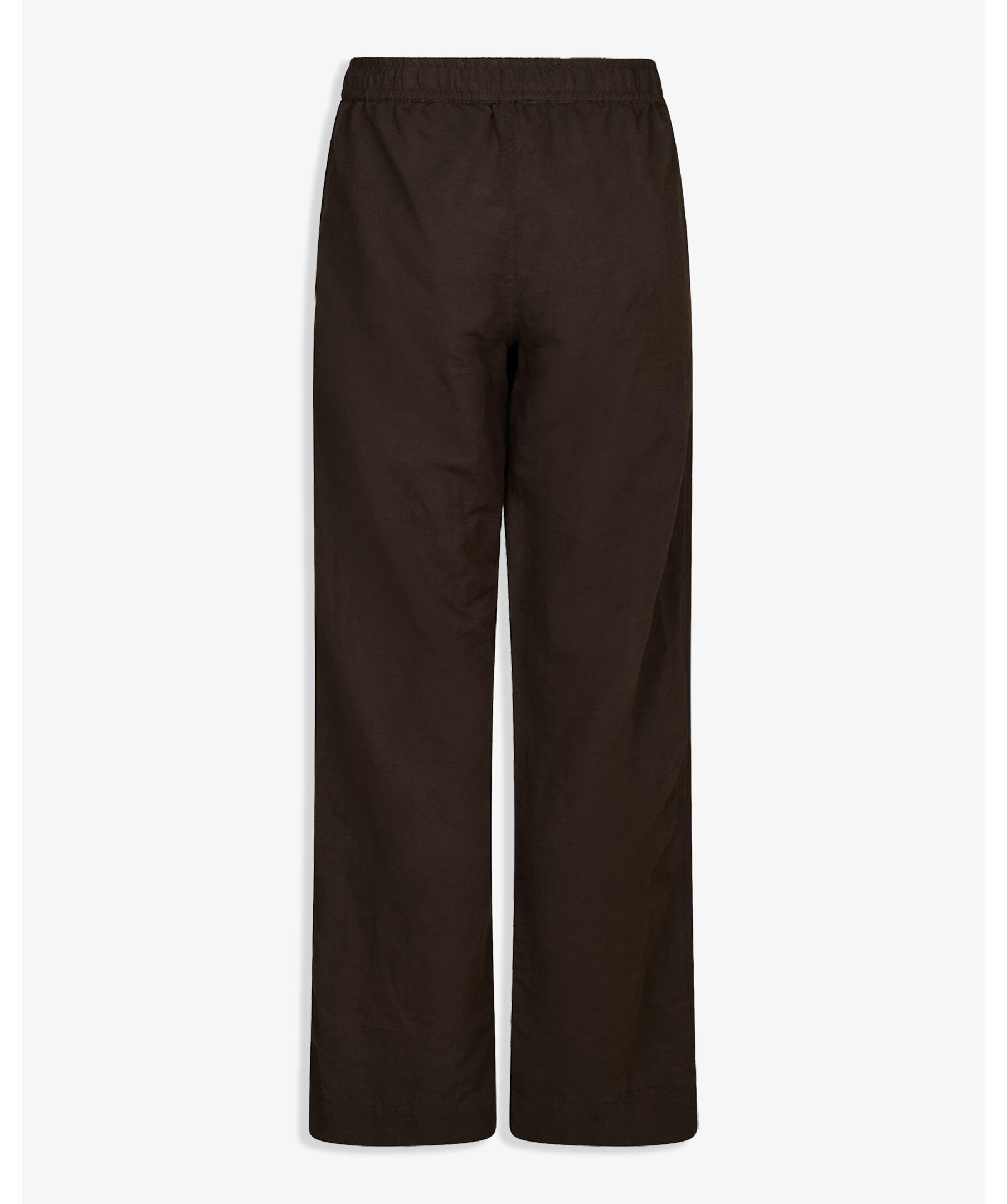 Bruna avslappnade byxor i linneblandning med vida ben och elastisk midja med dragsko. Byxorna har fickor fram