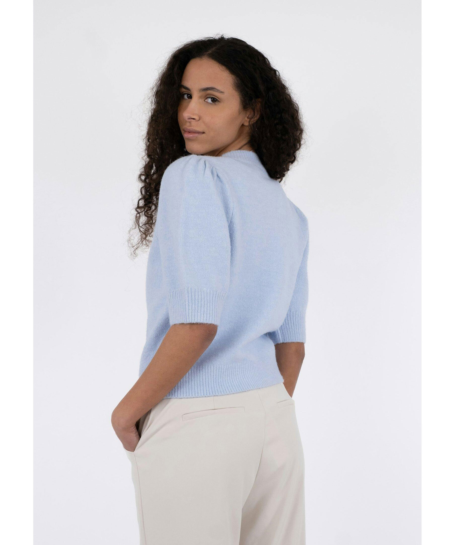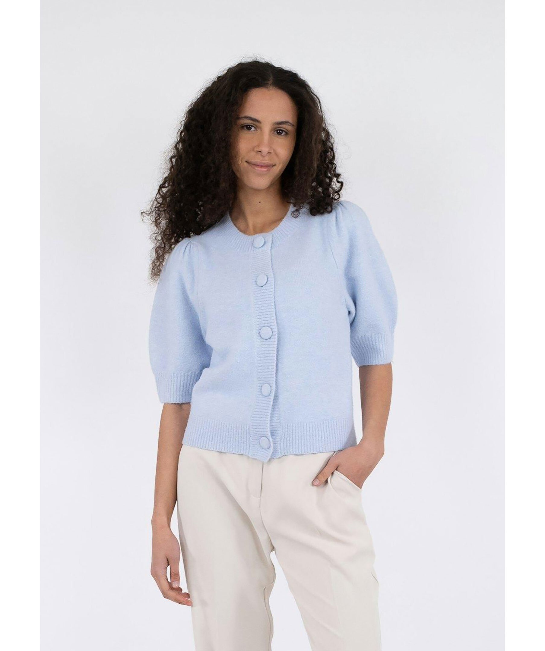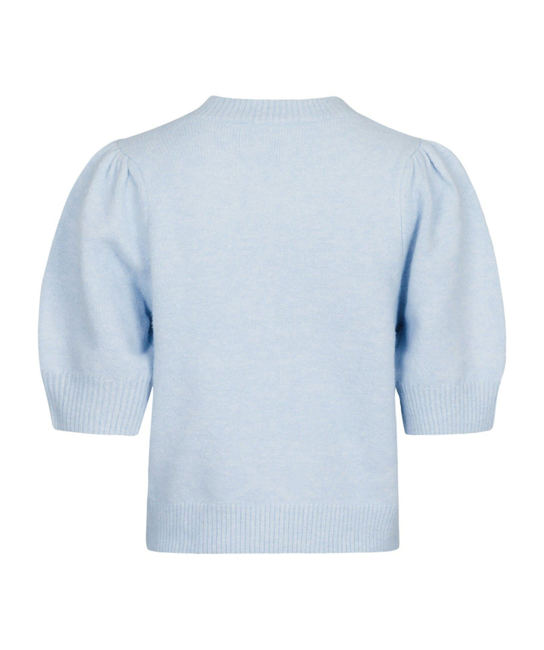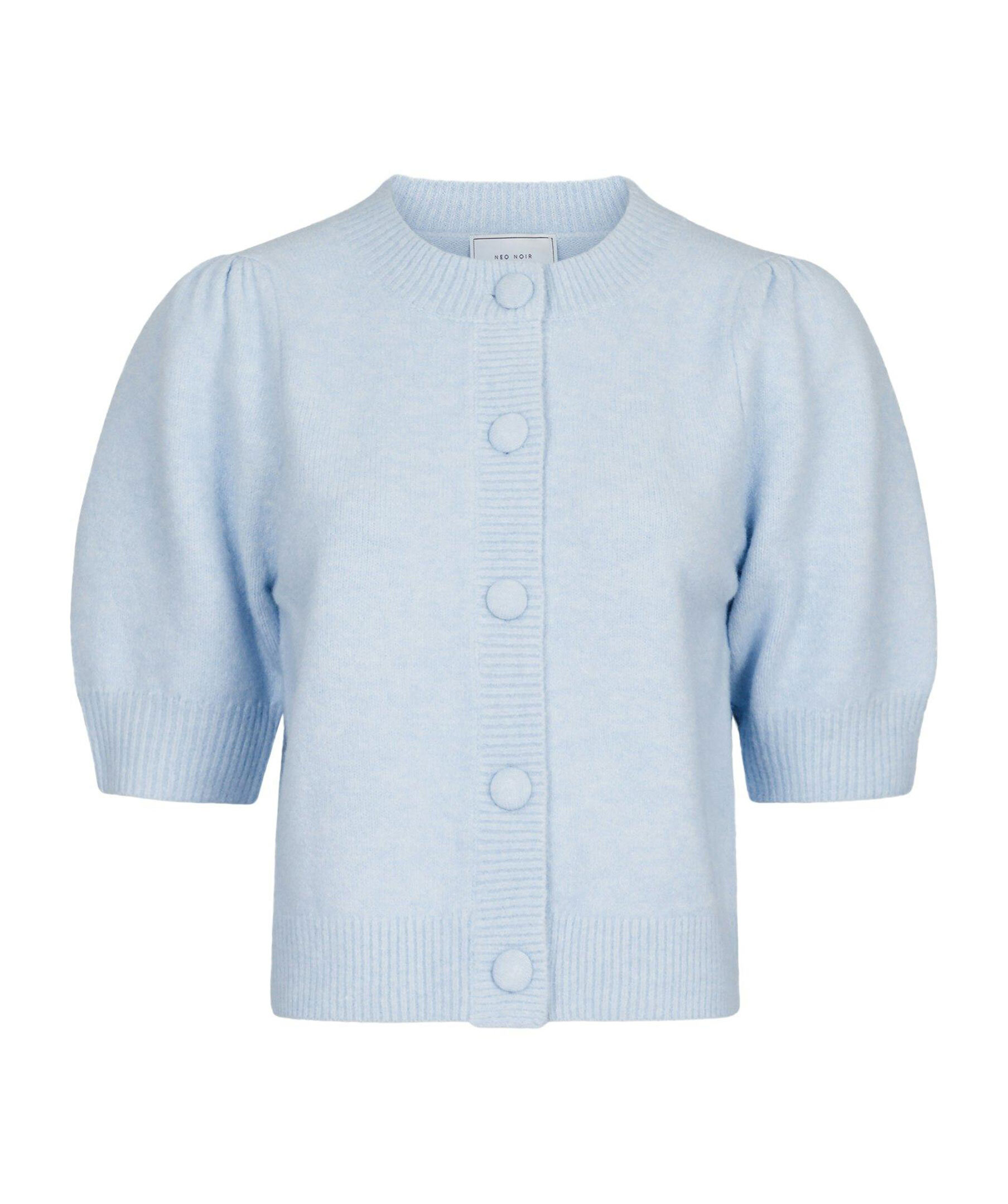 Ljusblå, melerad stickad tröja från Neo Noir. Stängs framtill med klädda knappar. Puffärmar som slutar strax över armbågen. Ribbstickad krage, ärm- och plaggslut. Tillverkad i ullblandning.