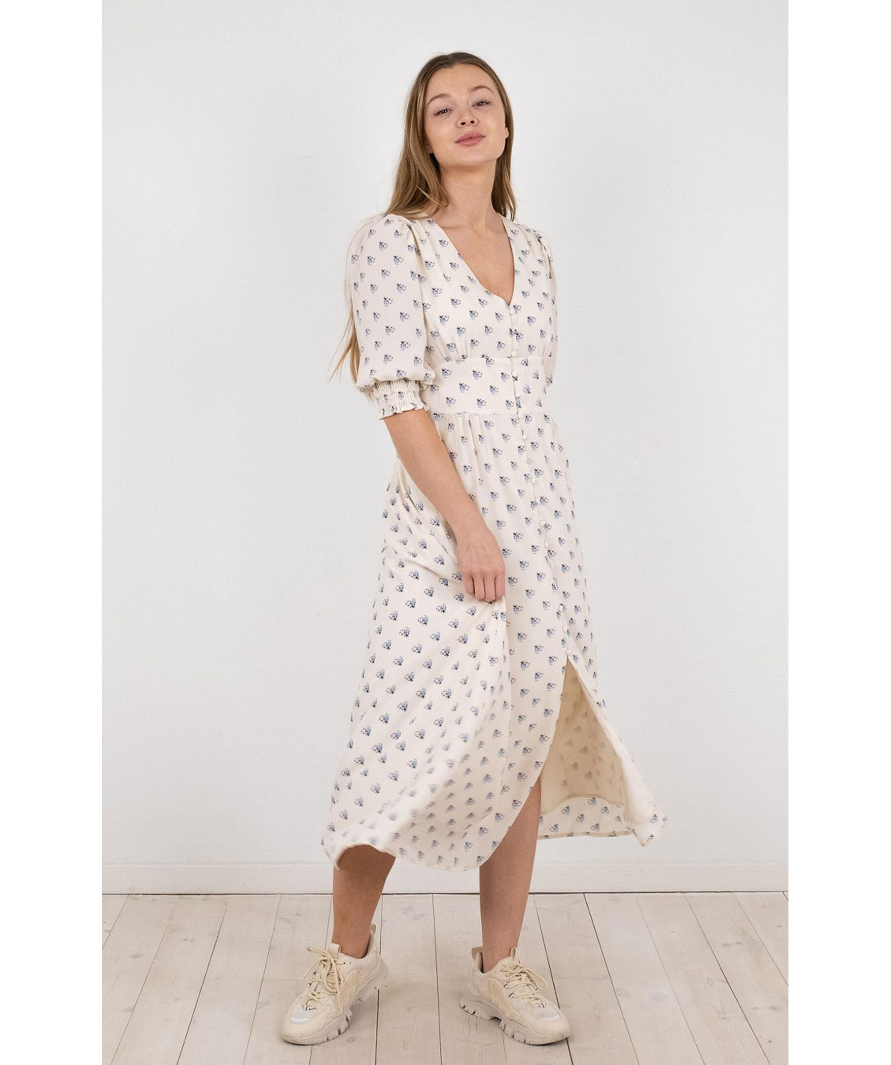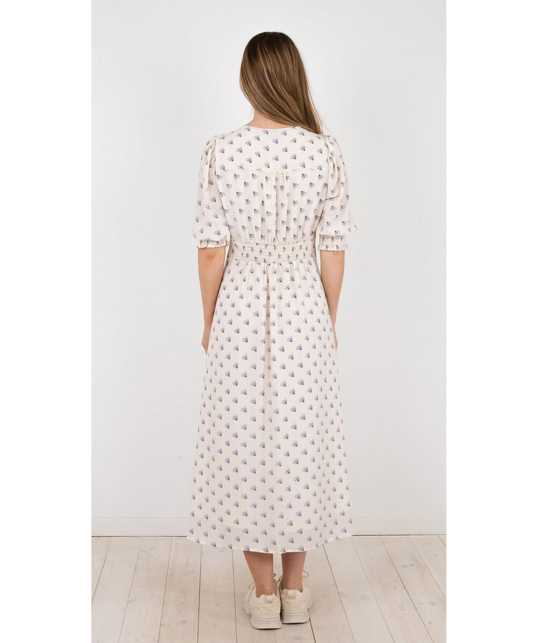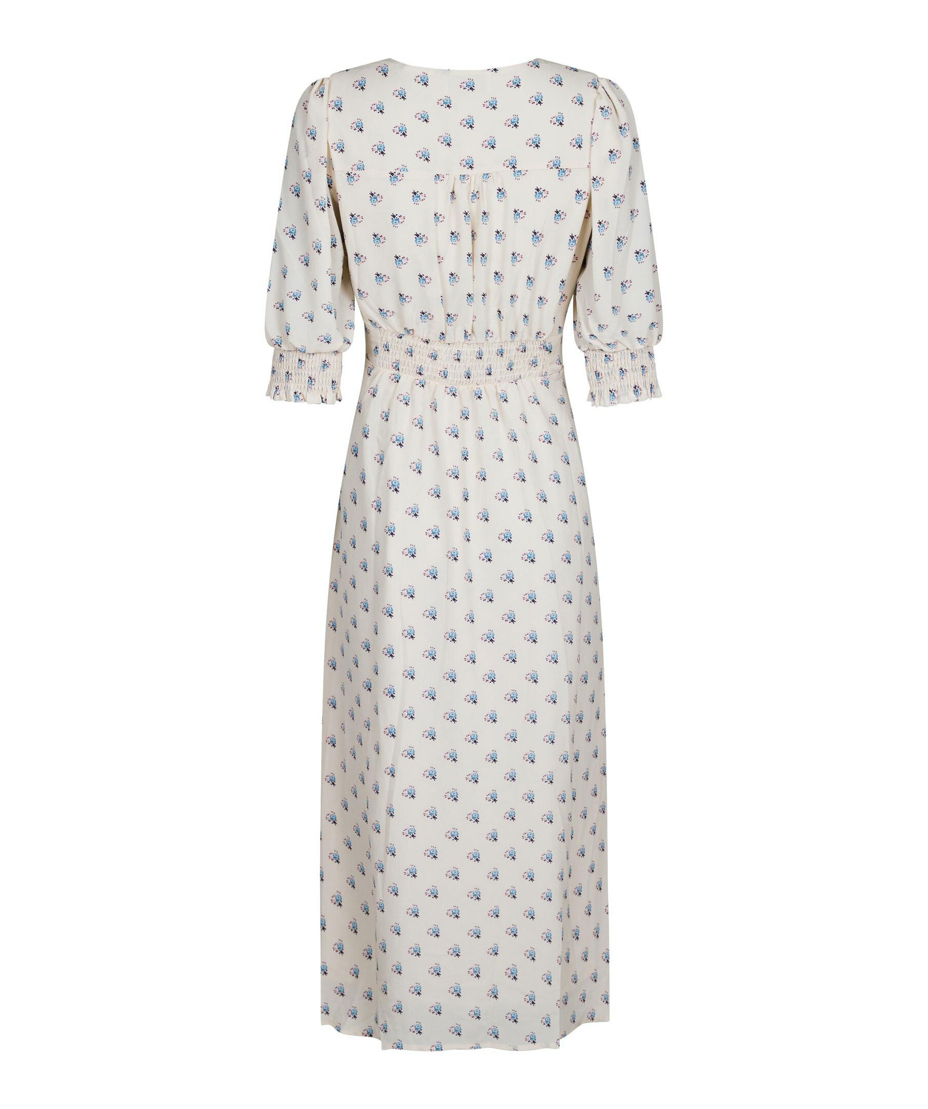 Off-white klänning från Neo Noir med blå och rosa blommor. Knappar framtill längst hela klänningen. V-ringad. Smock vid ärmslut och baktill vid midjan. Puffärmar.