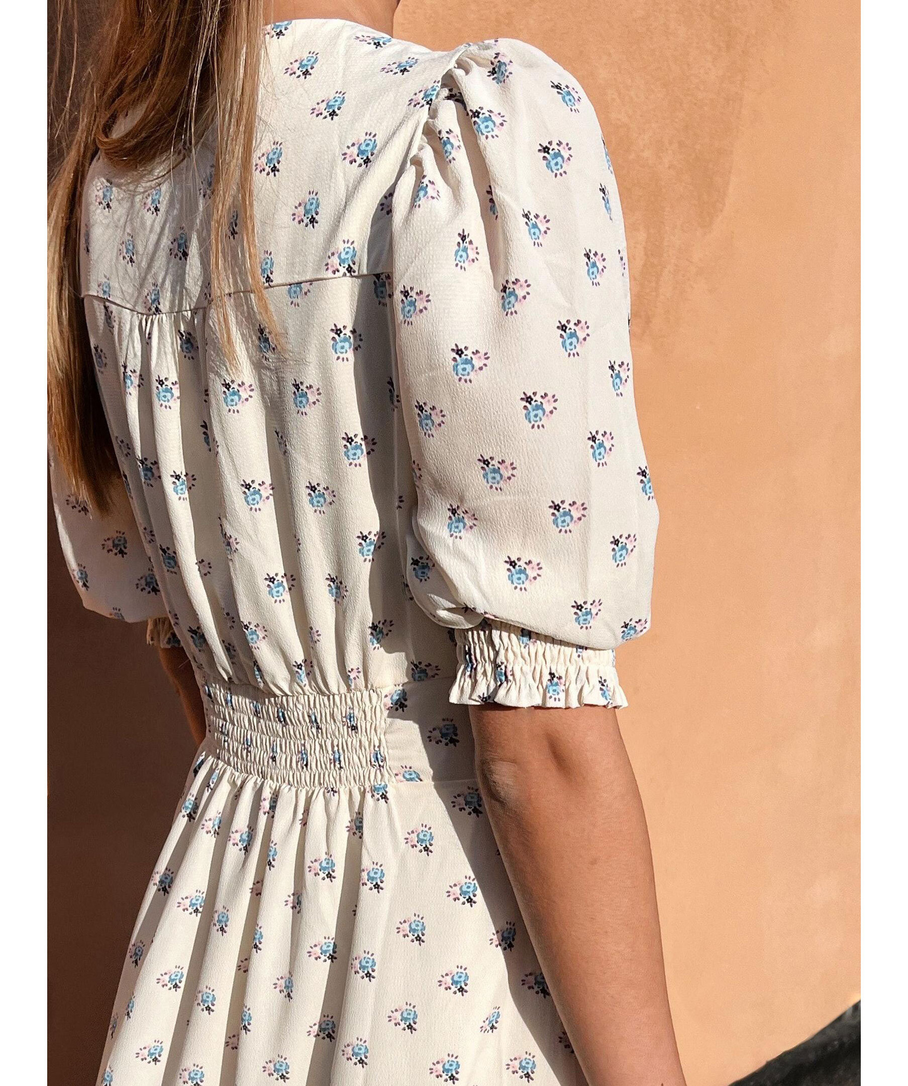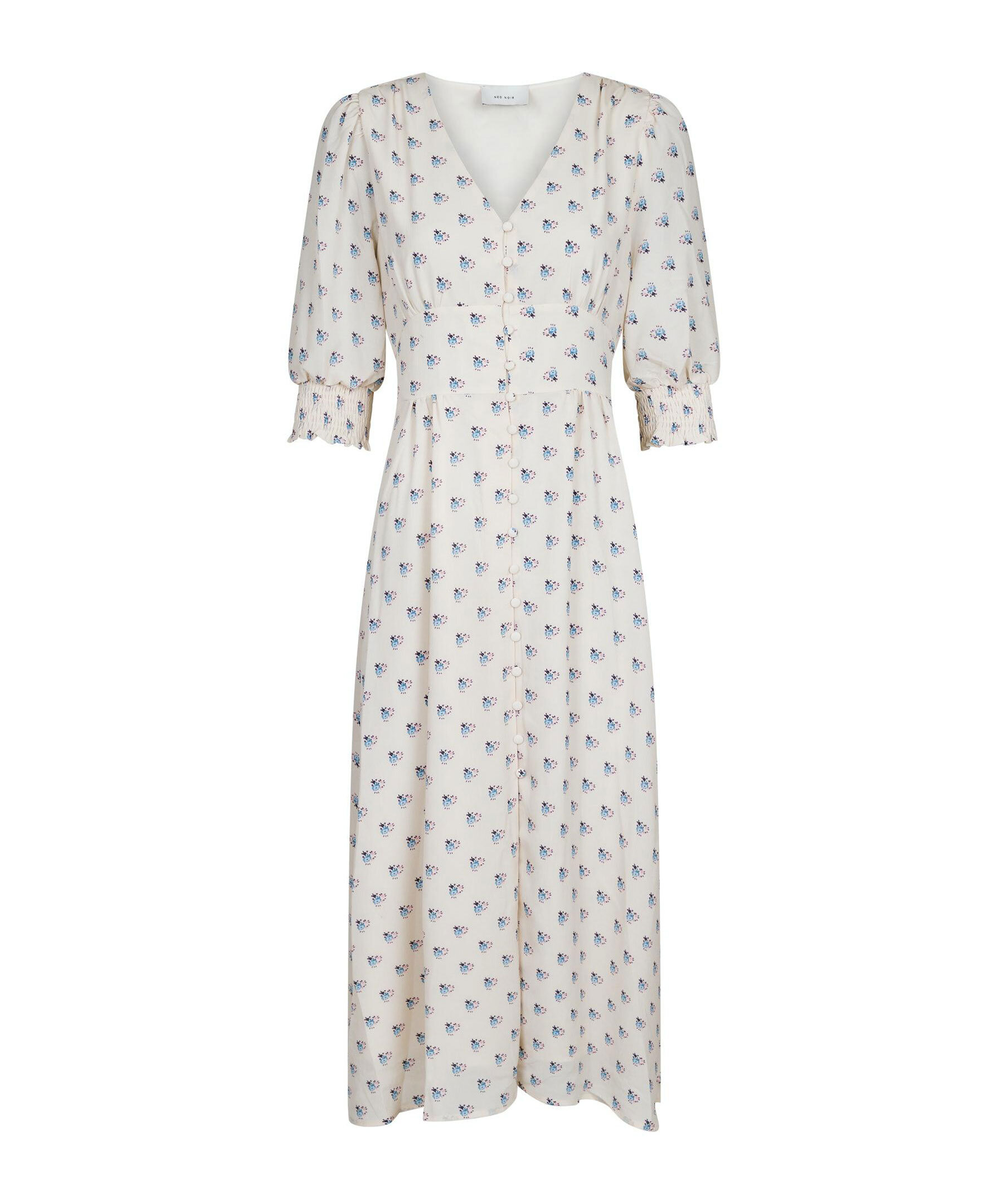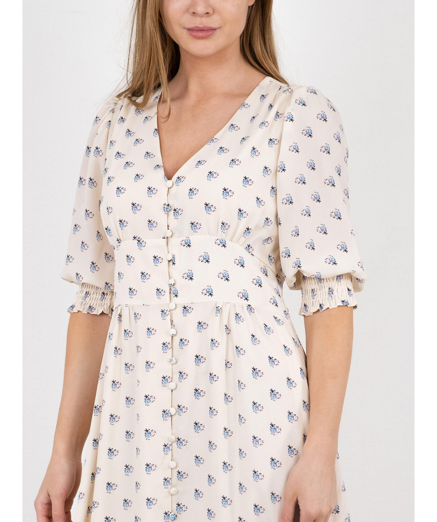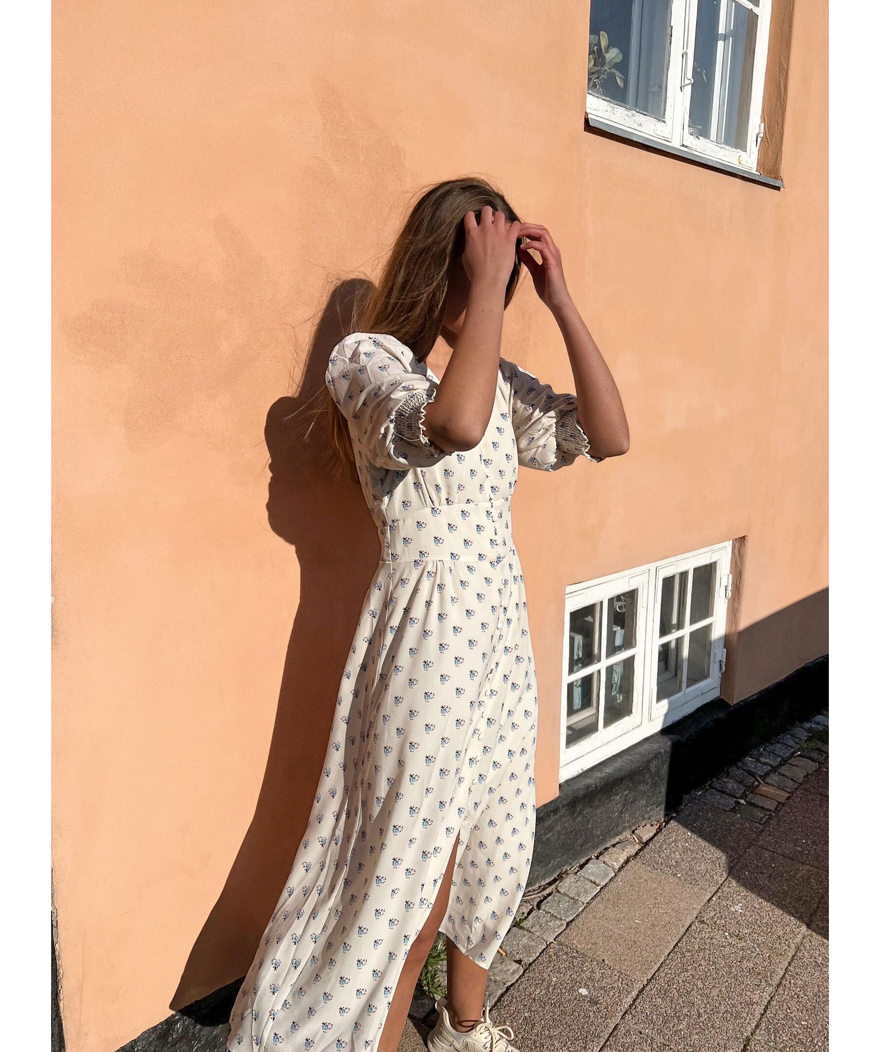 Off-white klänning från Neo Noir med blå och rosa blommor. Knappar framtill längst hela klänningen. V-ringad. Smock vid ärmslut och baktill vid midjan. Puffärmar.
