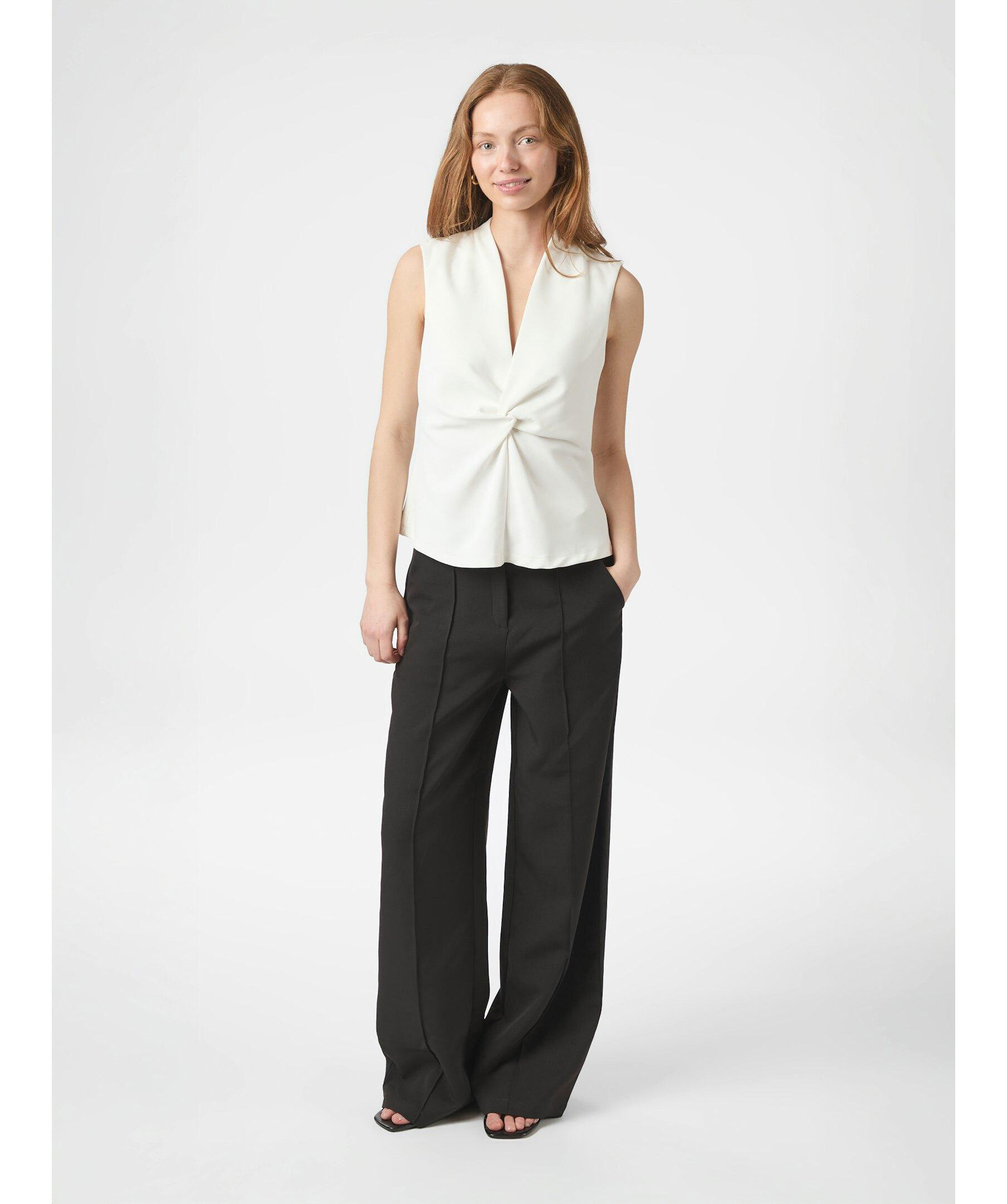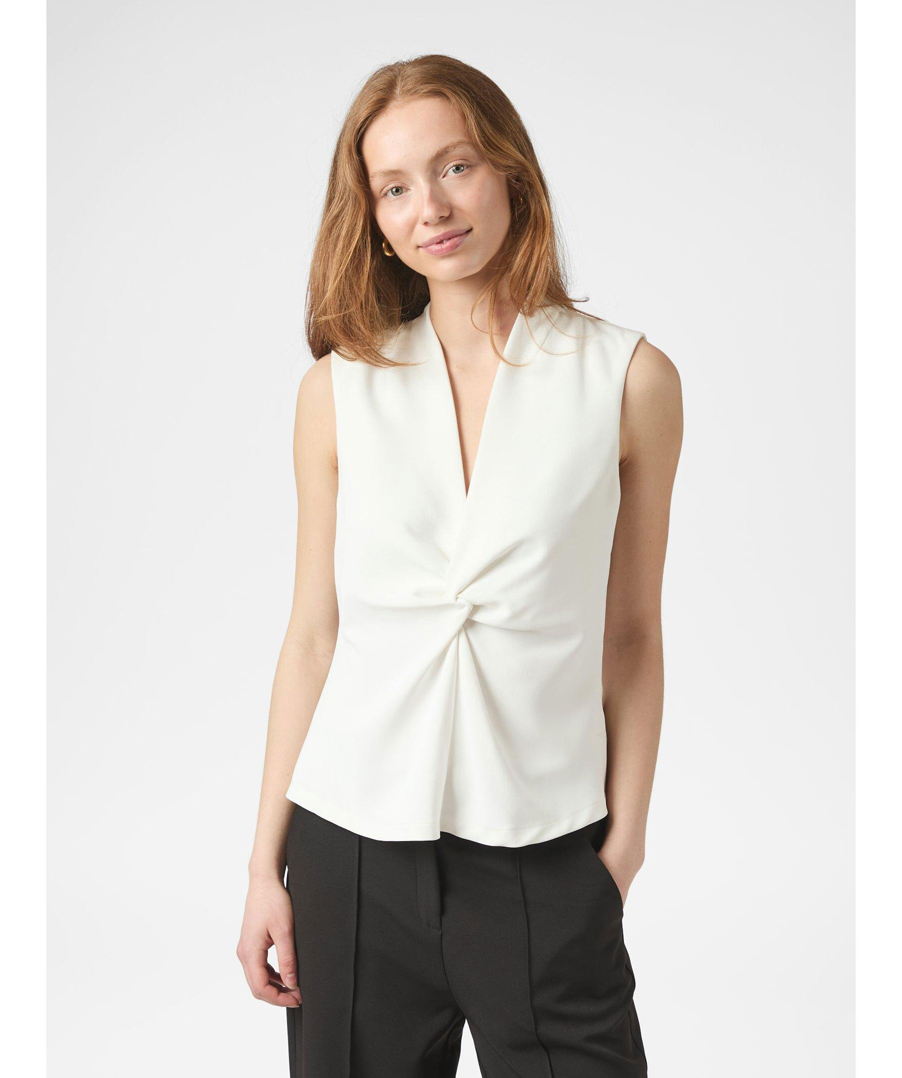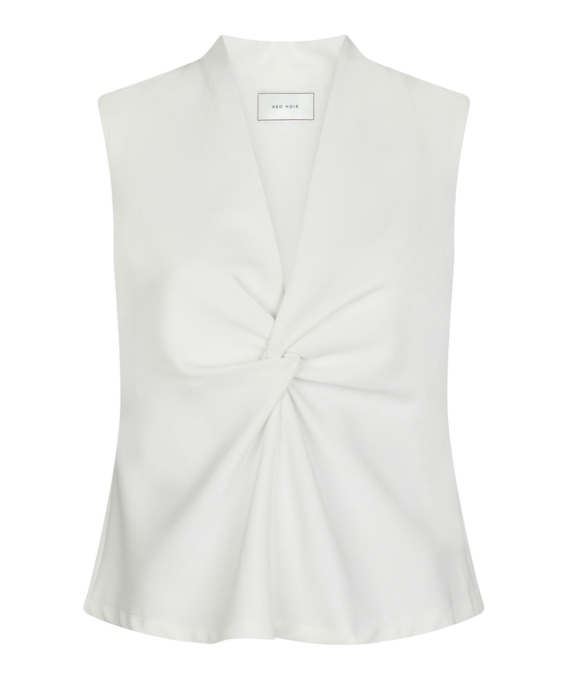 Elegant topp i vitt från Neo Noir. Den är ärmlös med en djup omlottliknande v-ringning och en dekorativ twistdetalj framtill som skapar en smickrande siluett. Det mjuka, vita tyget ger en sofistikerad känsla, perfekt för både jobb och festligare tillfällen. Kombinera med kostymbyxor eller kjol för en komplett look.