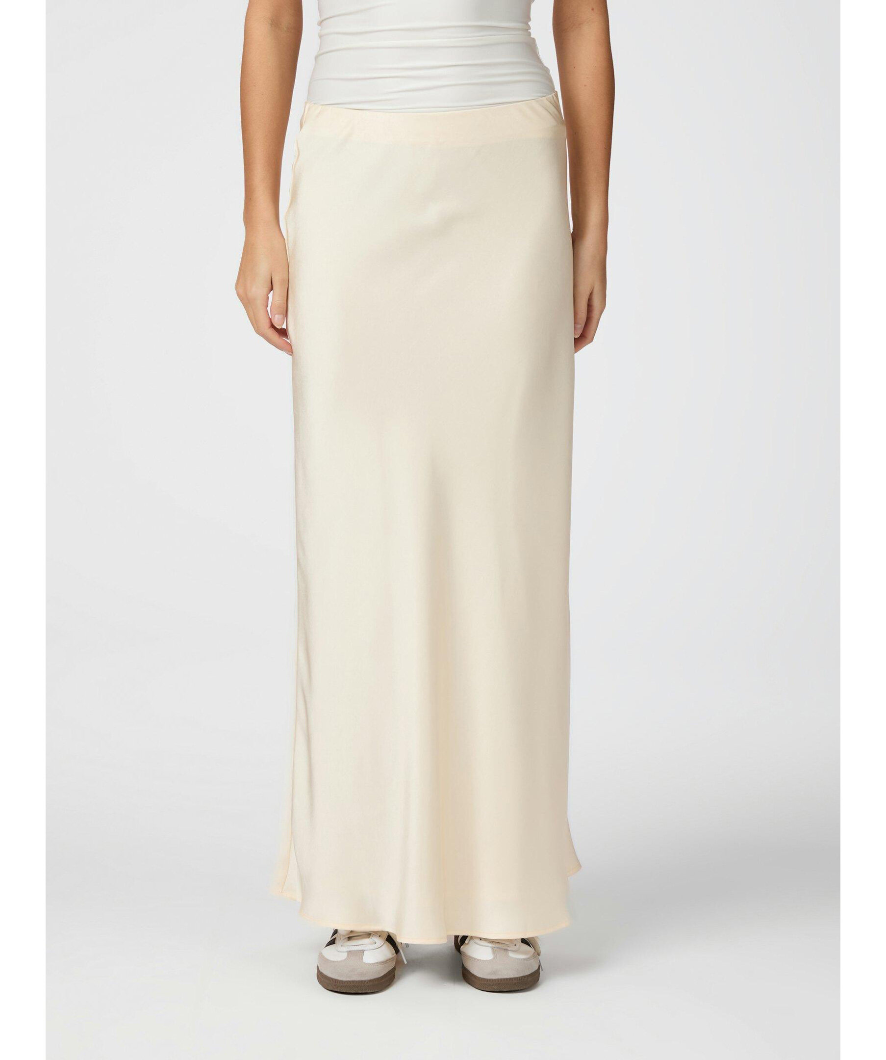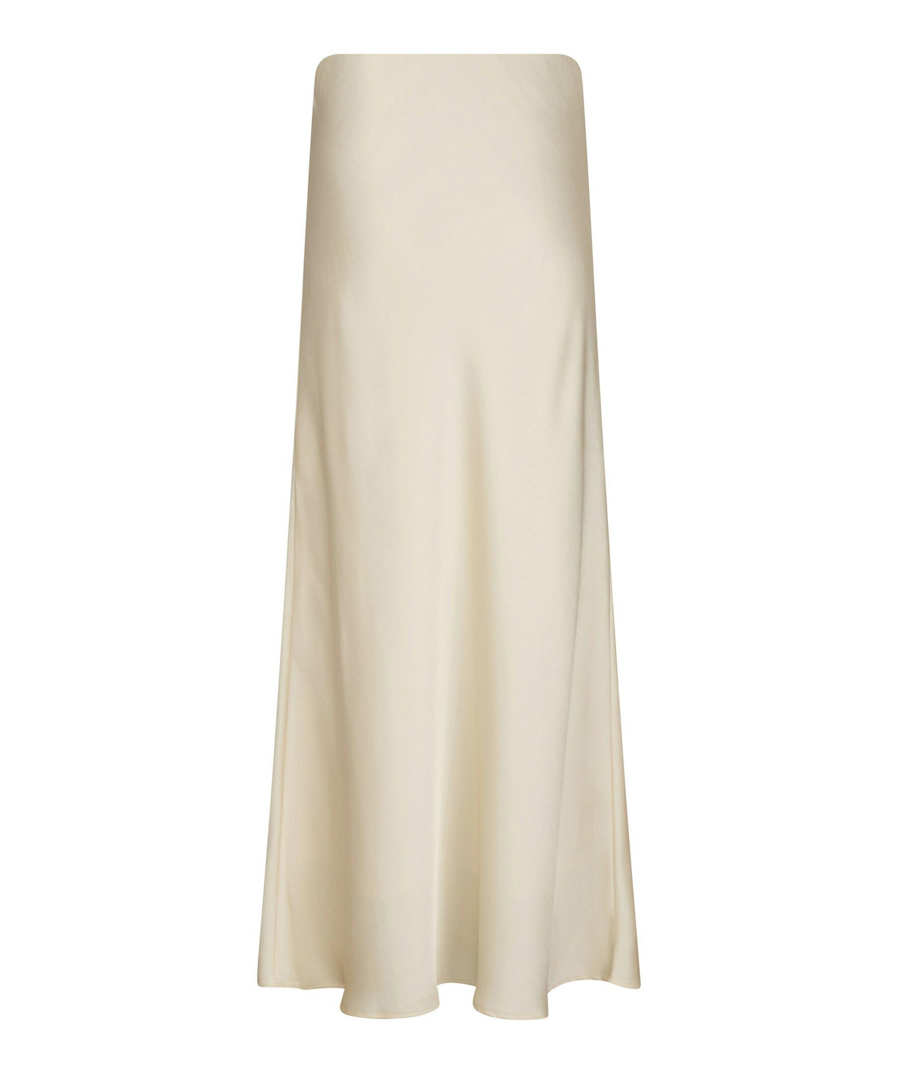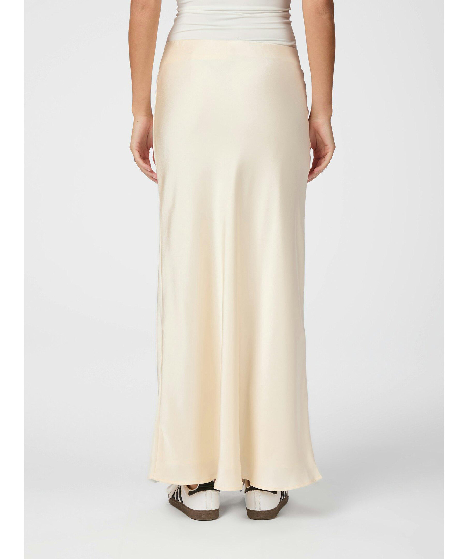 Långkjol med elastik inuti vid midjan. Kjolen är snedskuren och har en mycket smickrande passform. Kvaliteten är en fin, draperad satin. Modellen är 176 cm och bär storlek 36.