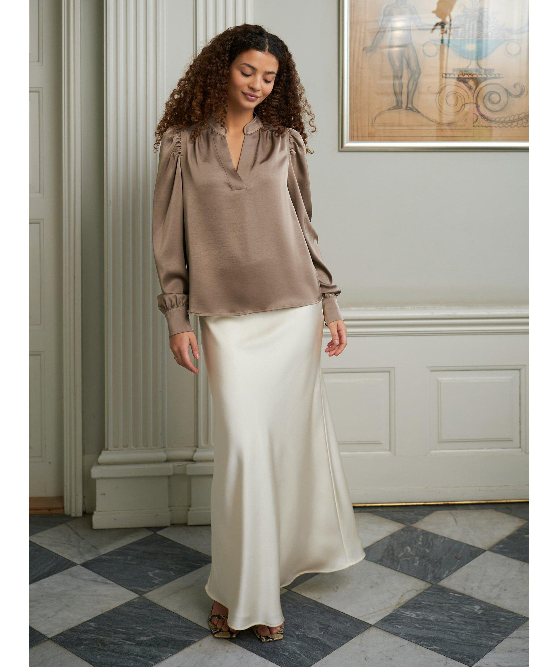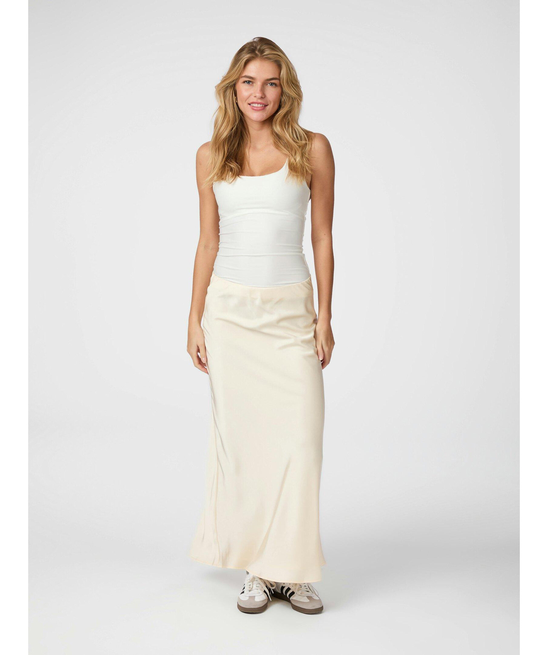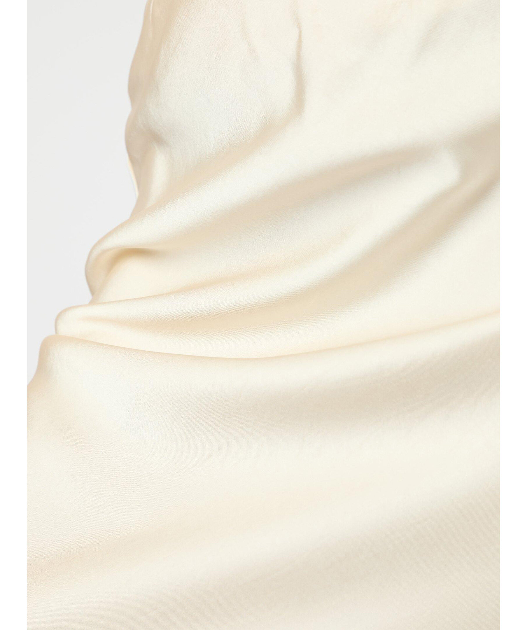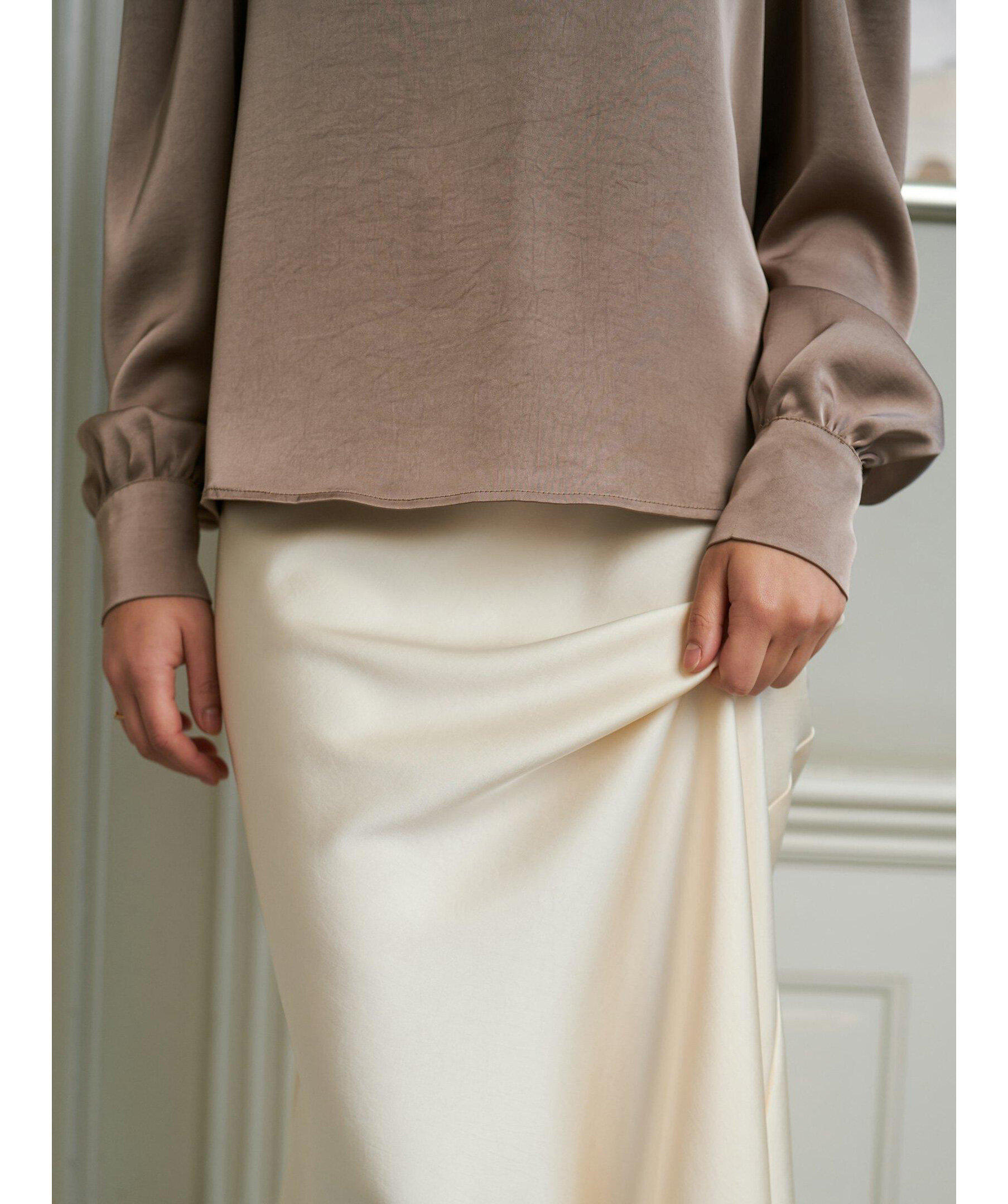 Långkjol med elastik inuti vid midjan. Kjolen är snedskuren och har en mycket smickrande passform. Kvaliteten är en fin, draperad satin. Modellen är 176 cm och bär storlek 36.