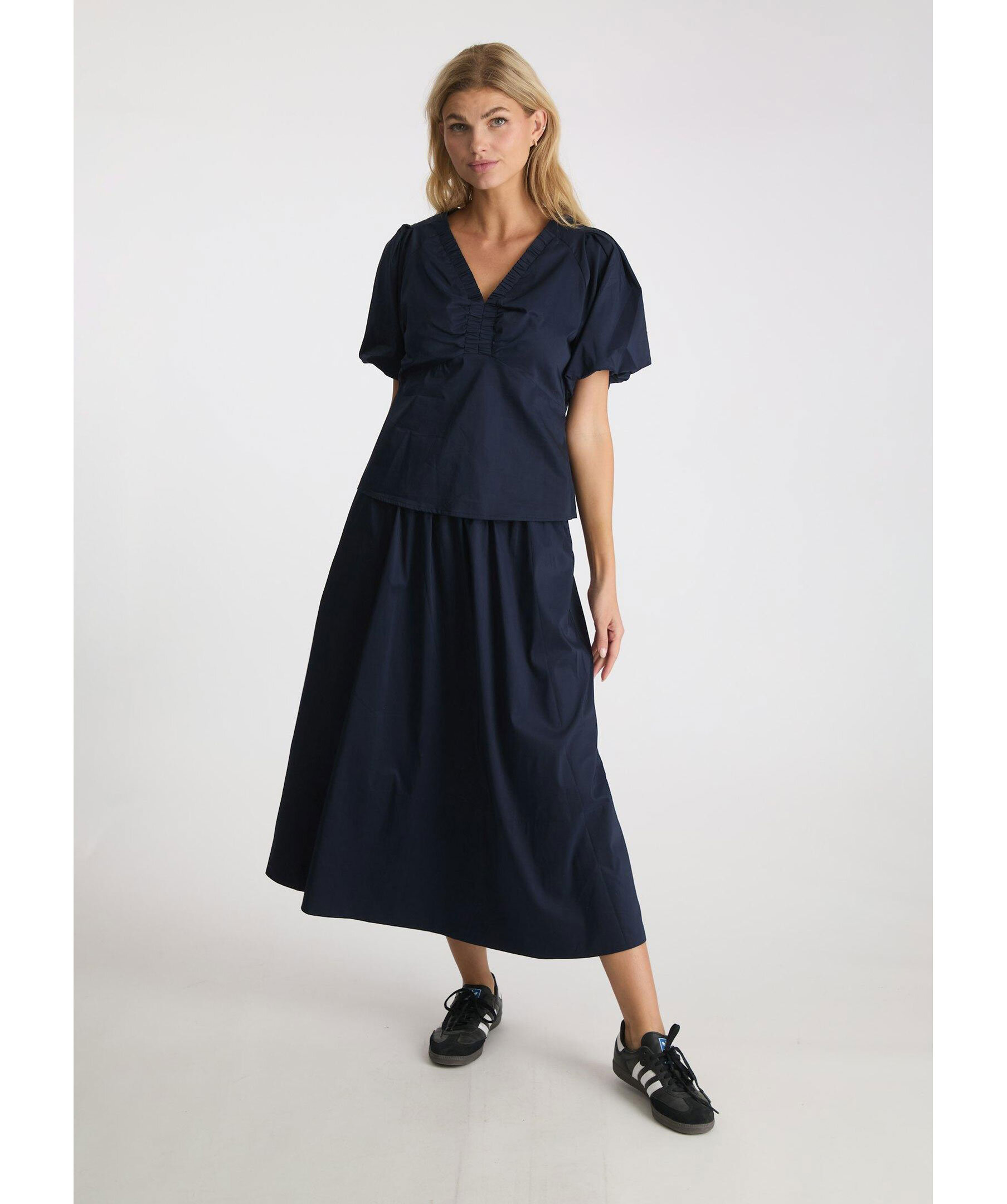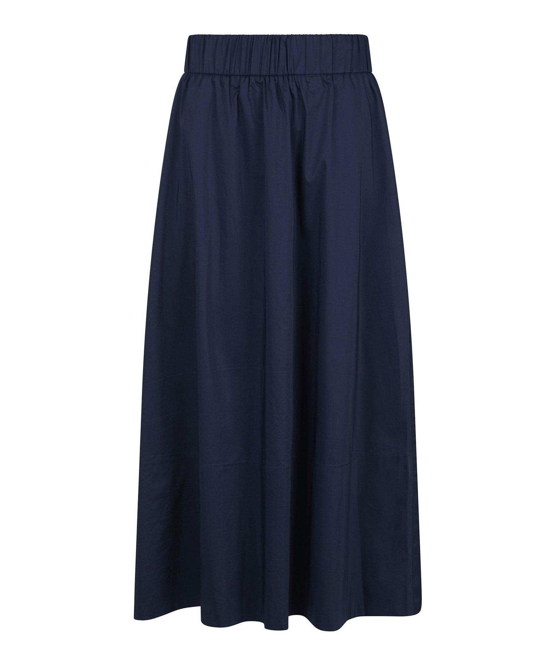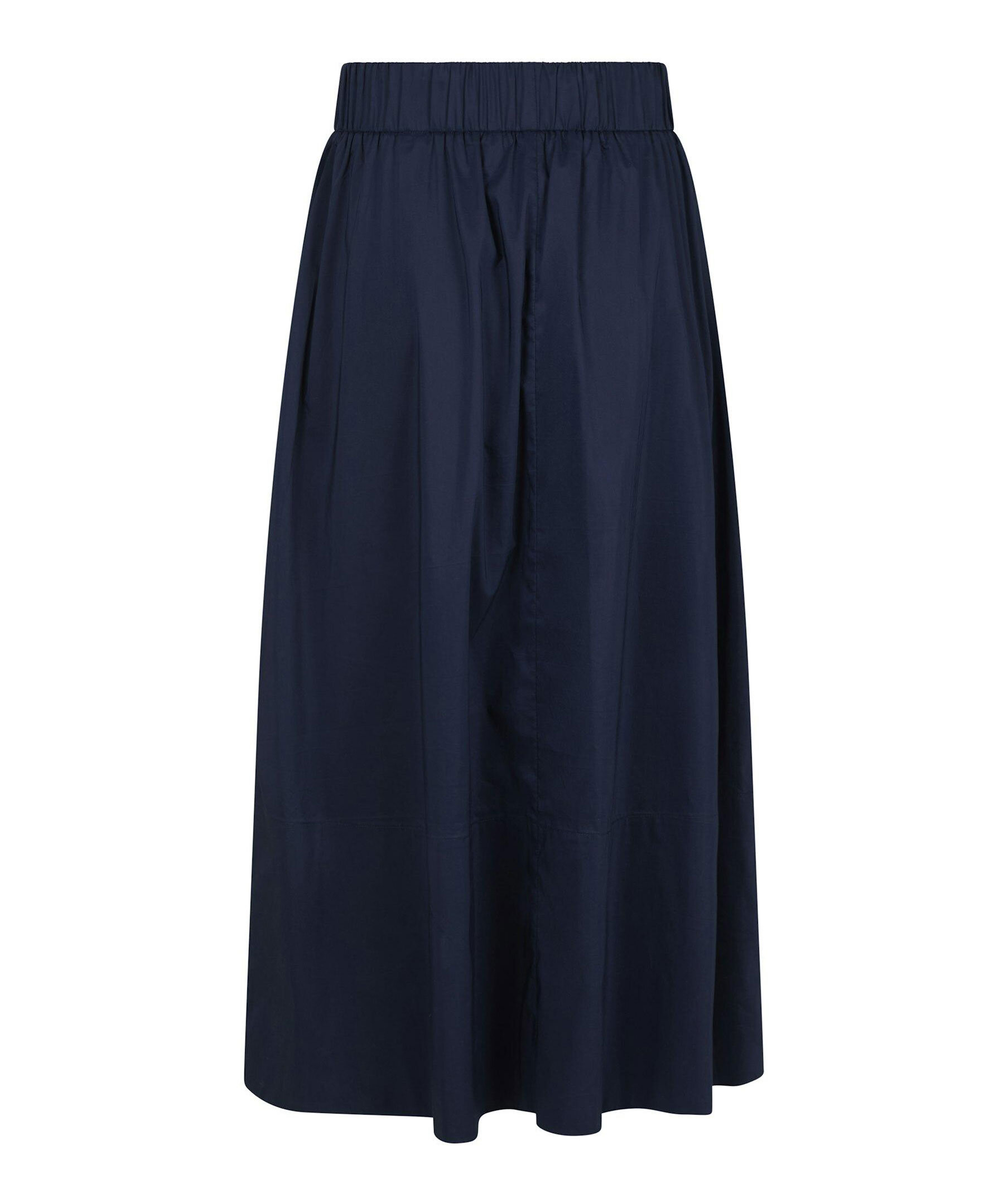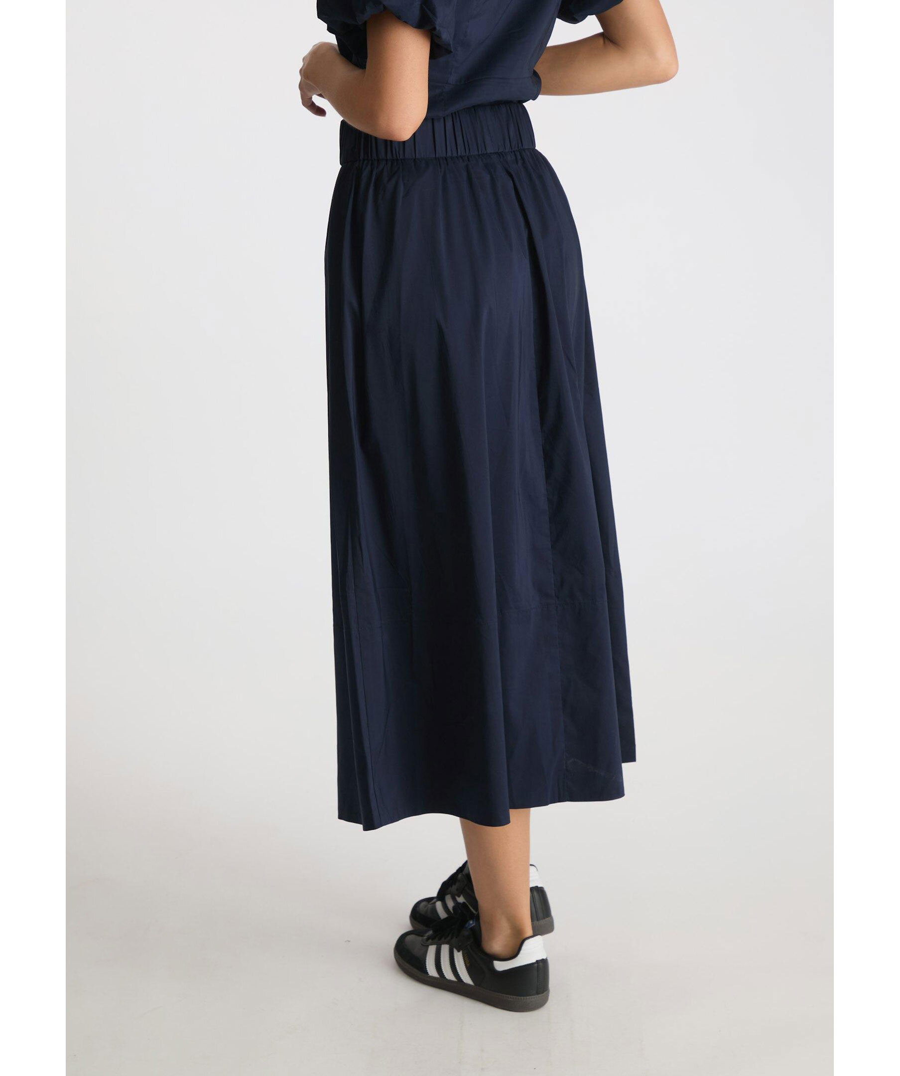 Mörkblå midi-lång kjol från Neo Noir. Elastiskt resår i midjan. Kjolen är Tillverkad i poplintyg i bomullsblandning. Två fickor framtill. Kjolen slutar mitt på ankeln.