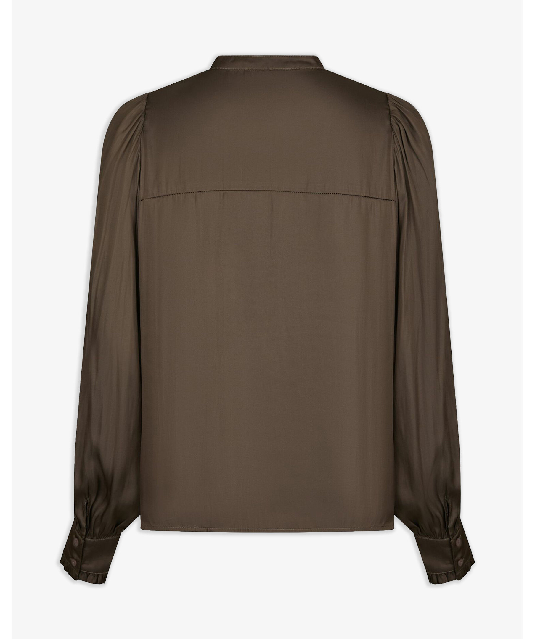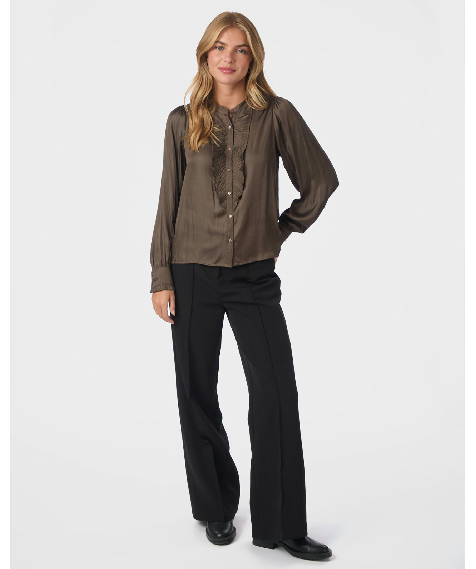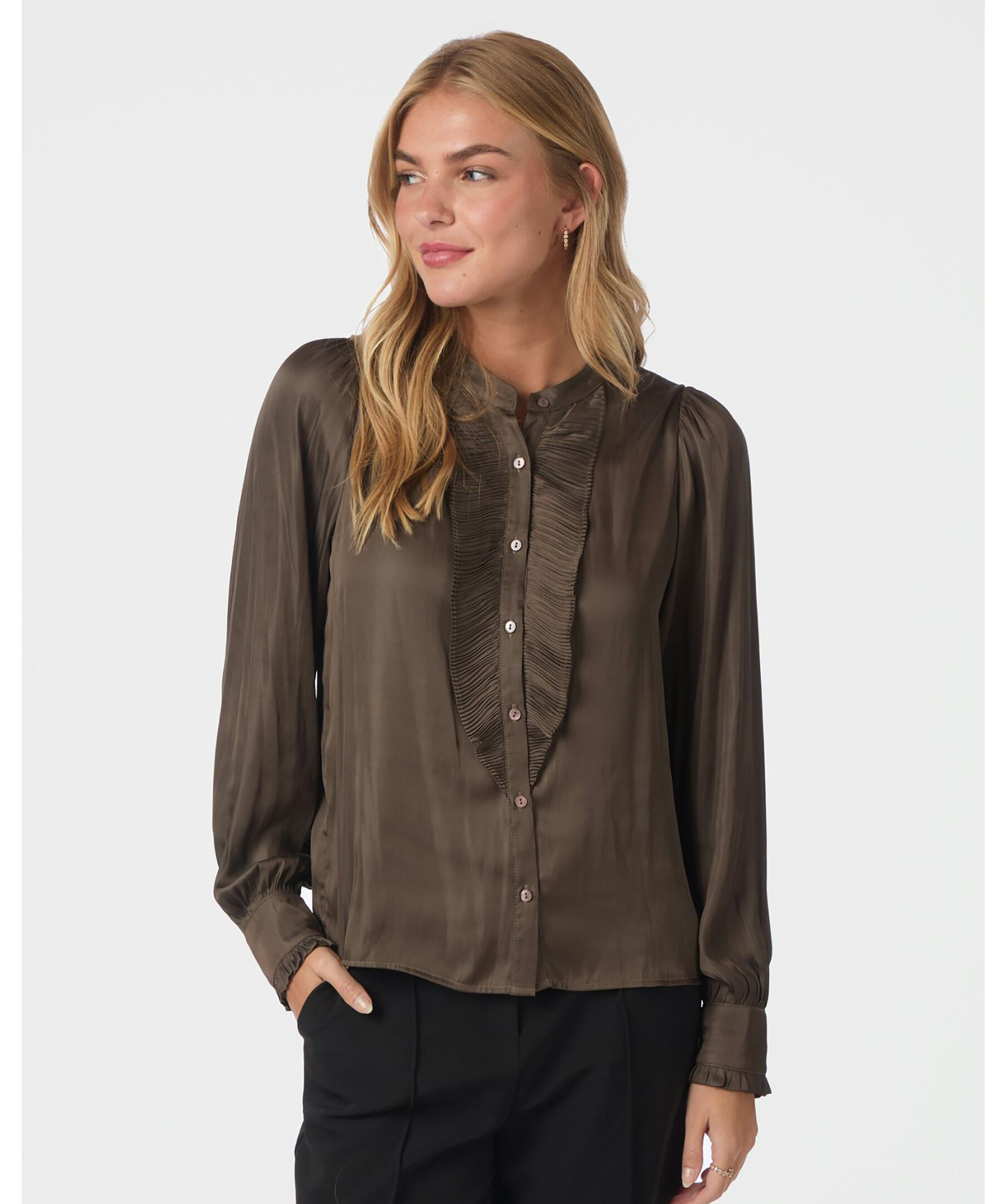 Brund blus med plisserade volangdetaljer längs knäppningen. Blusen har en lös passform och kommer i en fin mjuk satin-kvalitet. Modellen är 176 cm lång och bär storlek 36.