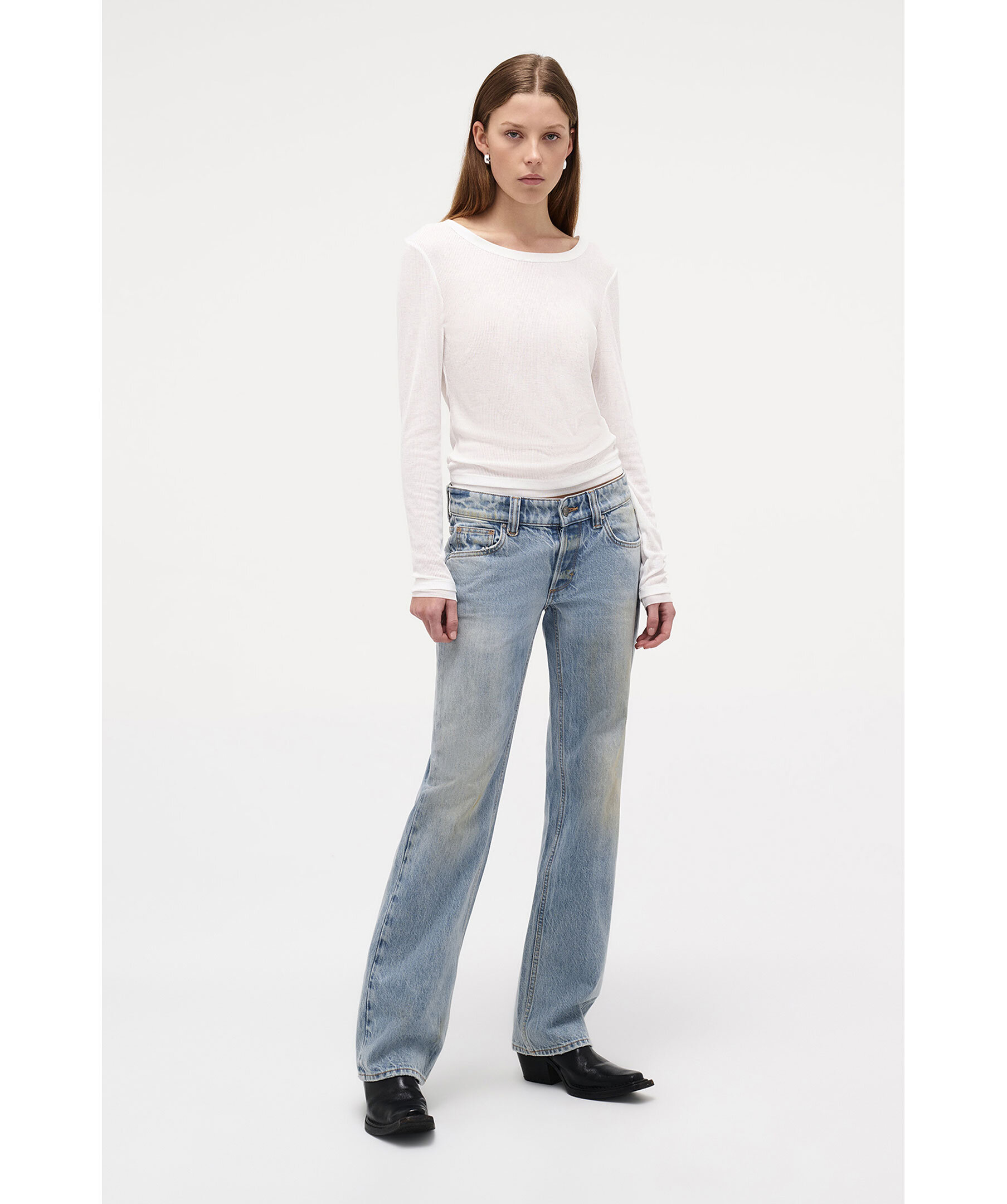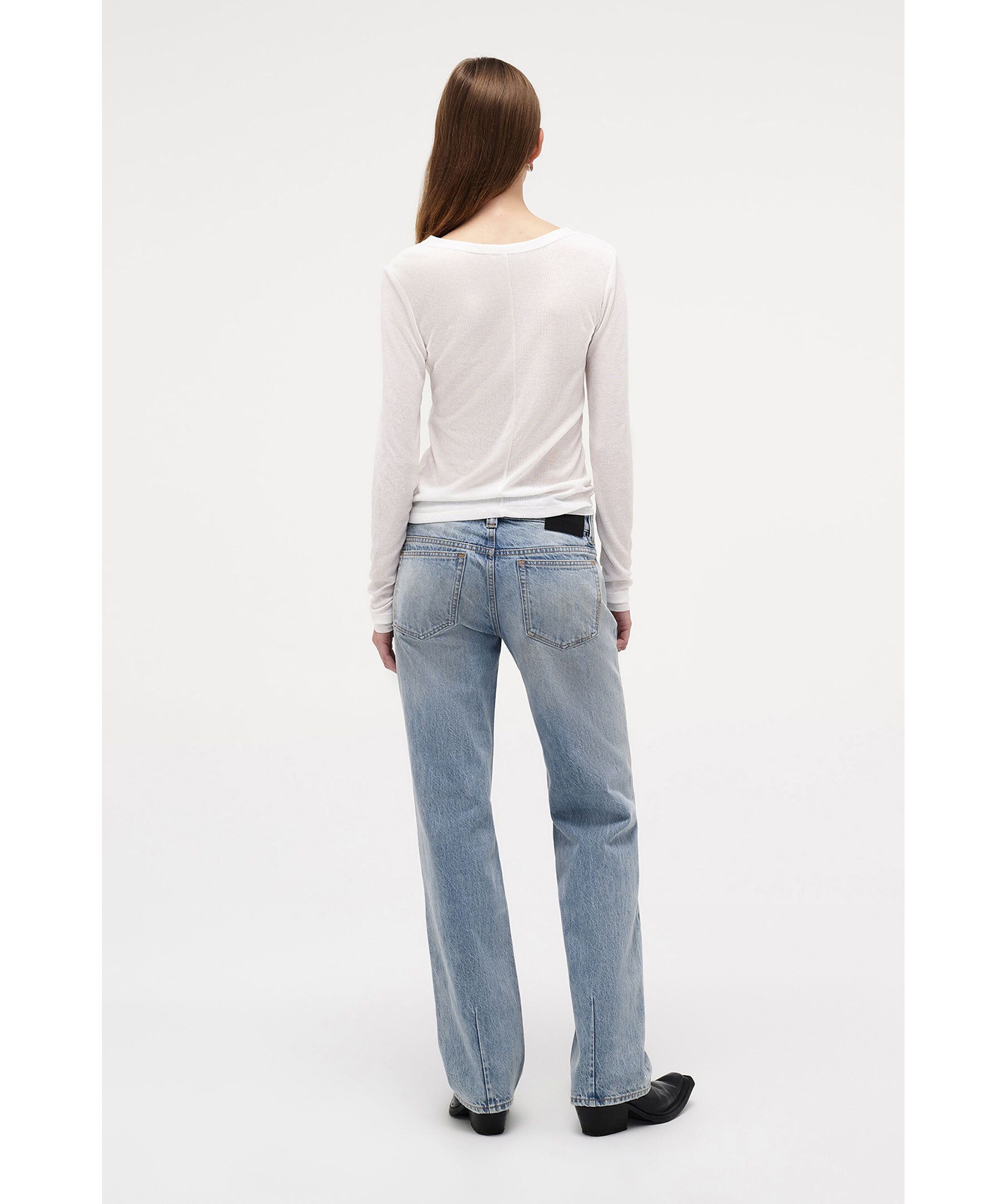 Vit långärmad t-shirt från Neuw. Slimmad passform med transparenta meshdetaljer vid ärmsluten och en scoop-urringning med ribbad fåll. Tillverkad i en elastisk mix av 62 % polyester, 38 % rayon och 3 % spandex ger den en följsam, mjuk känsla med ribbad struktur.