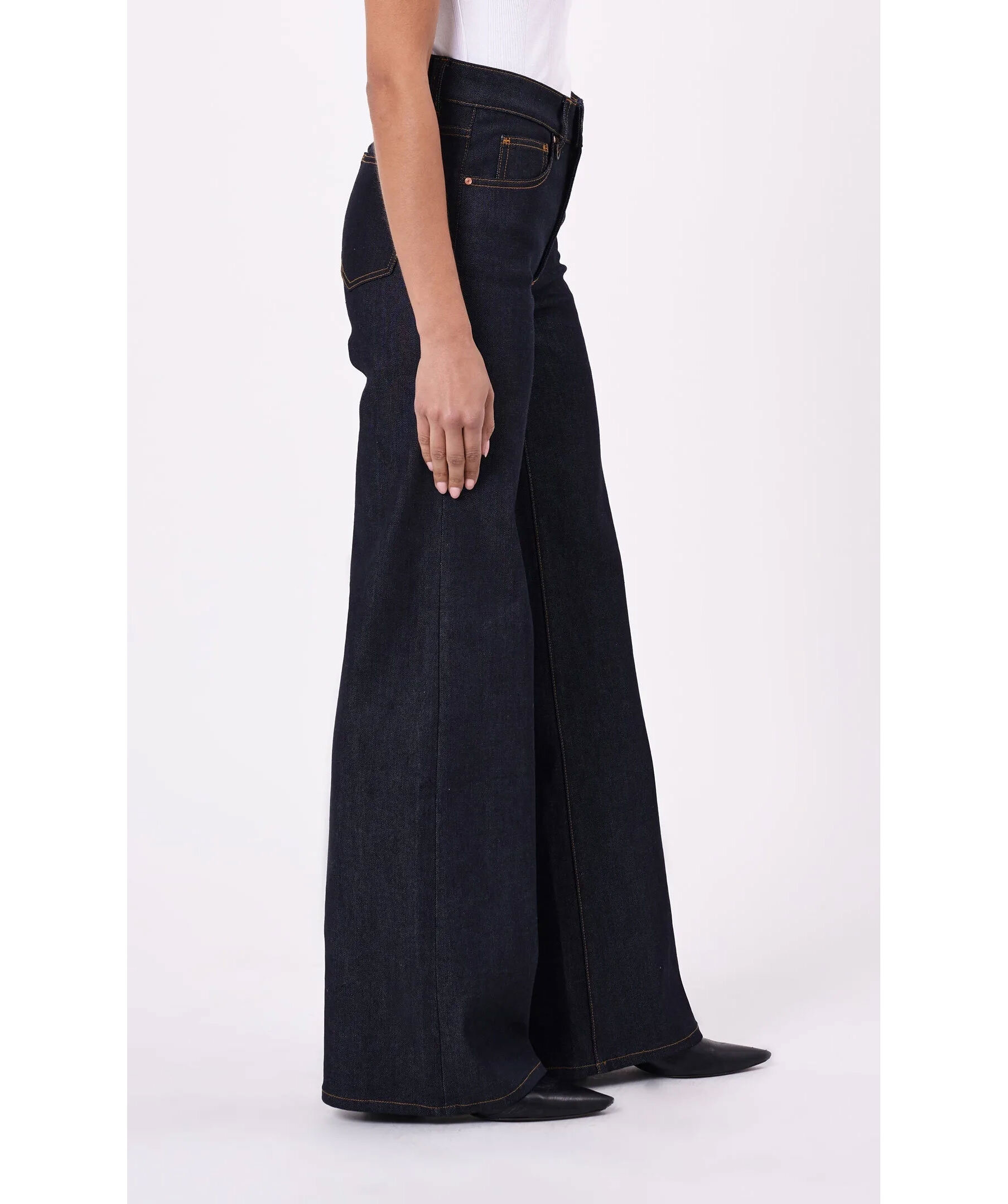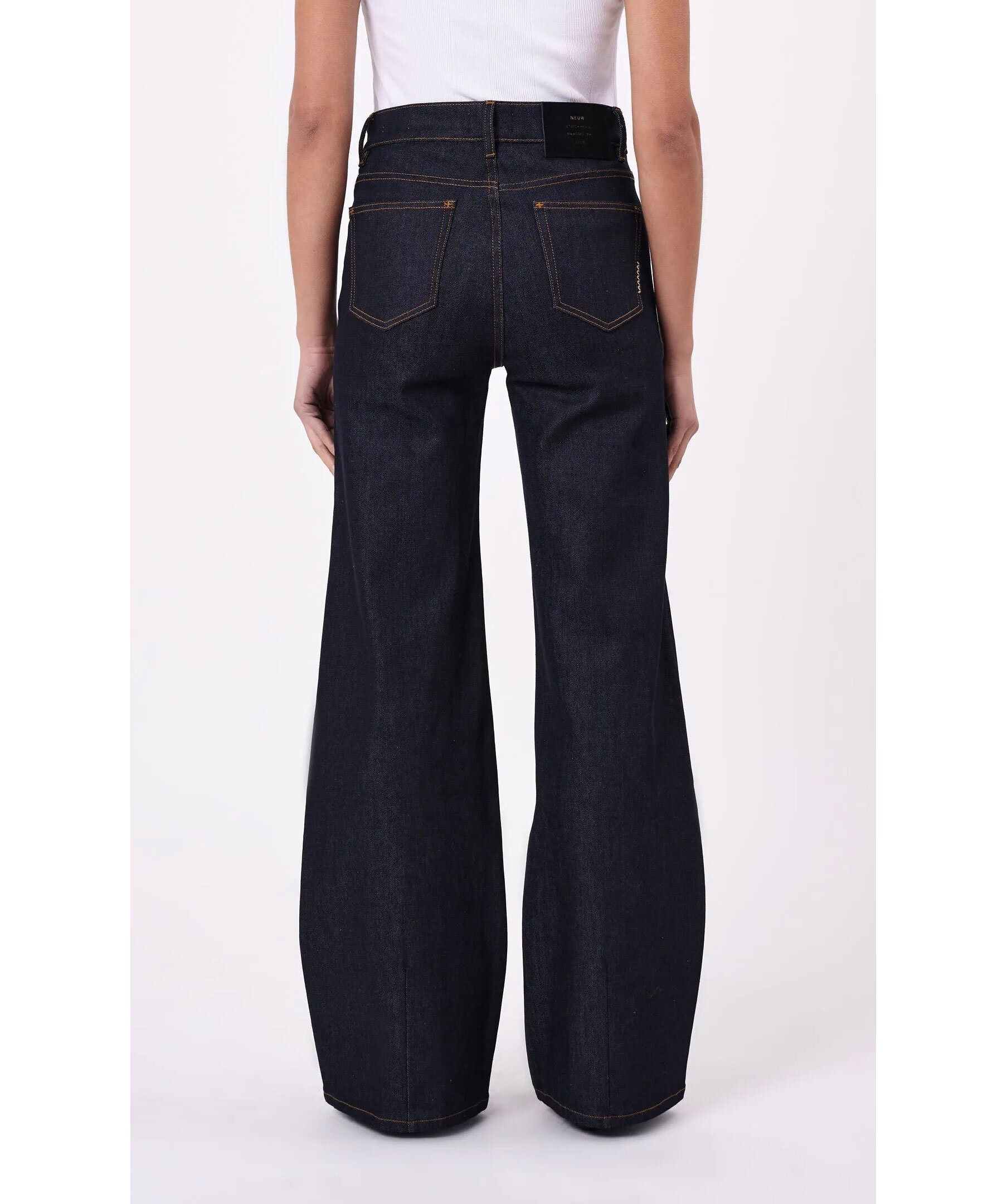 Mörkblå, utsvängda jeans från Neuw. Högmidjade. Indigotvätt med bruna sömmar. Fem fickor, hällor för bälte. Svart patch i läder med embossad logotyp. Tillverkad i en bomullsblandning.