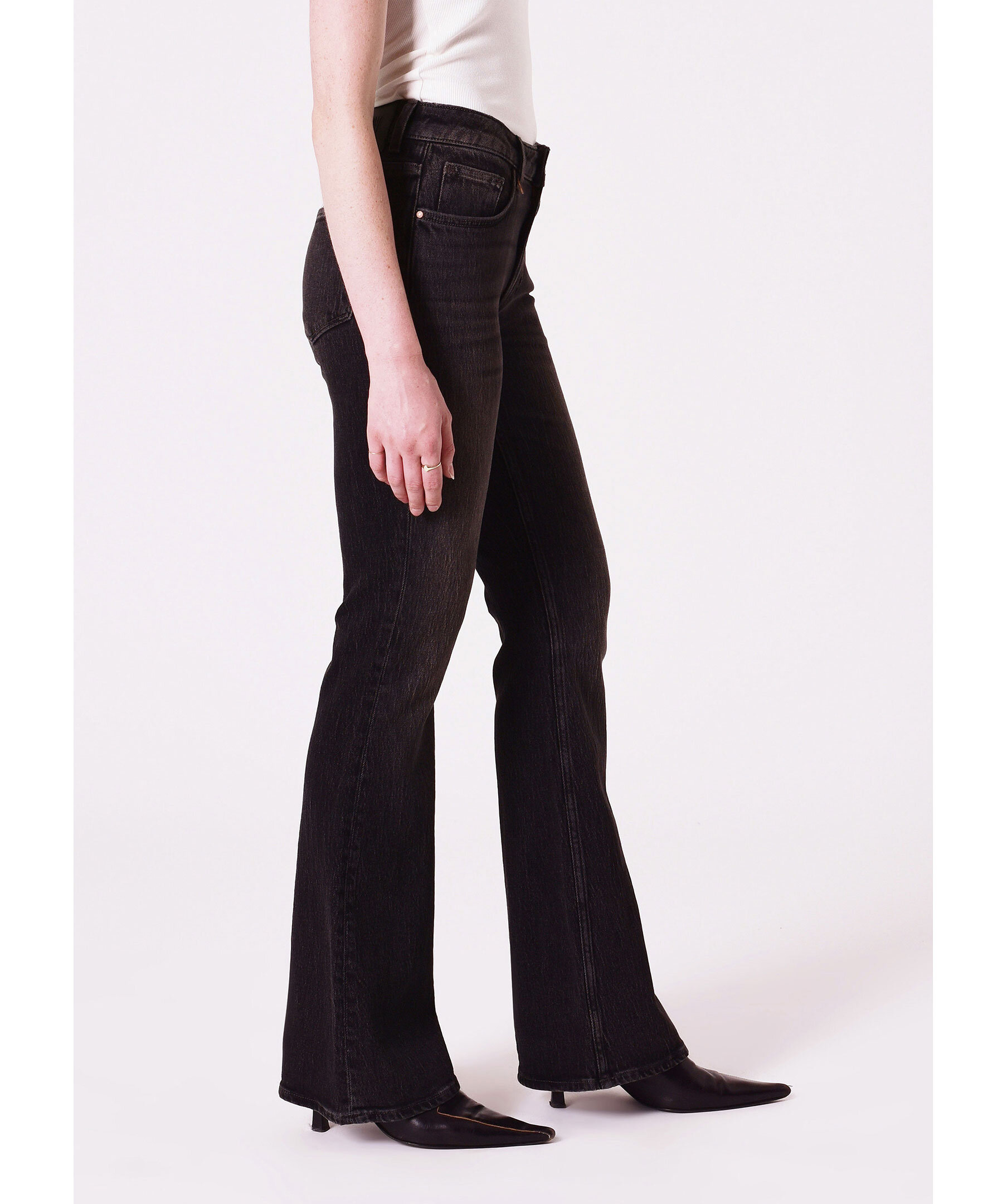 Svarta jeans från Neuw i en urtvättad bootcut modell. Jeansen har bälteshällor i midjan, fem fickor samt en liten metallring framtill. Tillverkade i en bomullsblandning.
