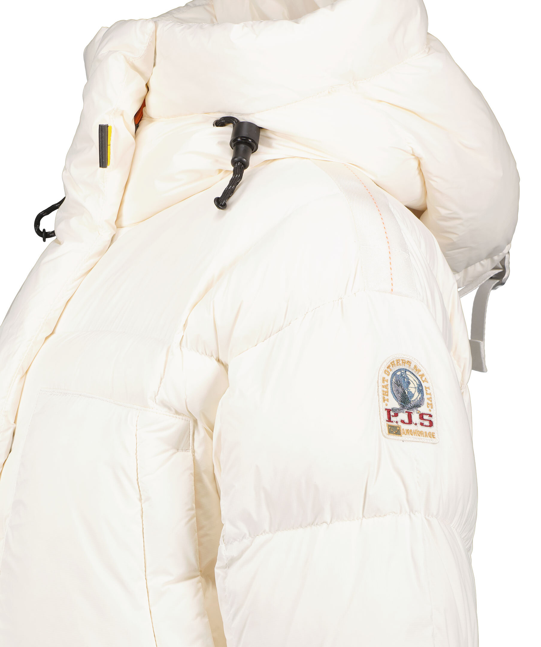 Vit lång dunparkas från Parajumpers. Stängs framtill med tvåvägsdragkedja och magneter. Justerbar luva med dragsko. Fyra fickor framtill som stängs med dragkedja. Två innerfickor i mesh. Ribbstickad elastisk mudd vid ärmslut. Broderad logotyp på vänster ärm.