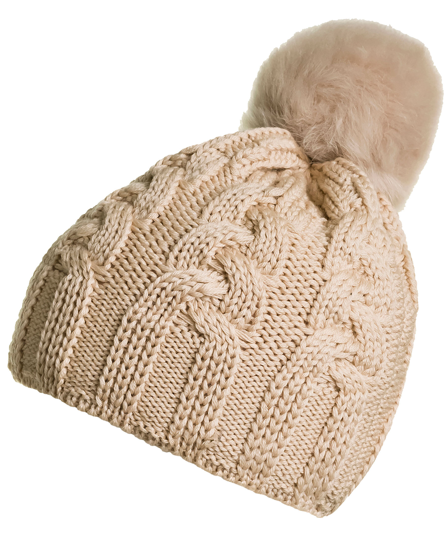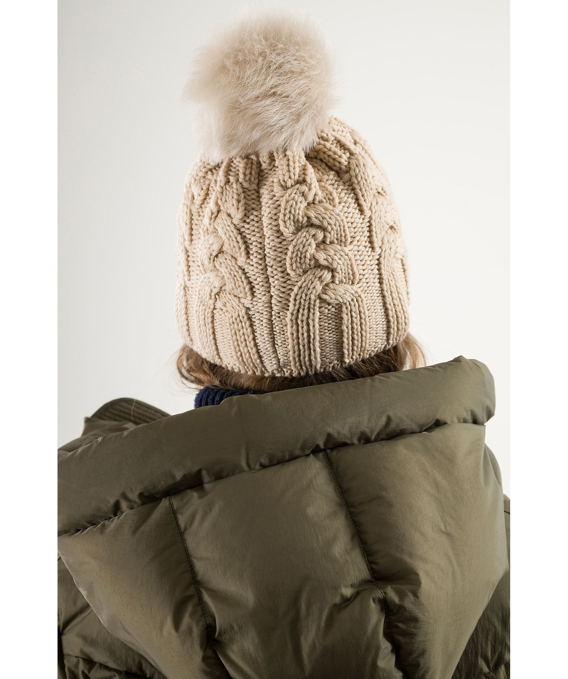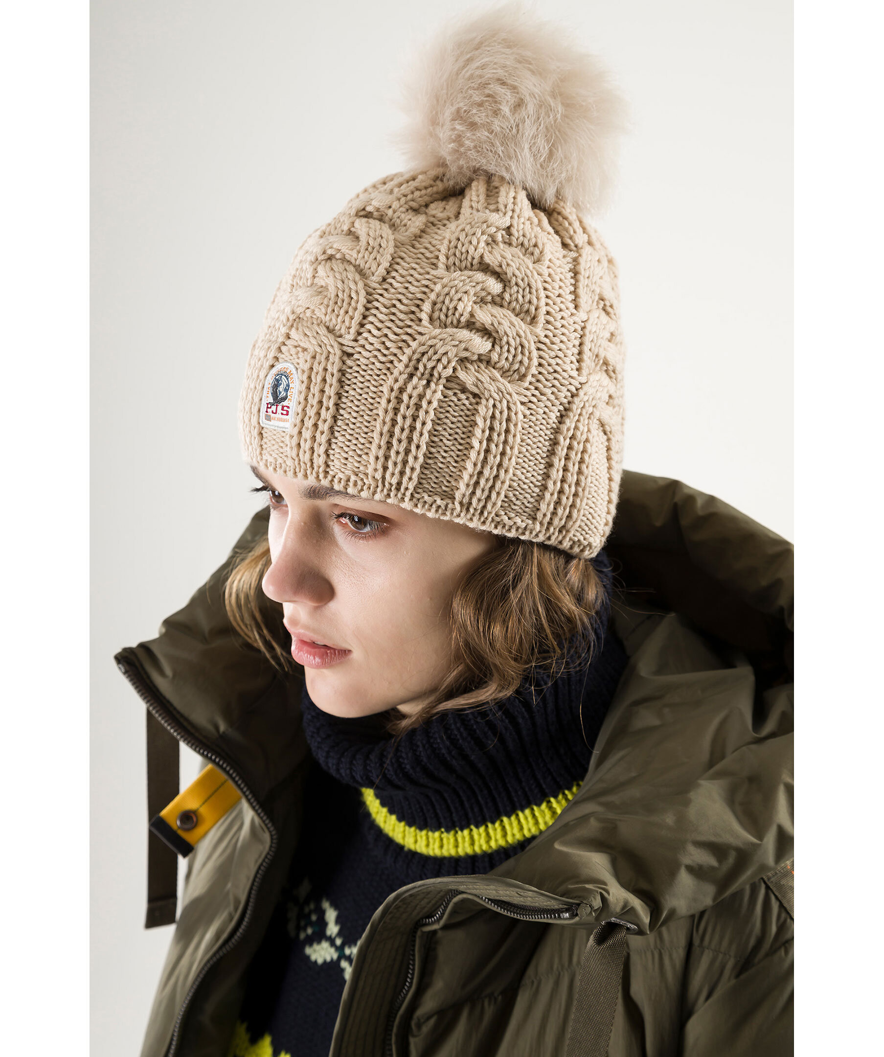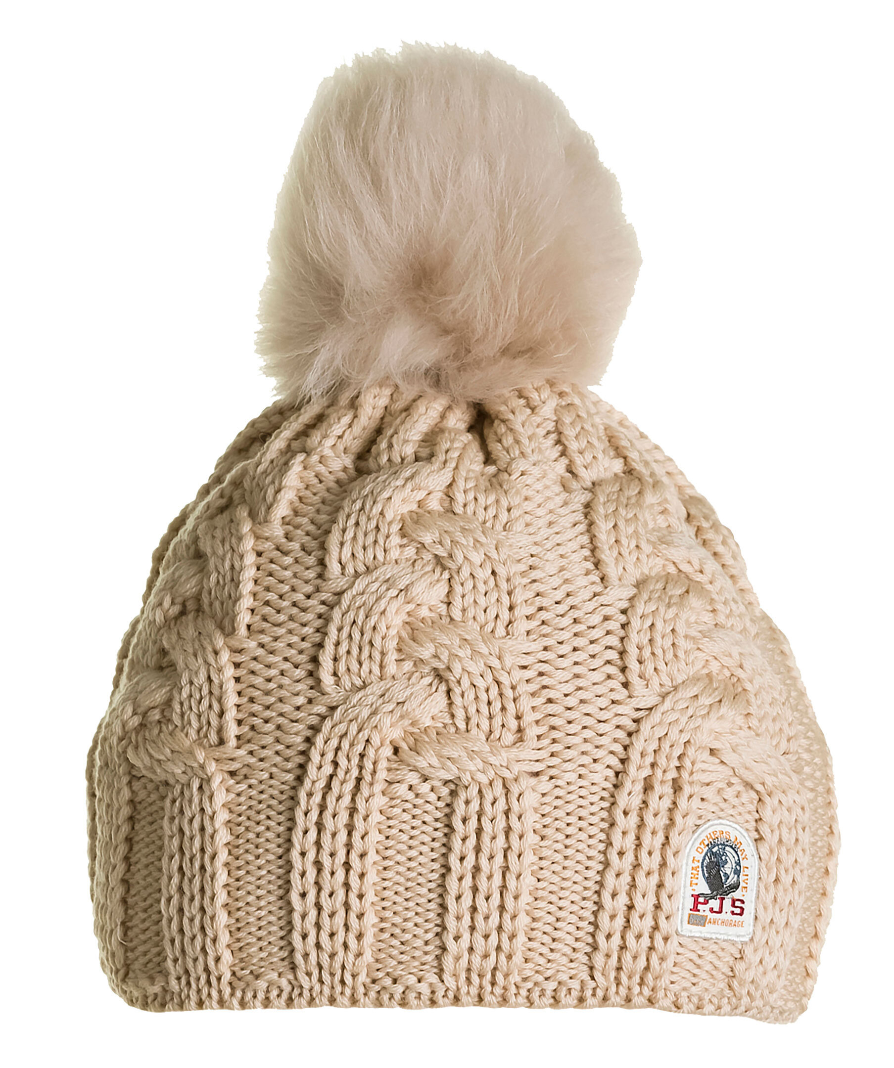 Beige, kabelstickad mössa med svart tofs i konstpäls upptill från Parajumpers. Bred ribbad mudd och liten patch med logotyp fram. Tillverkad i ull och har ett mysigt fleecefoder i polyester.