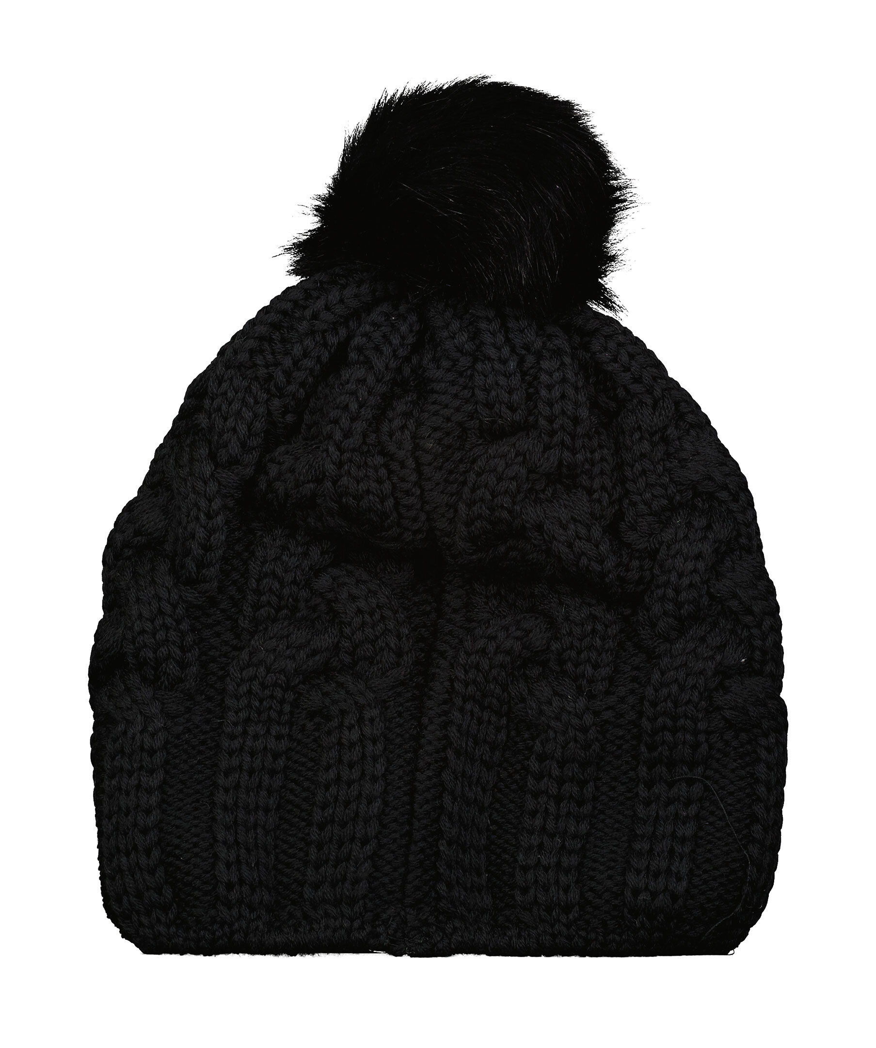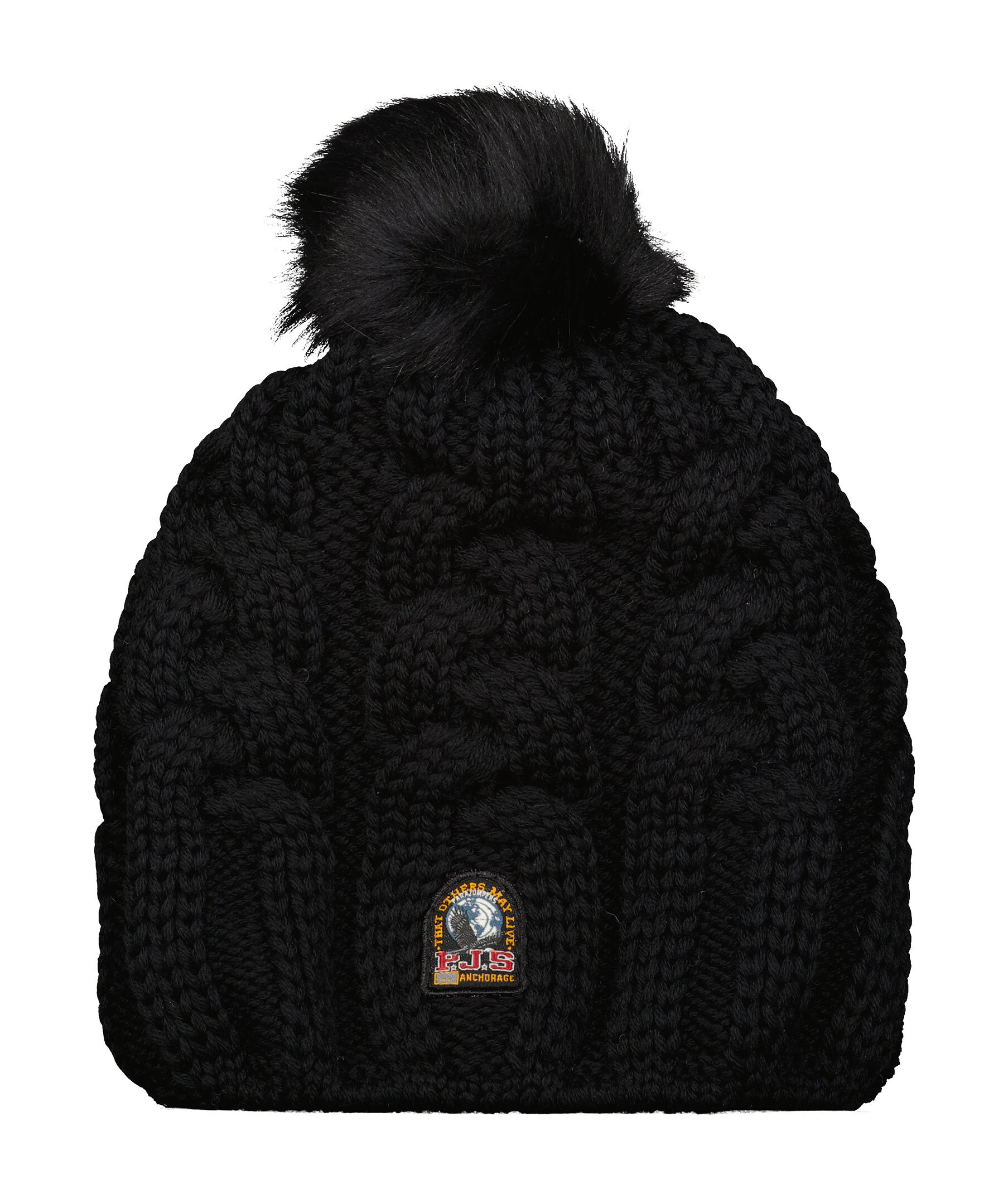 Svart kabelstickad mössa från Parajumpers. Mössan har en avtagbar pom pom på toppen. Tillverkad av 100% ull med en insida av polyester. Liten patch-logotyp på framsidan.