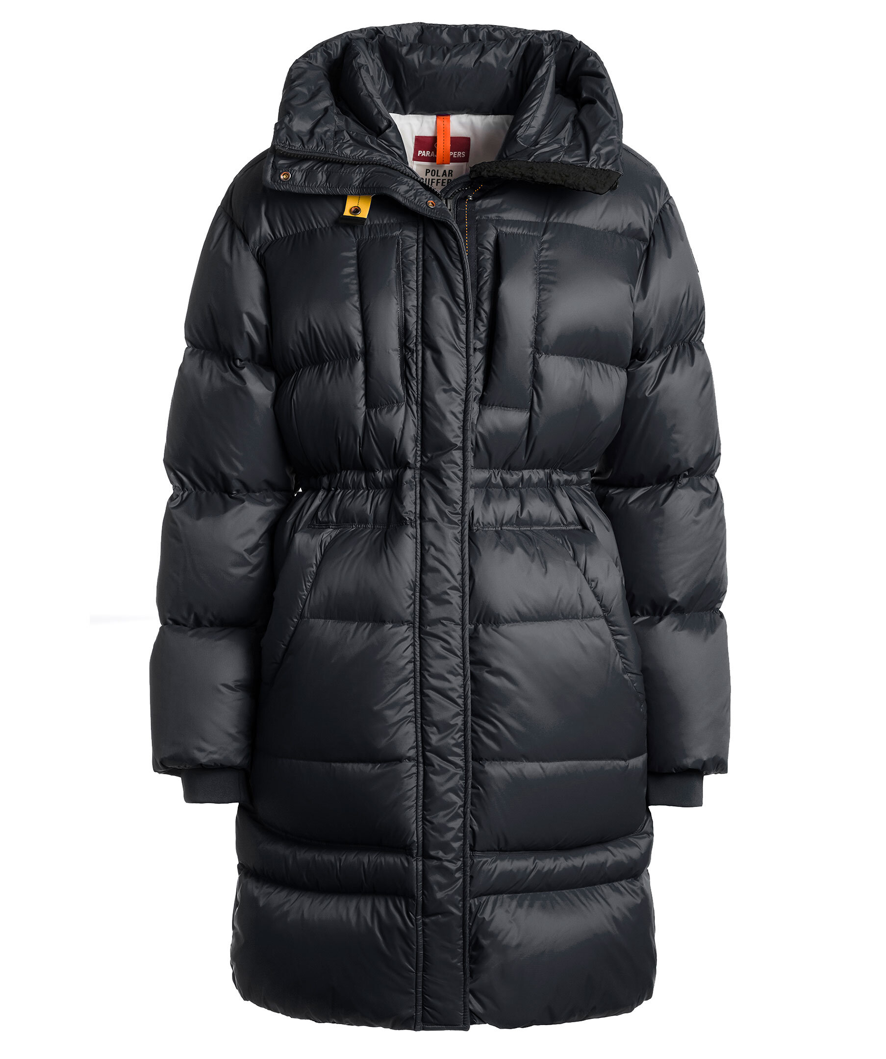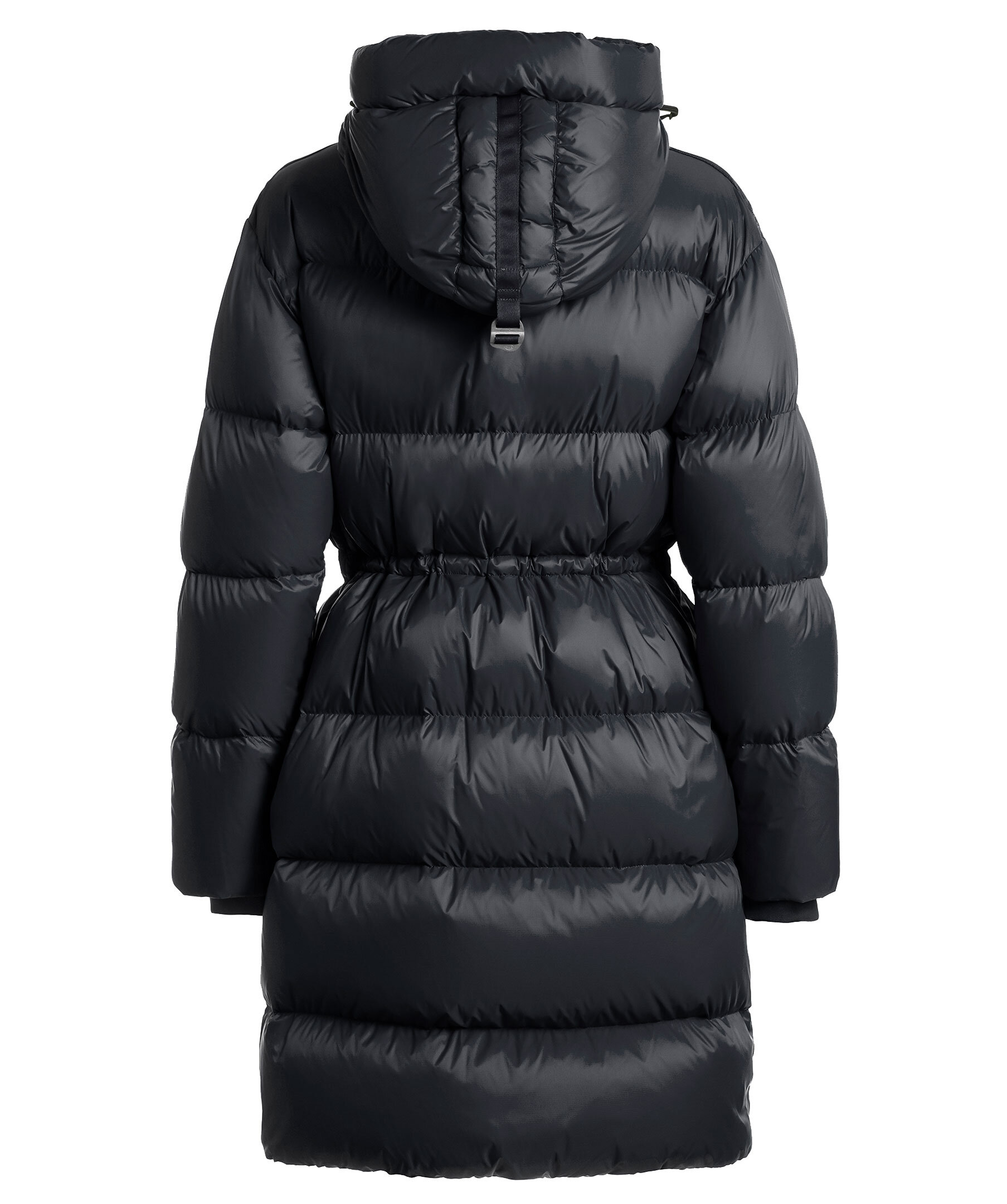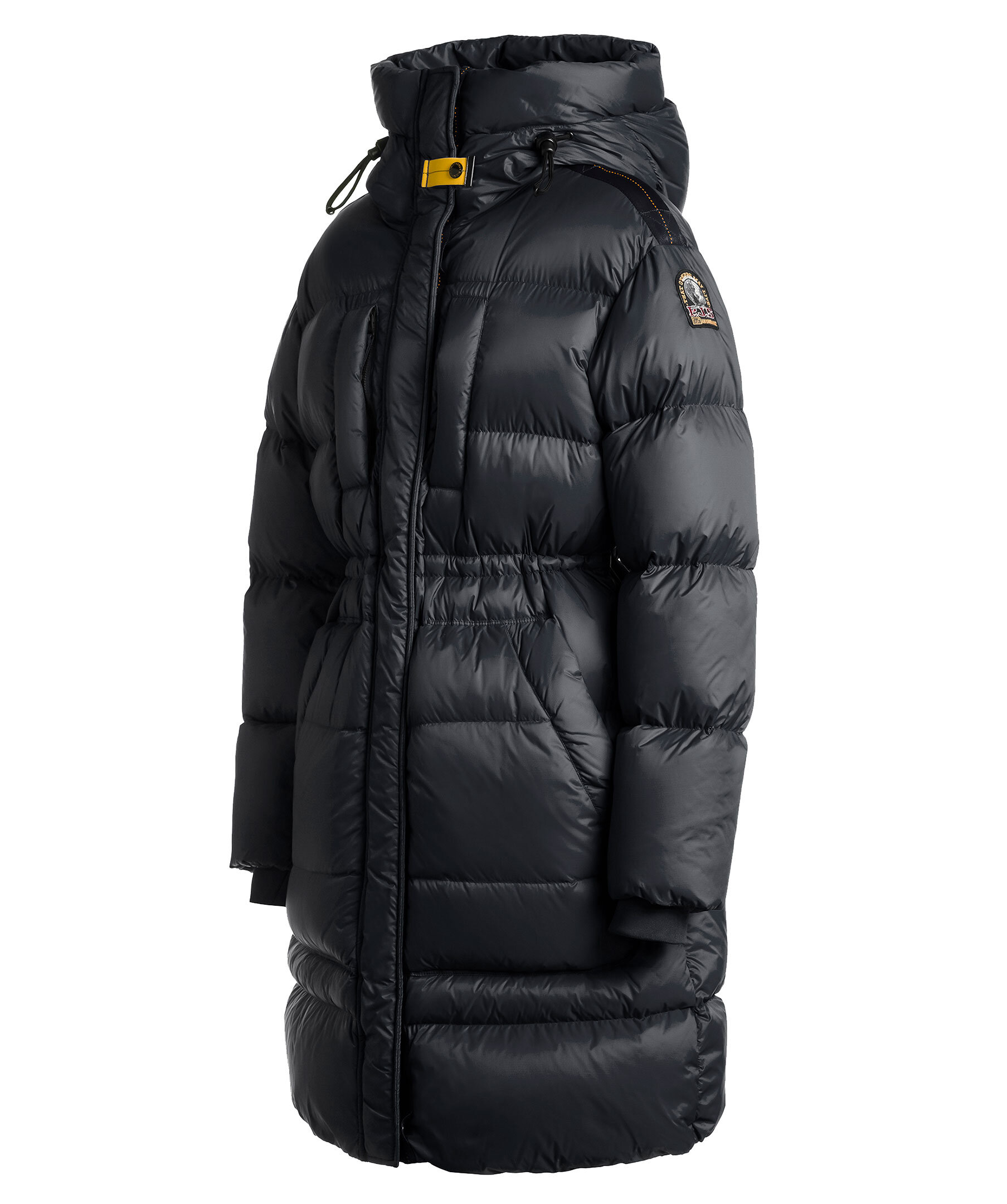 Svart, lång dunjacka från Parajumpers. Stängs framtill med tvåvägsdragkedja och tryckknappar. Två öppna fickor fram, två bröstfickor med dragkedja och två innerfickor i mech. Muddar i ärmslut, gult spänne i kragen samt patch på vänster ärm med logotyp. Dragsko i luvan och i midjan för en fin passform.