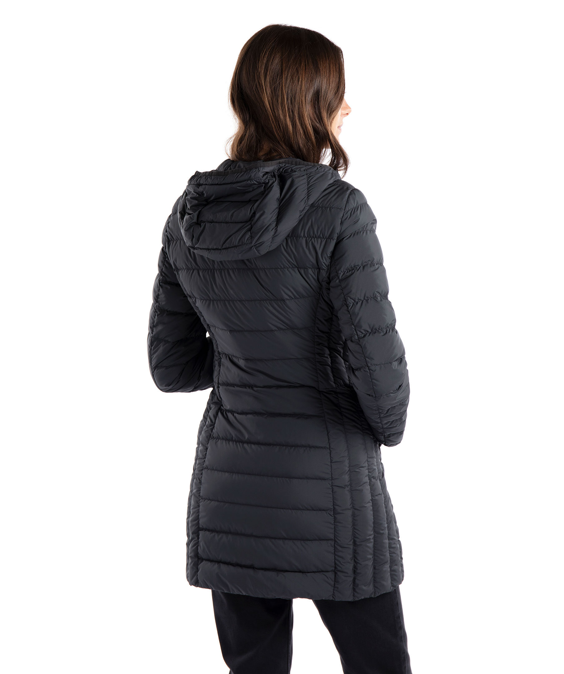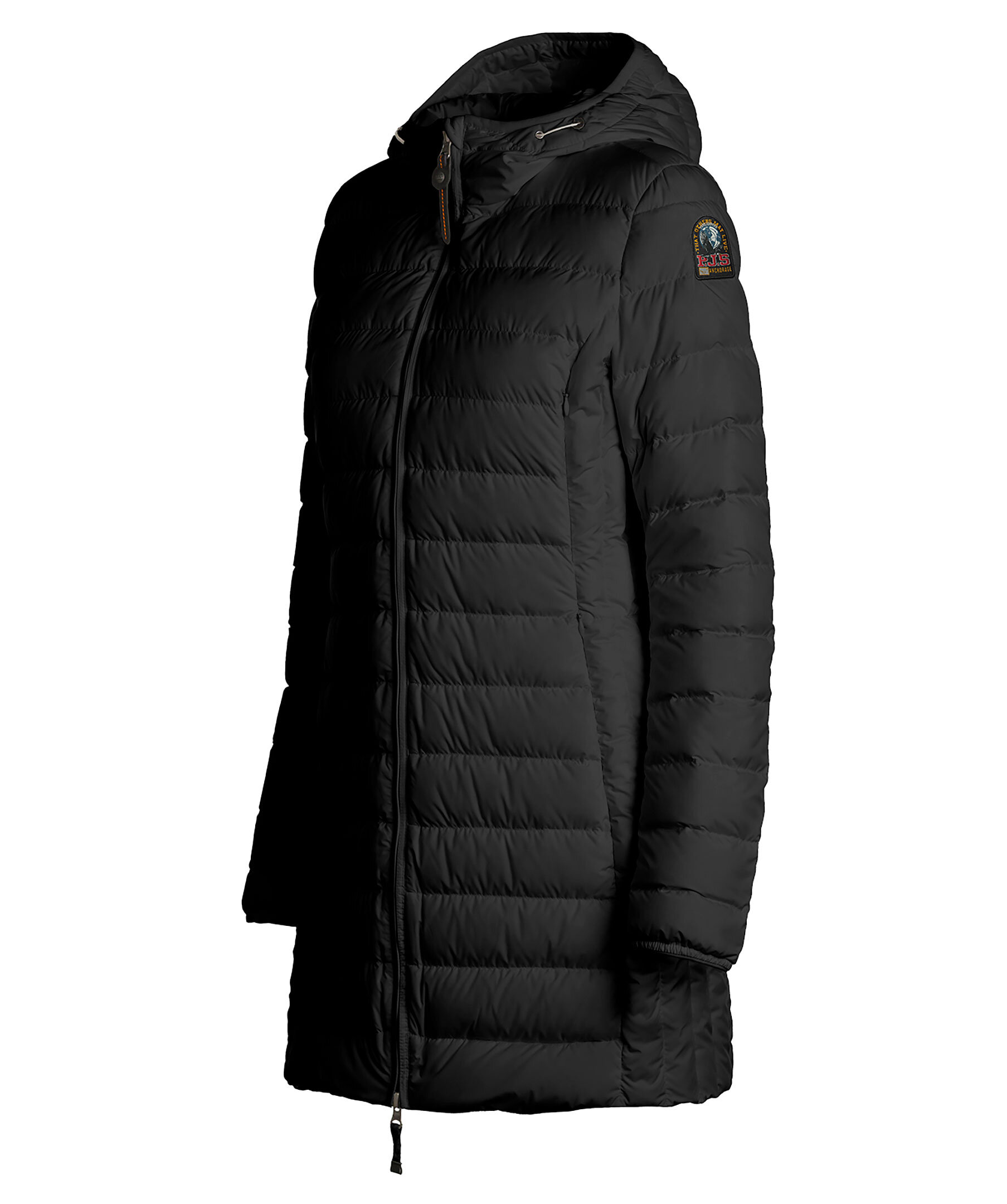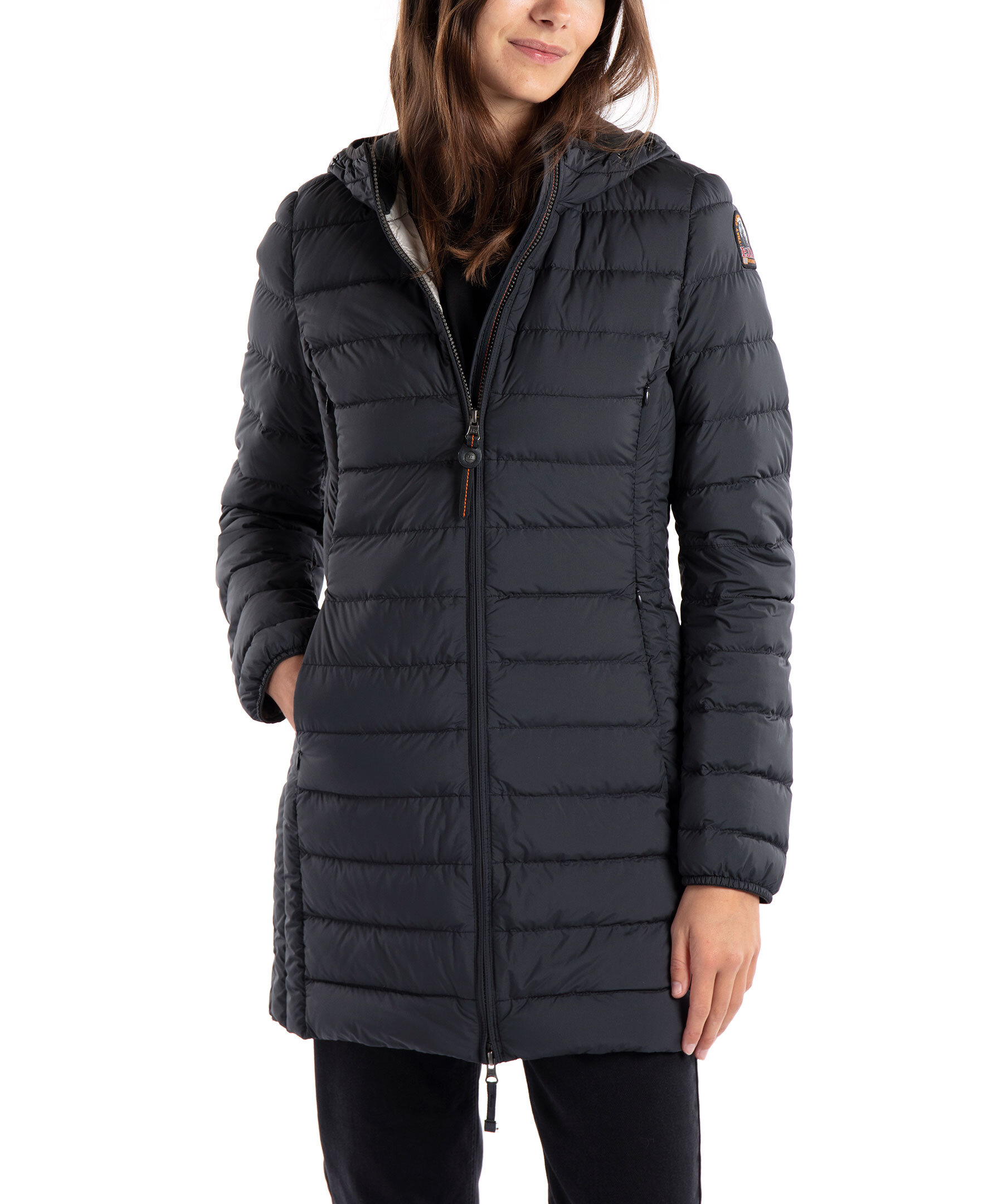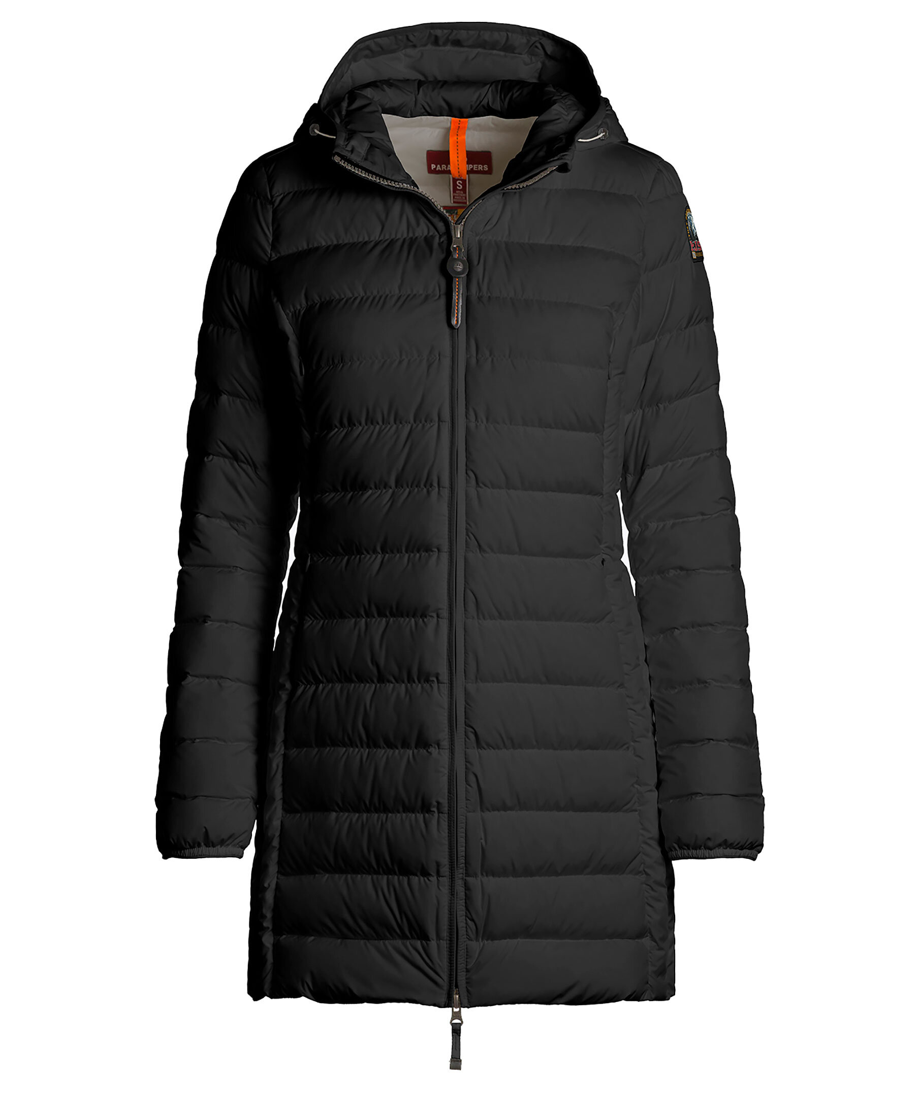 Svart, figursydd lättviktsdunjacka från Parajumpers i längre modell. Yttertyg i polyester. Två framfickor och två bröstfickor med dold dragkedja framtill och en innerficka. Luva med dragsko samt broderad ikonisk tygpatch på vänster ärm och ventilationshål vid armhålorna. Stängs med tvåvägsdragkedja. Modellen är 178 cm lång och bär storlek S.