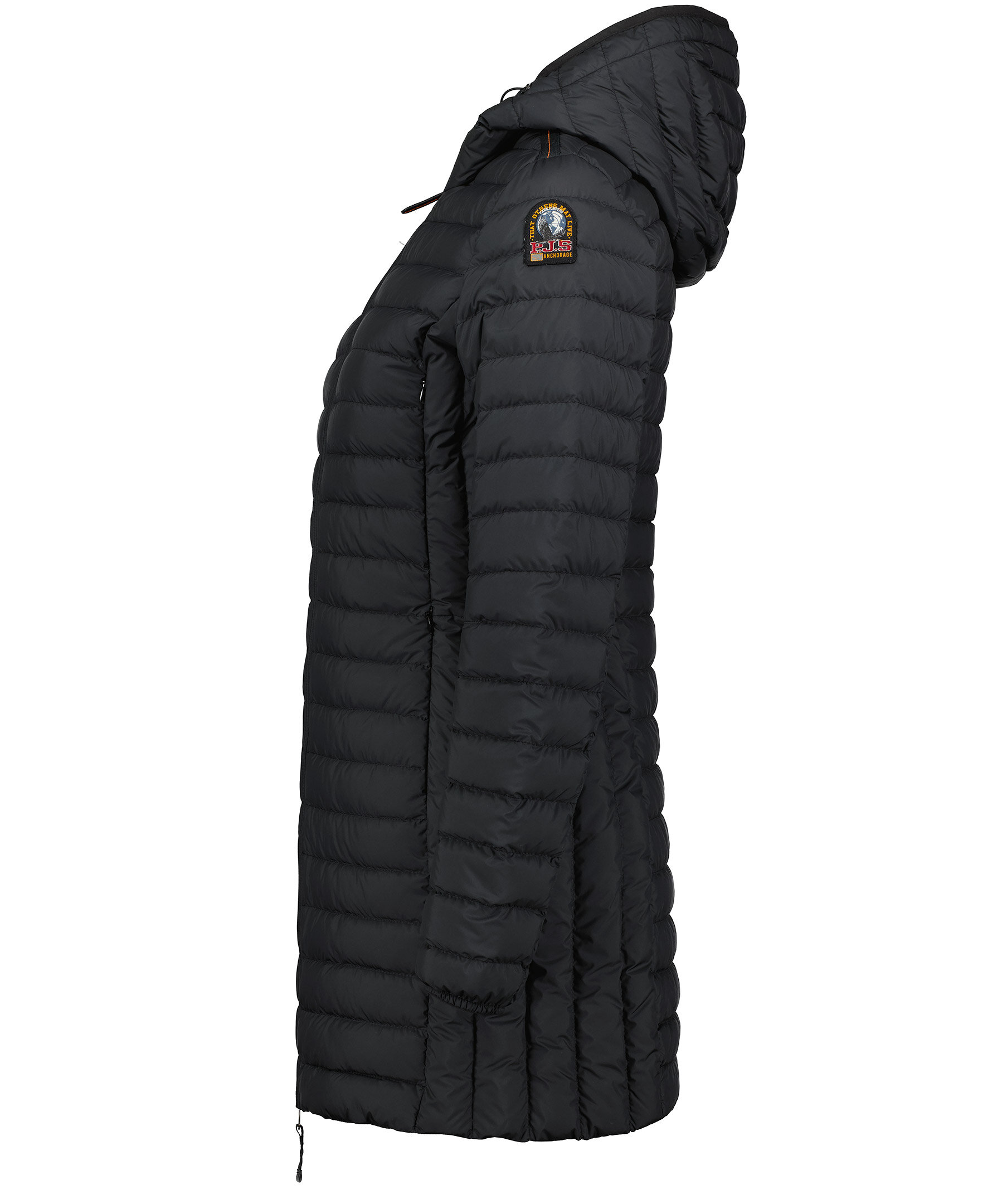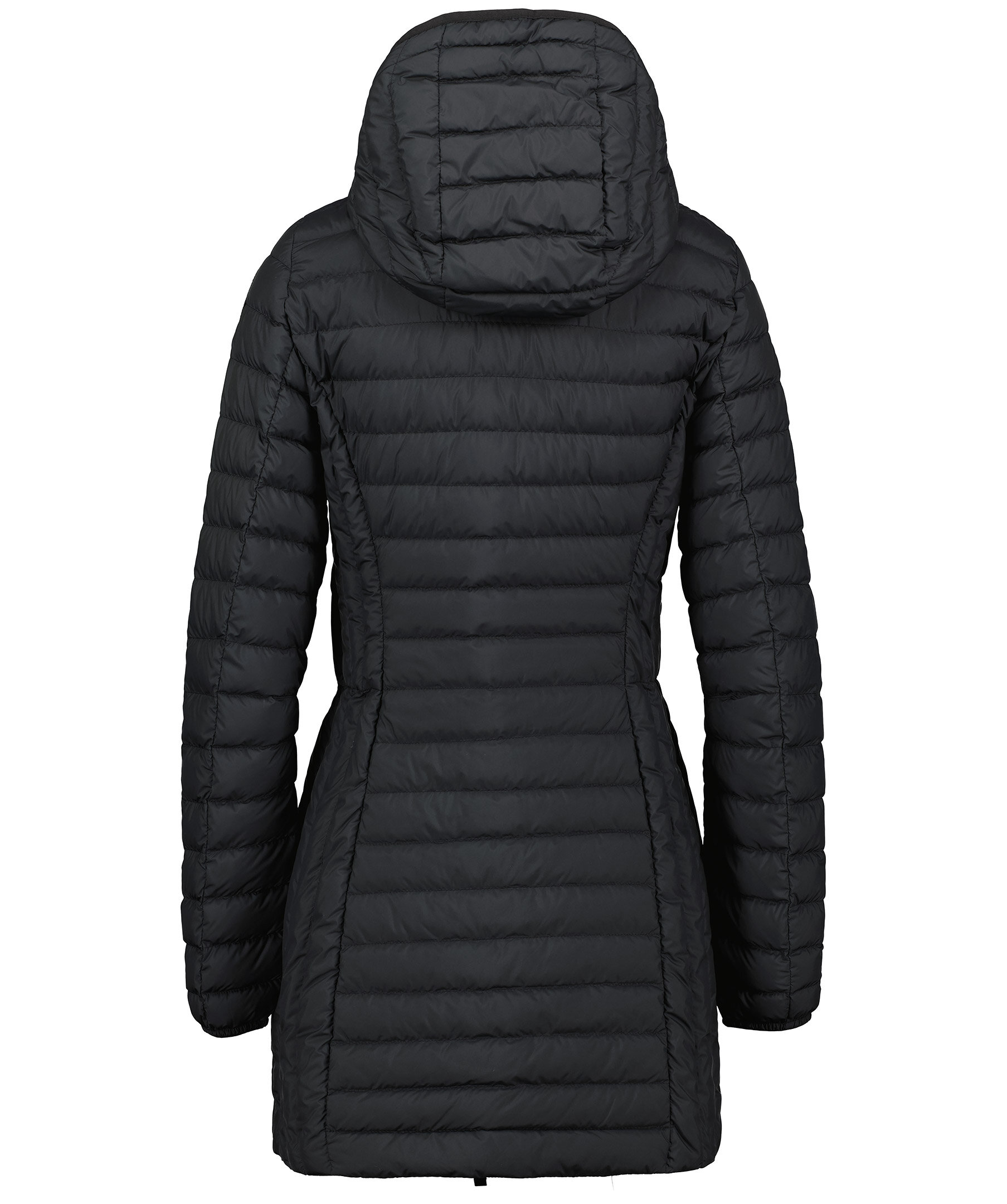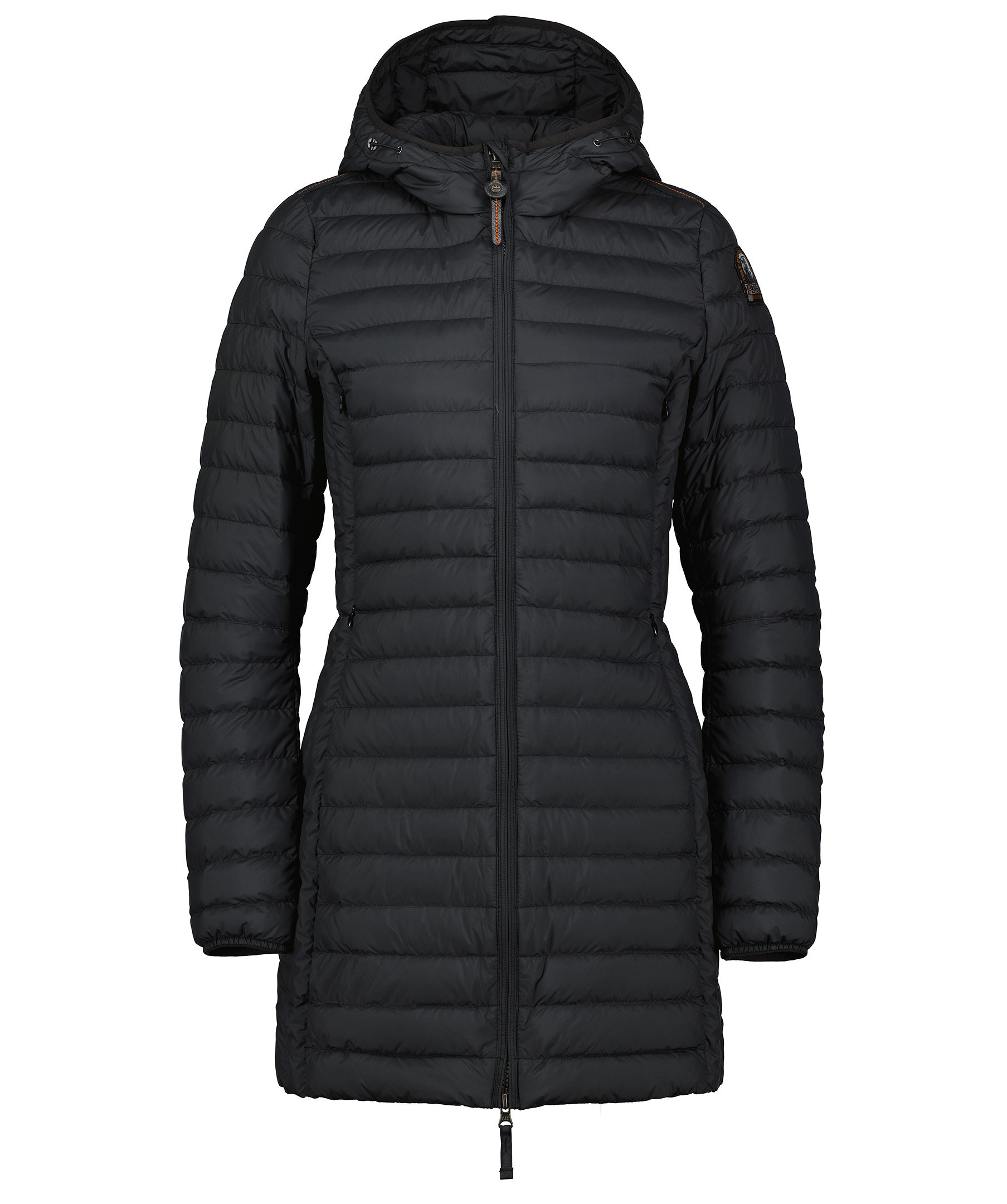 Svart, figursydd lättviktsdunjacka från Parajumpers i längre modell. Yttertyg i polyester. Två framfickor och två bröstfickor med dold dragkedja framtill och en innerficka. Luva med dragsko samt broderad ikonisk tygpatch på vänster ärm och ventilationshål vid armhålorna. Stängs med tvåvägsdragkedja. OBS! Jackan på modellen visar endast på passform och inte varans färg.