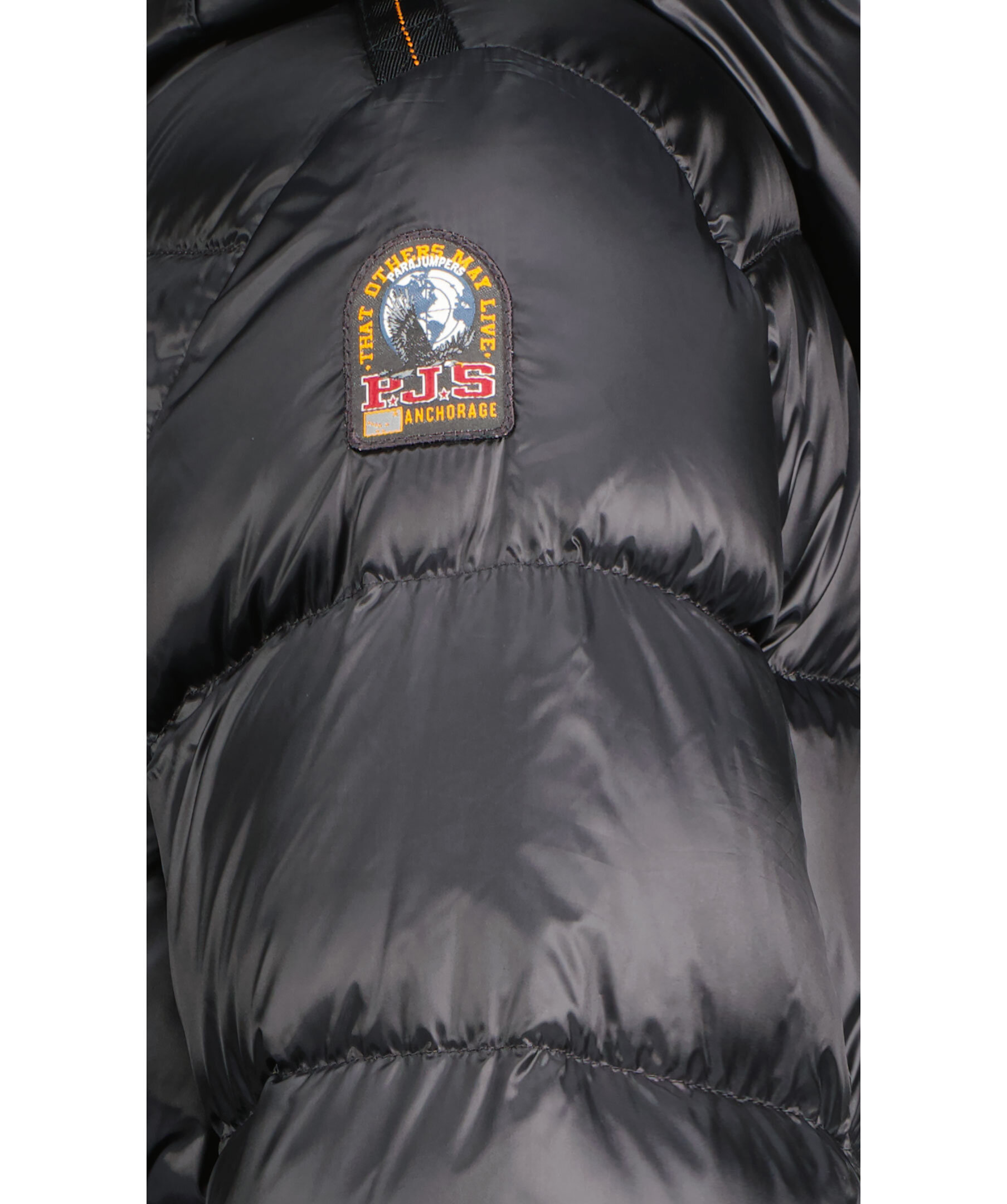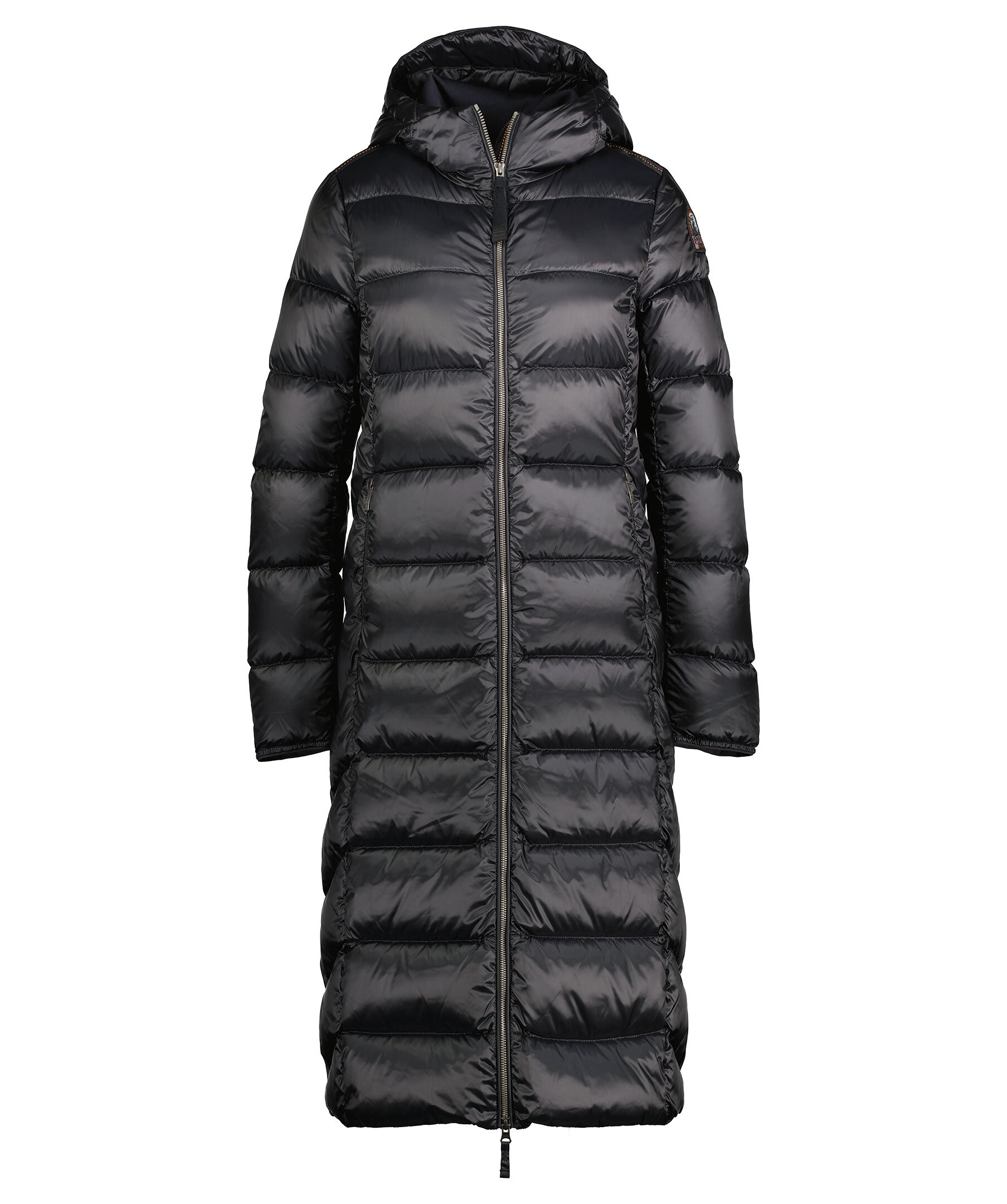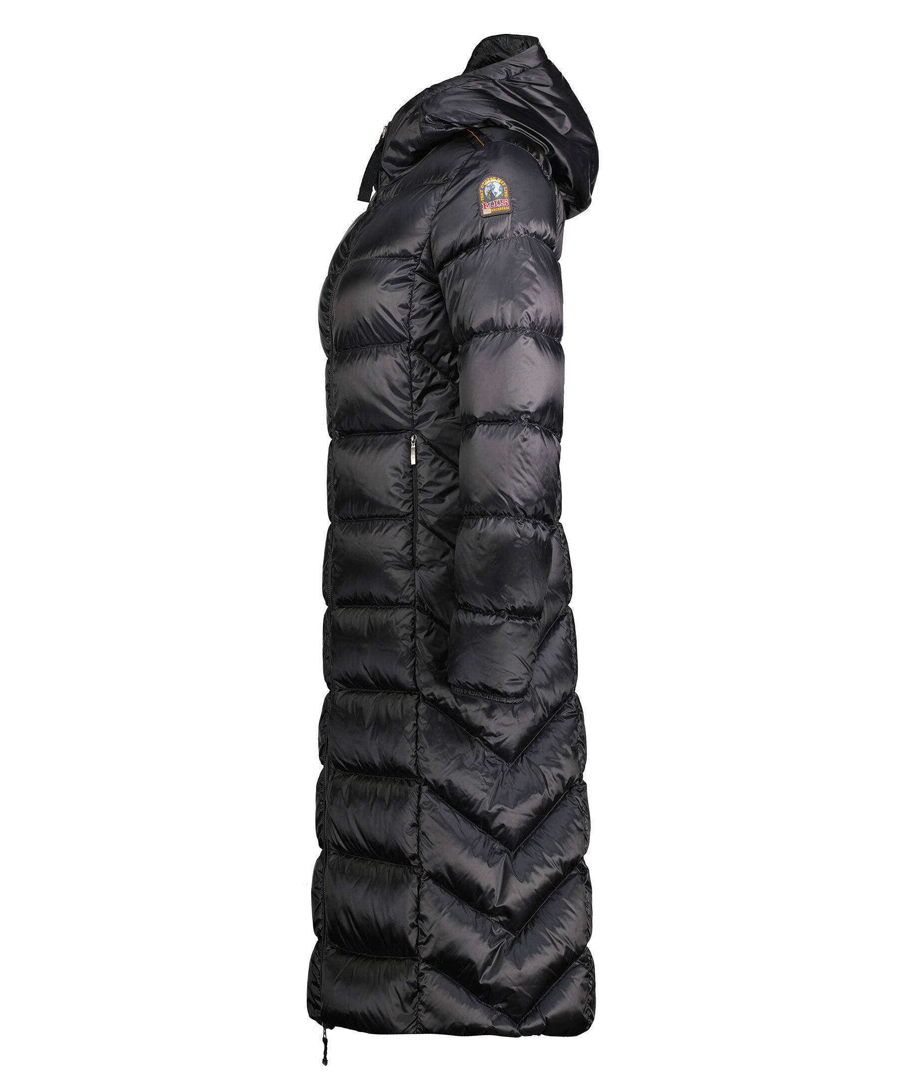 Svart quiltad knälång dunjacka från Parajumpers. Stängs framtill med tvåvägsdragkedja. Två fickor framtill med dragkedja. Smal elastisk mudd i ärmslut. Patch med logotyp på vänster ärm. Jackans färg skiftar till det mörkare eller ljusare beroende på vad det är för ljus.