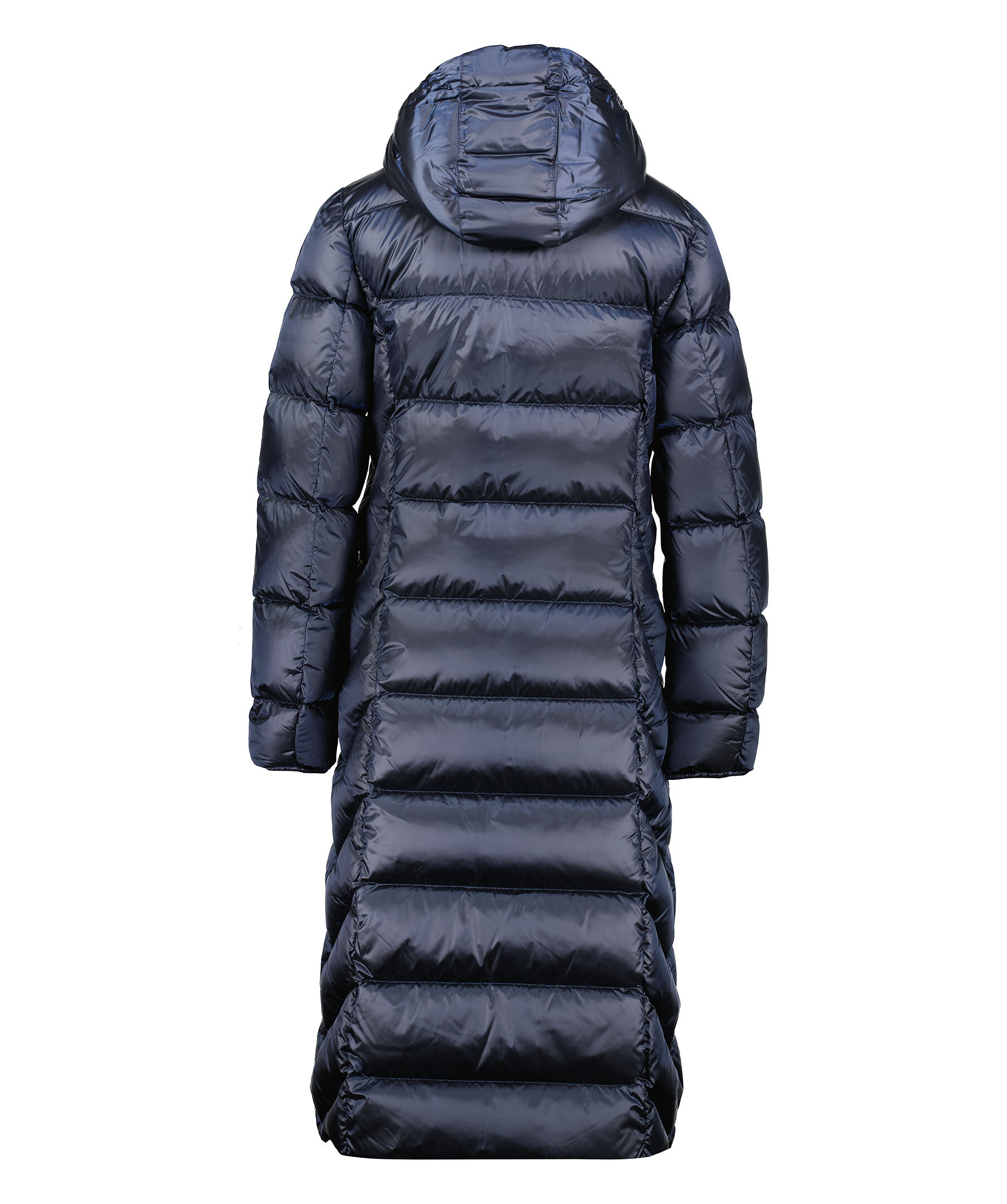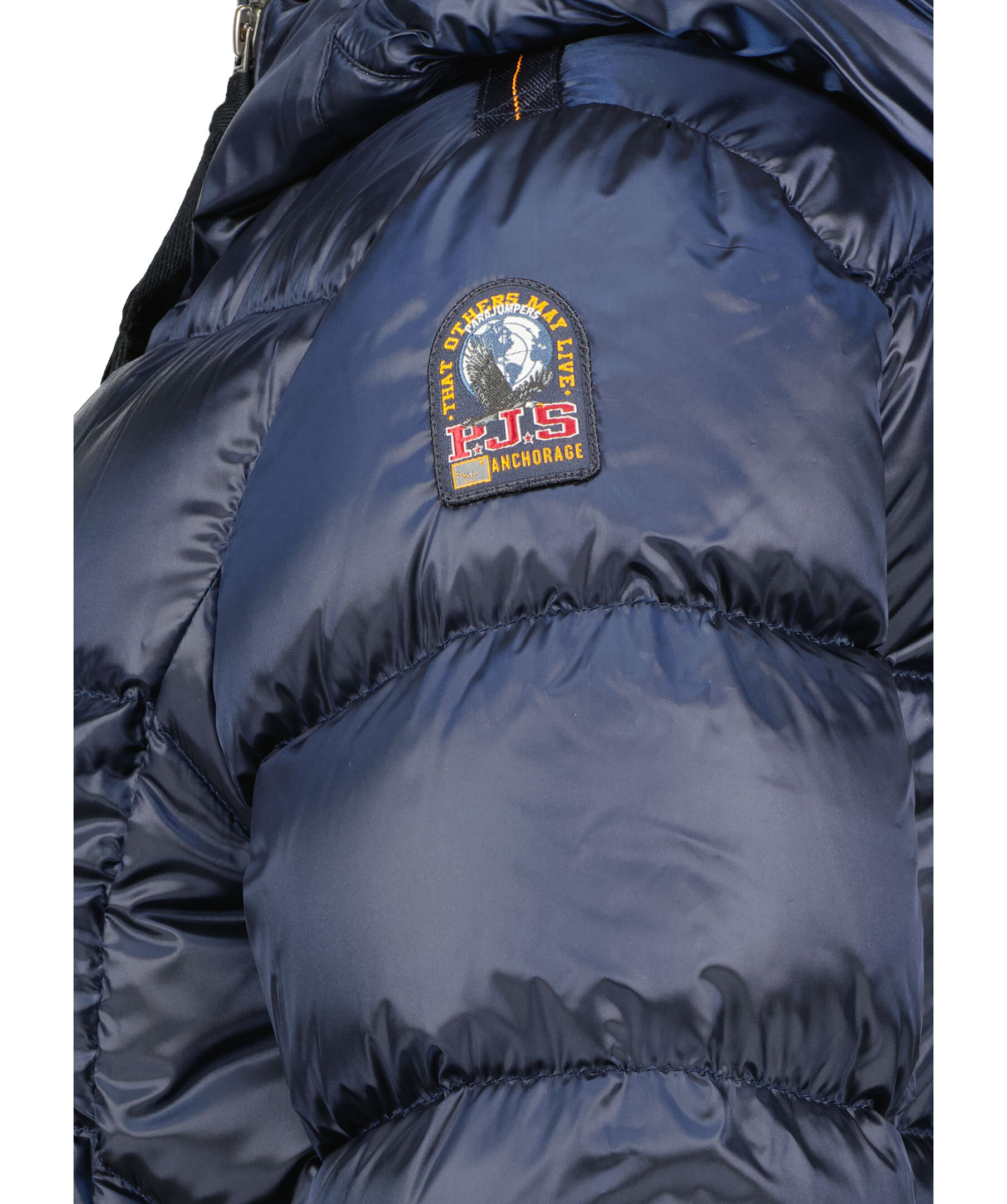 Marinblå, lång pufferjacka med huva från Parajumpers. Tillverkad i glänsande nylon-polyestertwill. Jackan stängs med tvåvägsdragkedja och har en patch-logotyp på vänster ärm samt två dragkedjefickor på utsidan. Tillverkad i en polyesterblandning. ■ OBS! Modellbilderna visar endast passform