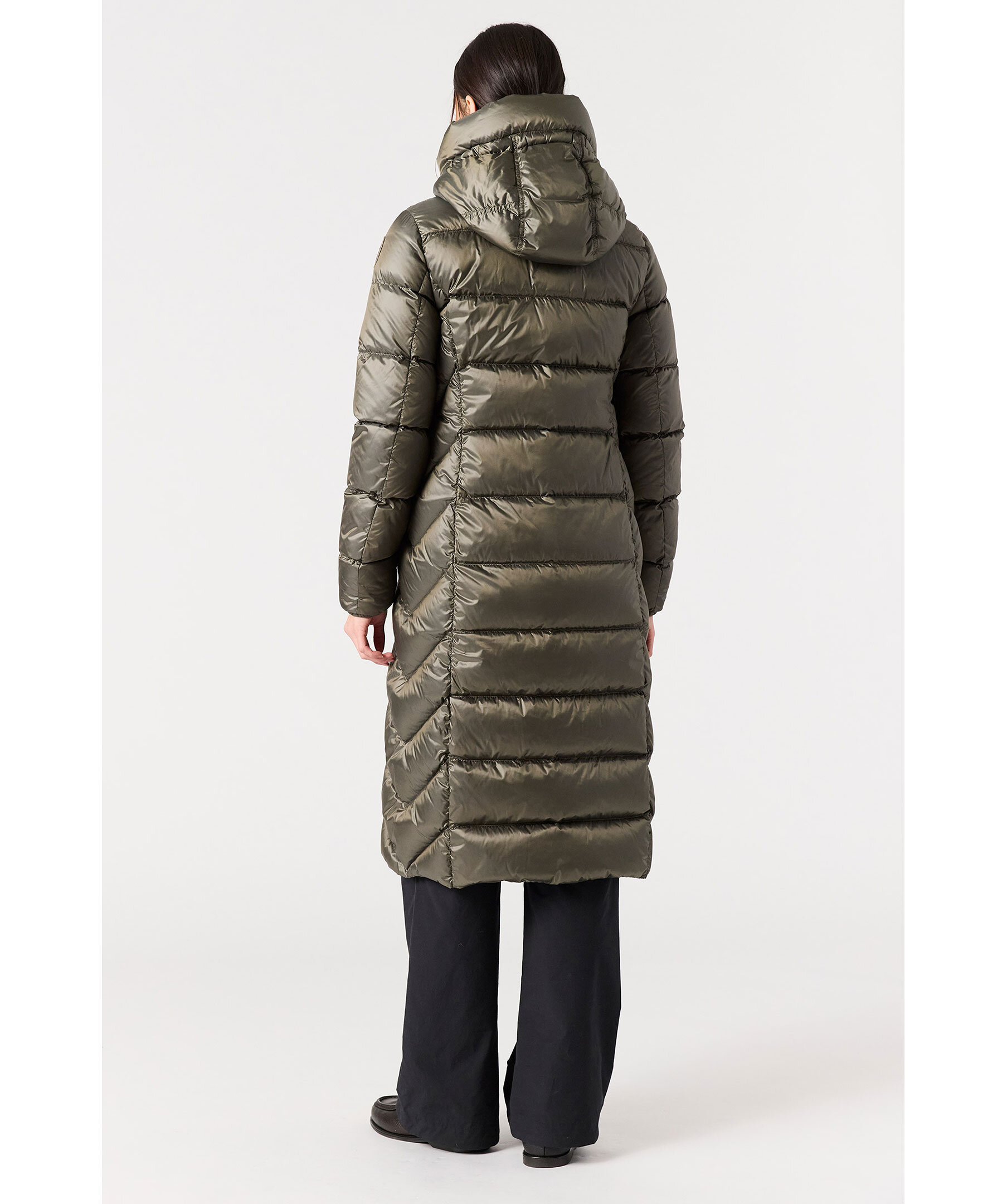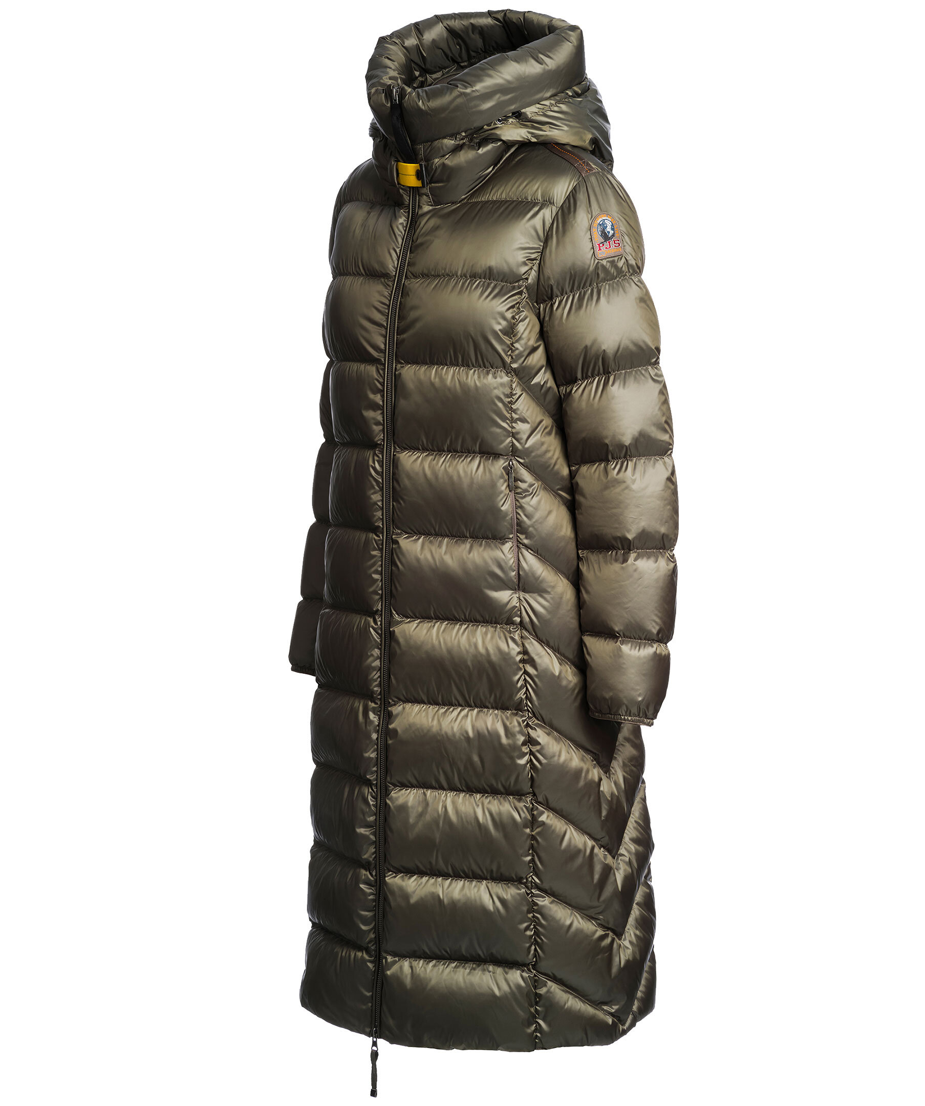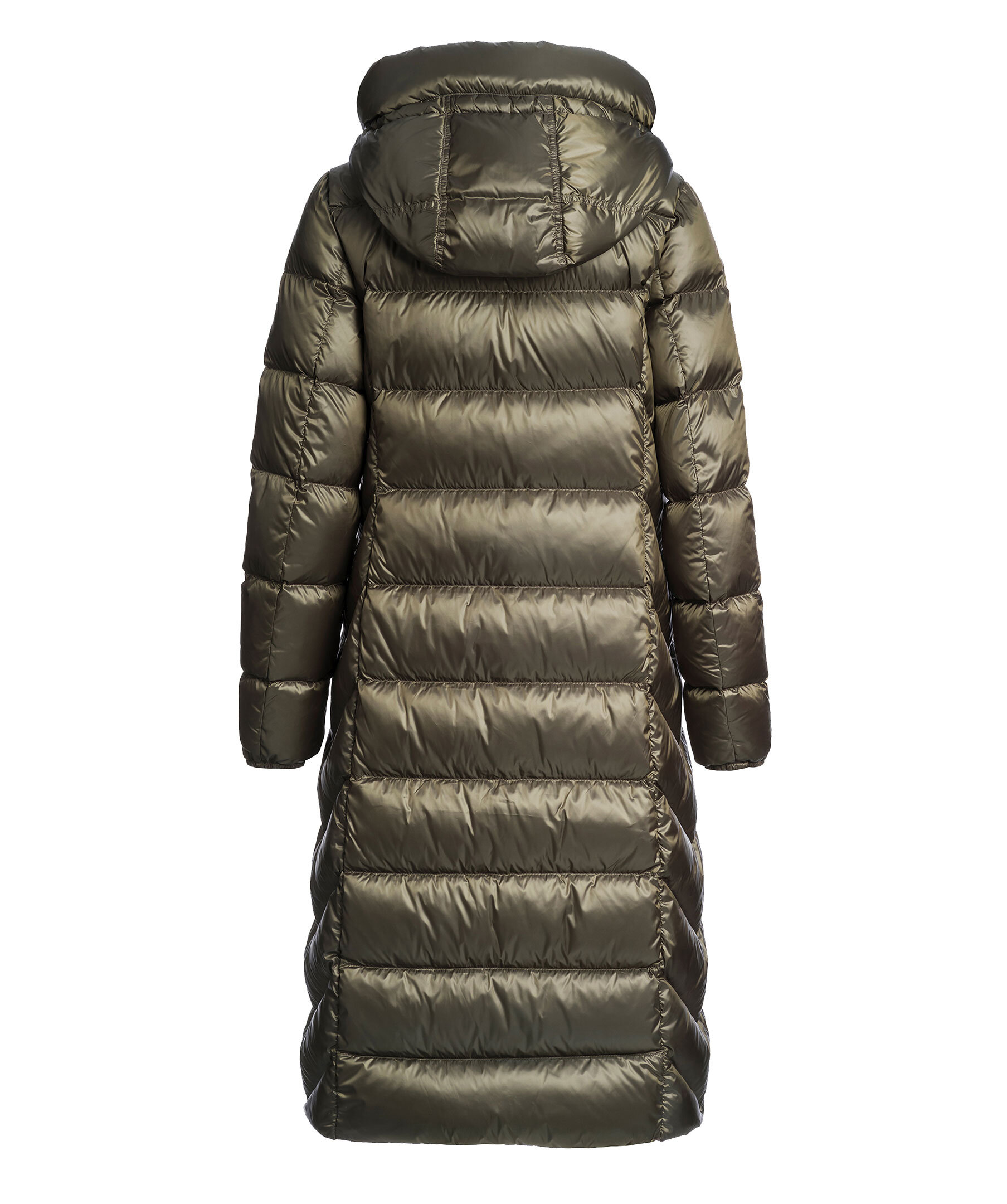 Olivgrön, lång pufferjacka med huva från Parajumpers. Tillverkad i glänsande nylon-polyestertwill. Jackan stängs med tvåvägsdragkedja och har en patch-logotyp på vänster ärm samt två dragkedjefickor på utsidan. Tillverkad i en polyesterblandning.