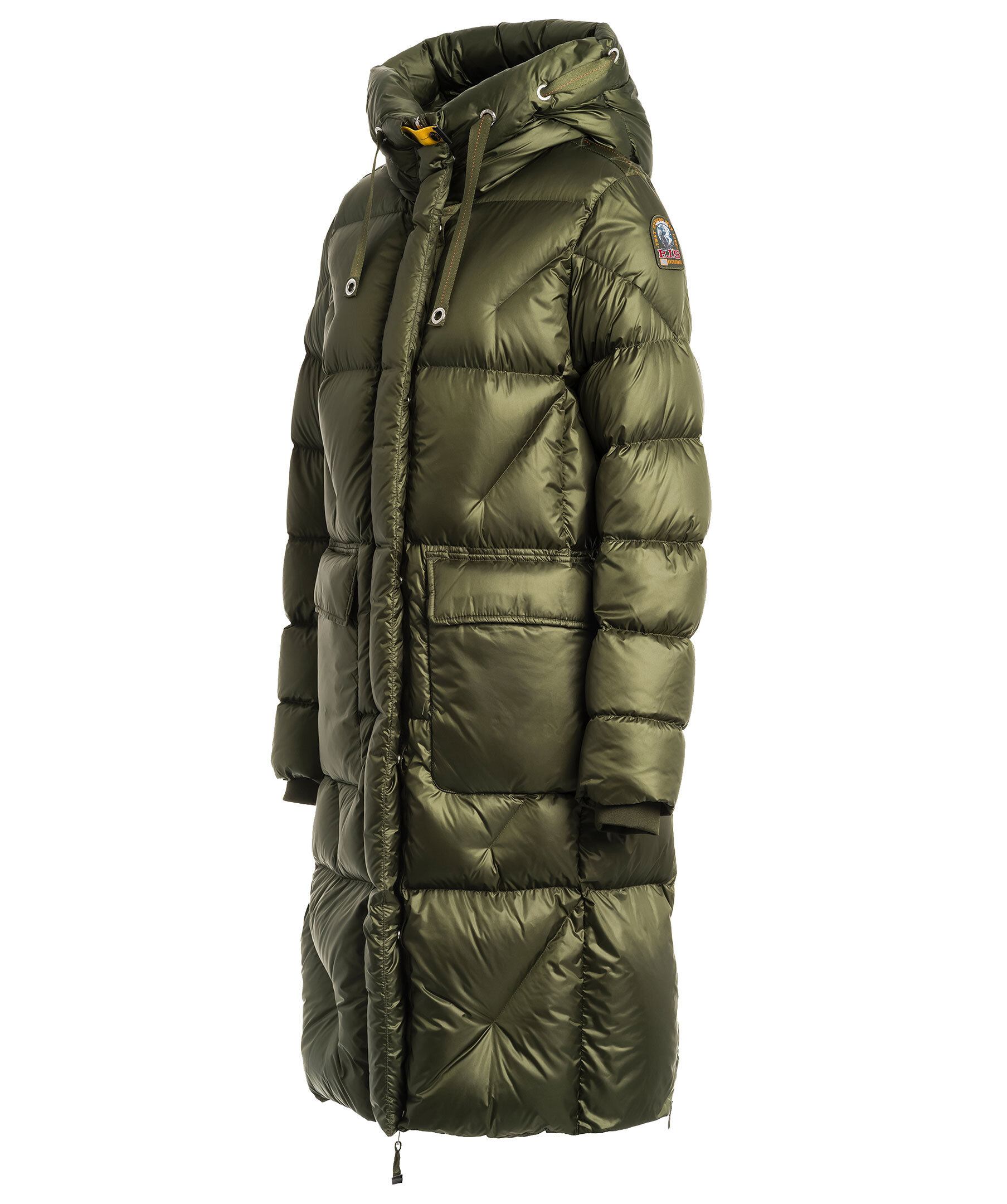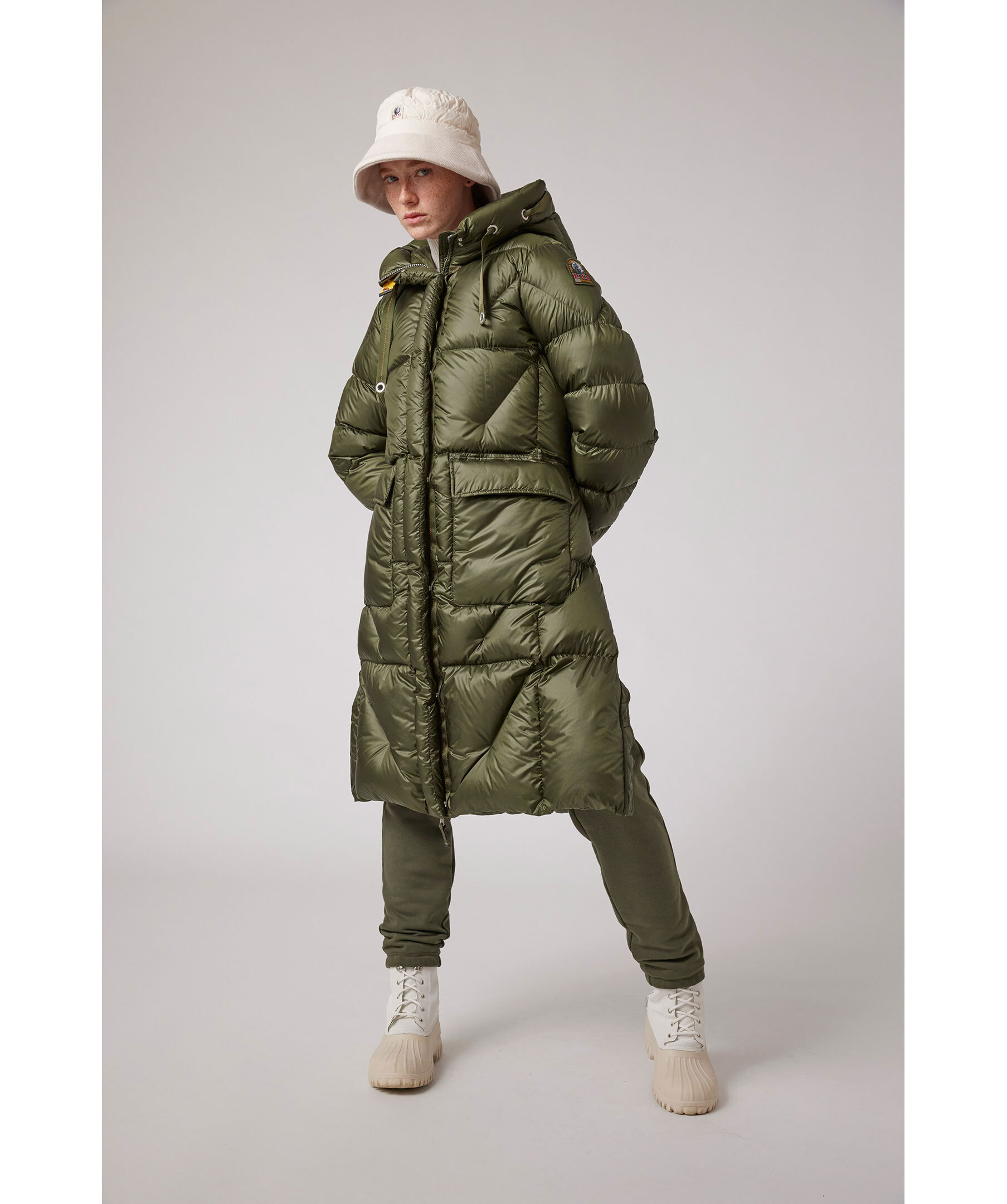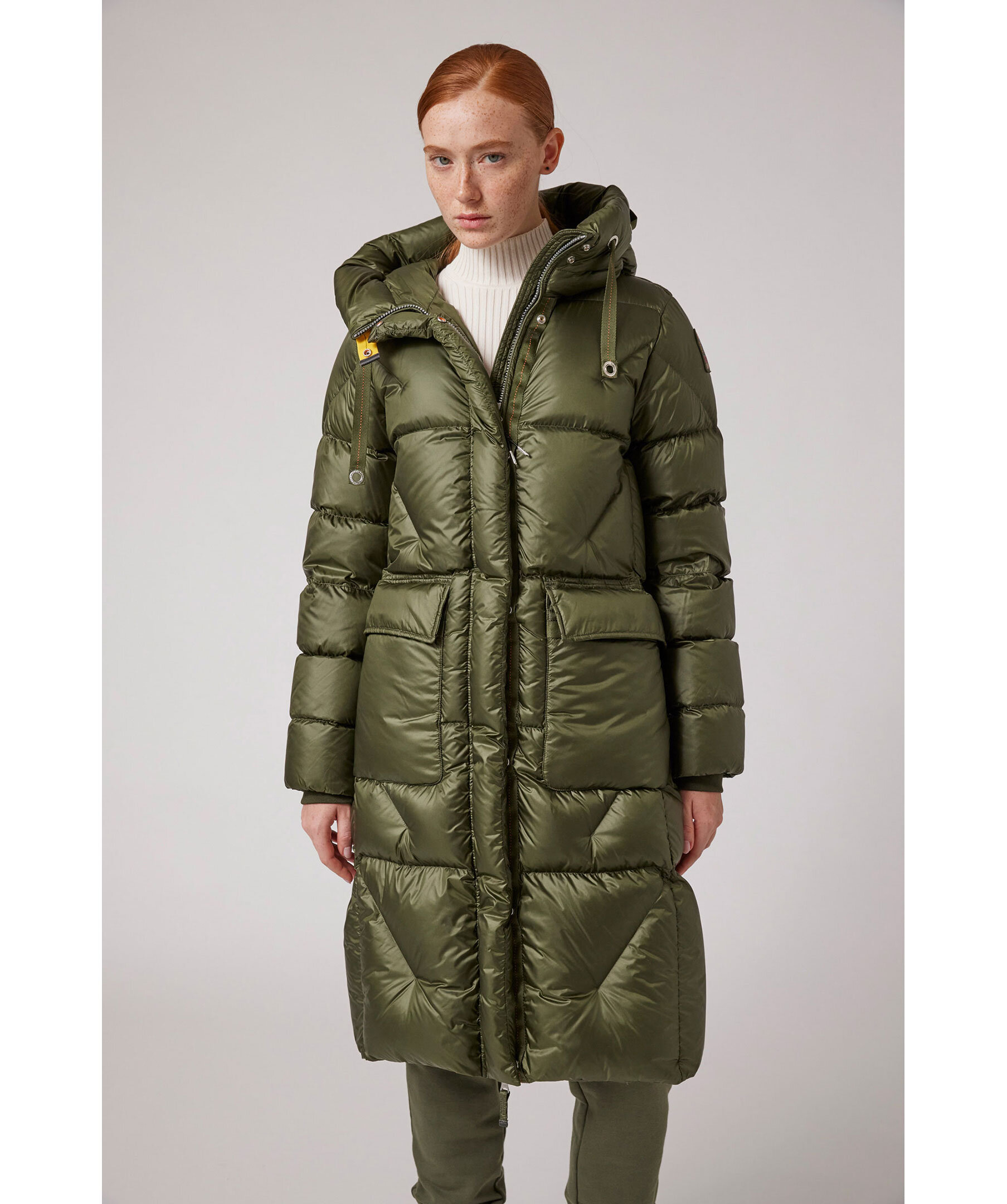 Olivgrön, glansig och lång vinterjacka från Parajumpers. Jackan stängs med dold tvåvägsdragkedja och tryckknappar och har huva med dragkedja och två stora fickor med lock samt patch med logotyp på vänster ärm. Tillverkad av polyamid med dunfyllning.