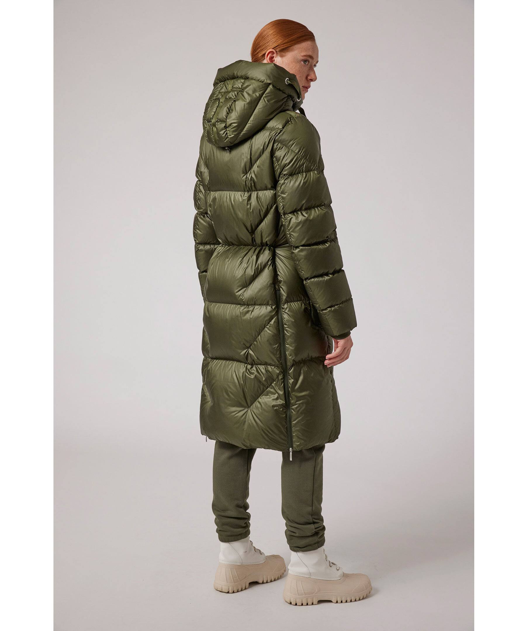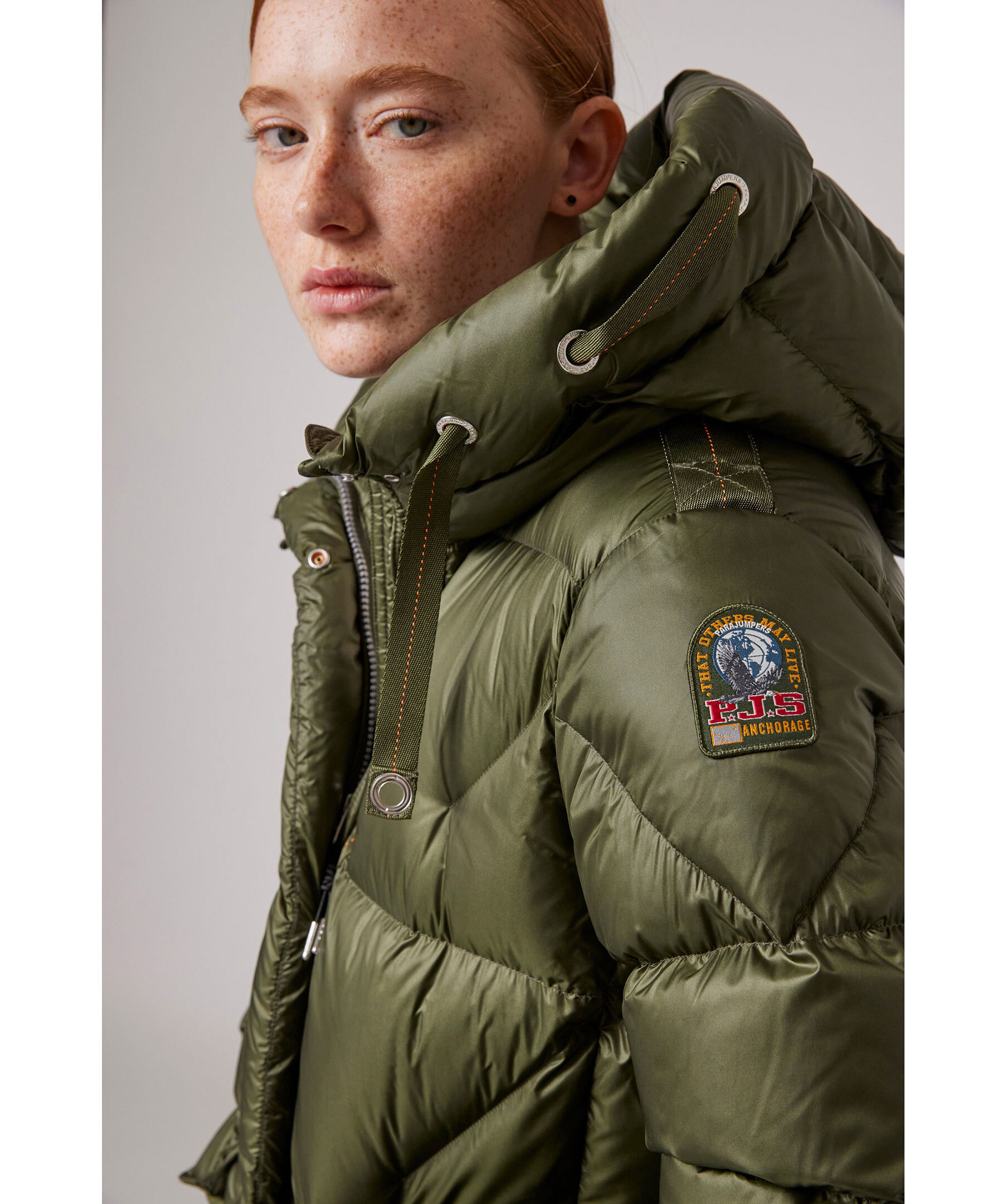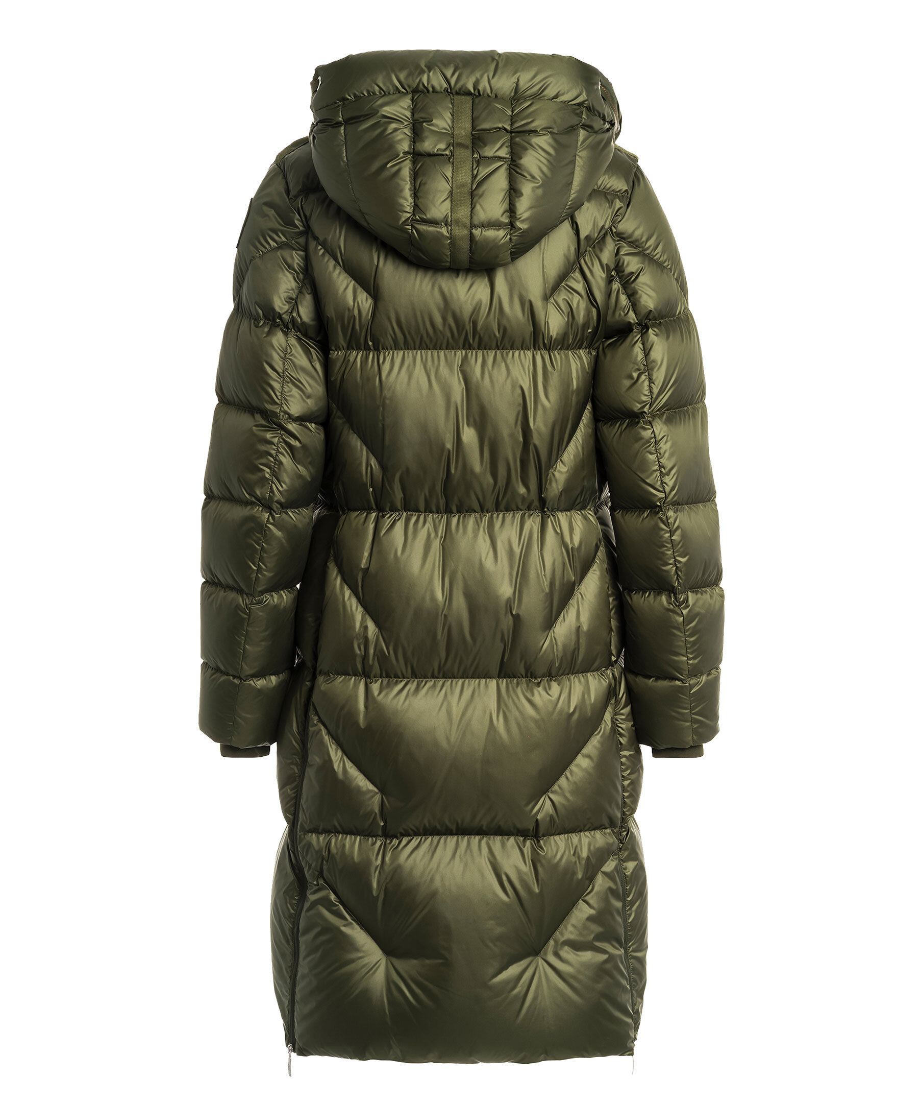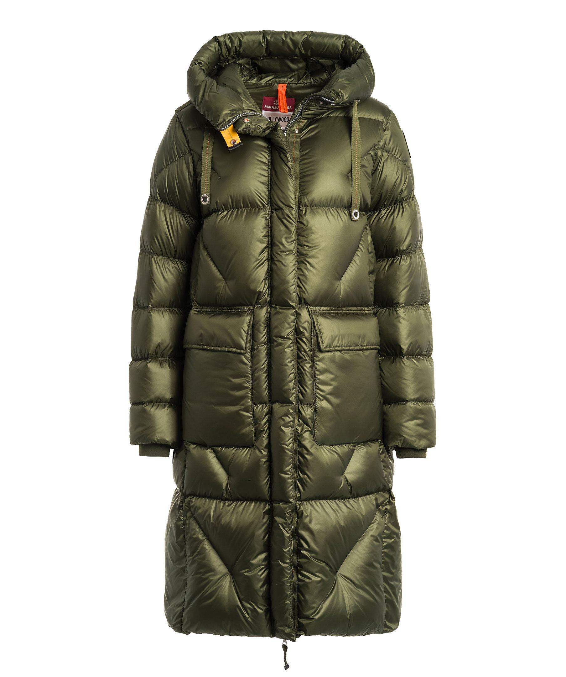Olivgrön, glansig och lång vinterjacka från Parajumpers. Jackan stängs med dold tvåvägsdragkedja och tryckknappar och har huva med dragkedja och två stora fickor med lock samt patch med logotyp på vänster ärm. Tillverkad av polyamid med dunfyllning.