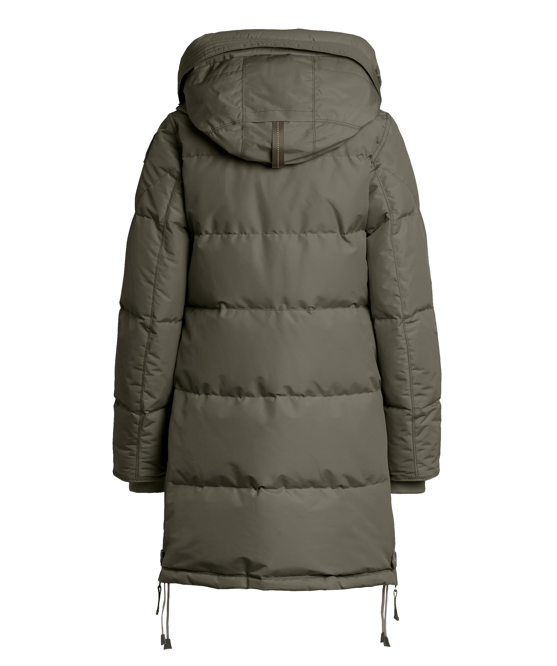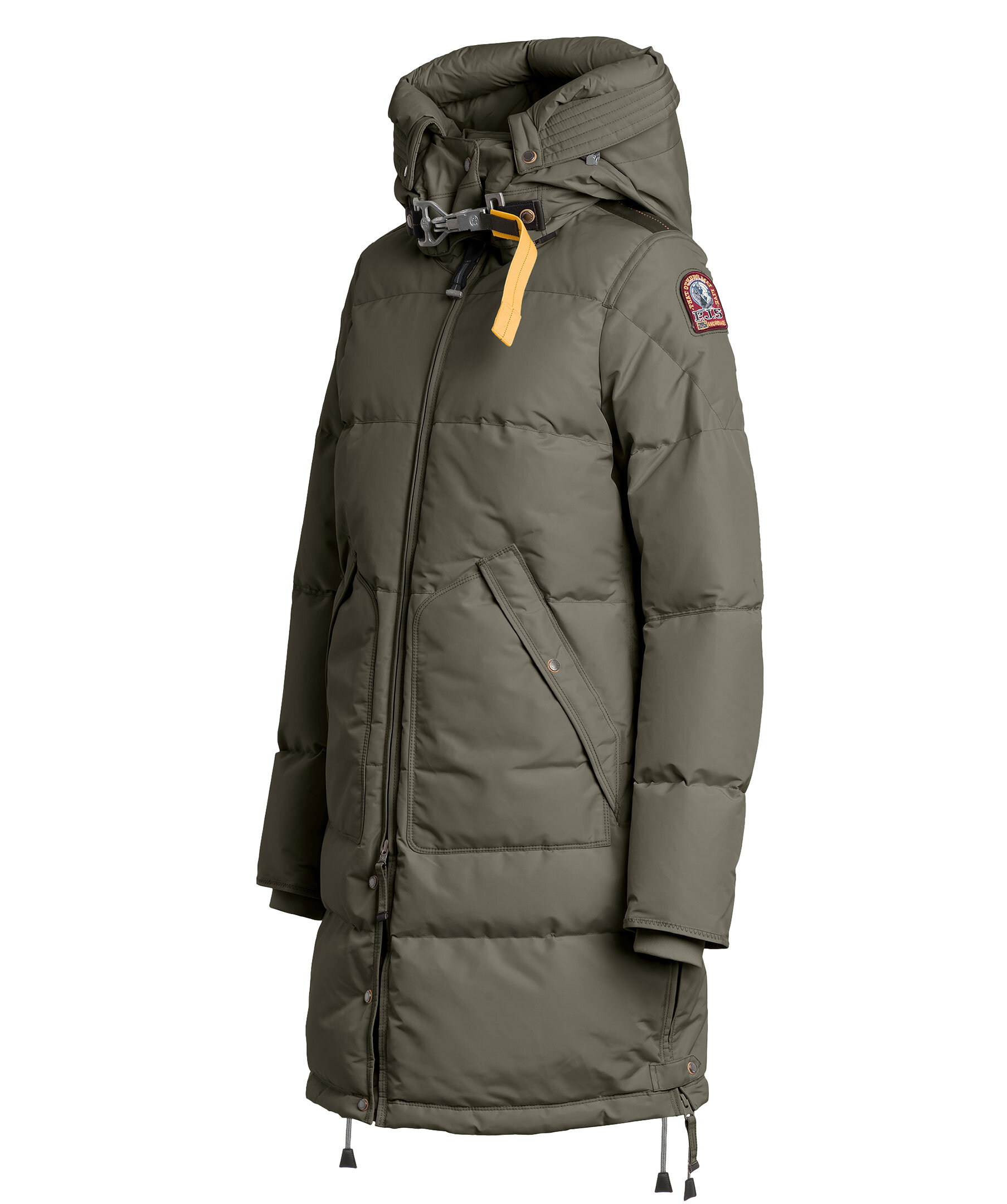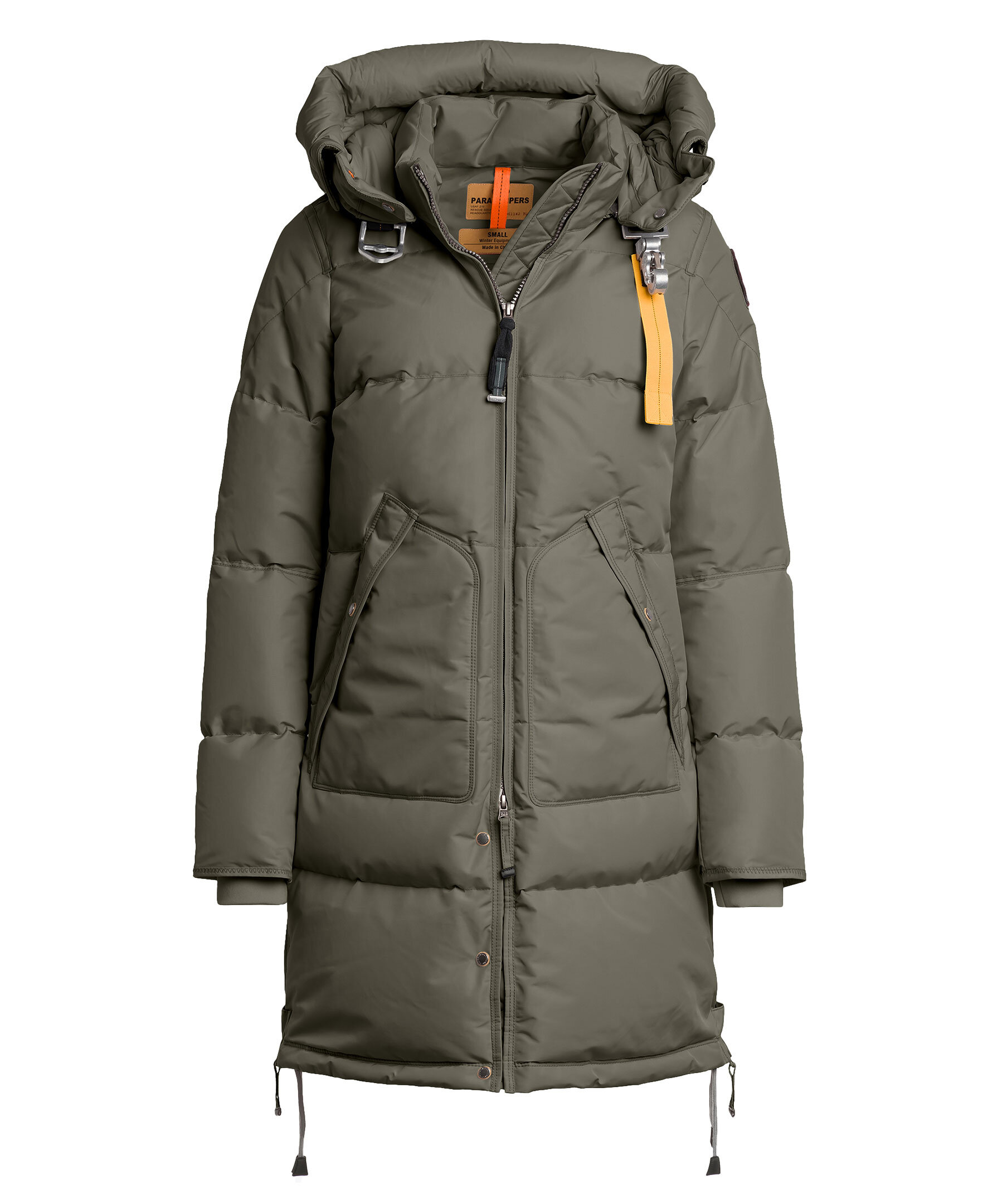 Olivgrön dunjacka från Parajumpers som stängs framtill med tvåvägsdragkedja. Två fickor framtill som stängs med tryckknapp. Vattenavvisande yttertyg. Ribbstickade muddar vid ärmslut. Parajumper-patch på ena ärmen och den ikoniska kroken med gul rem vid halsknäppningen.