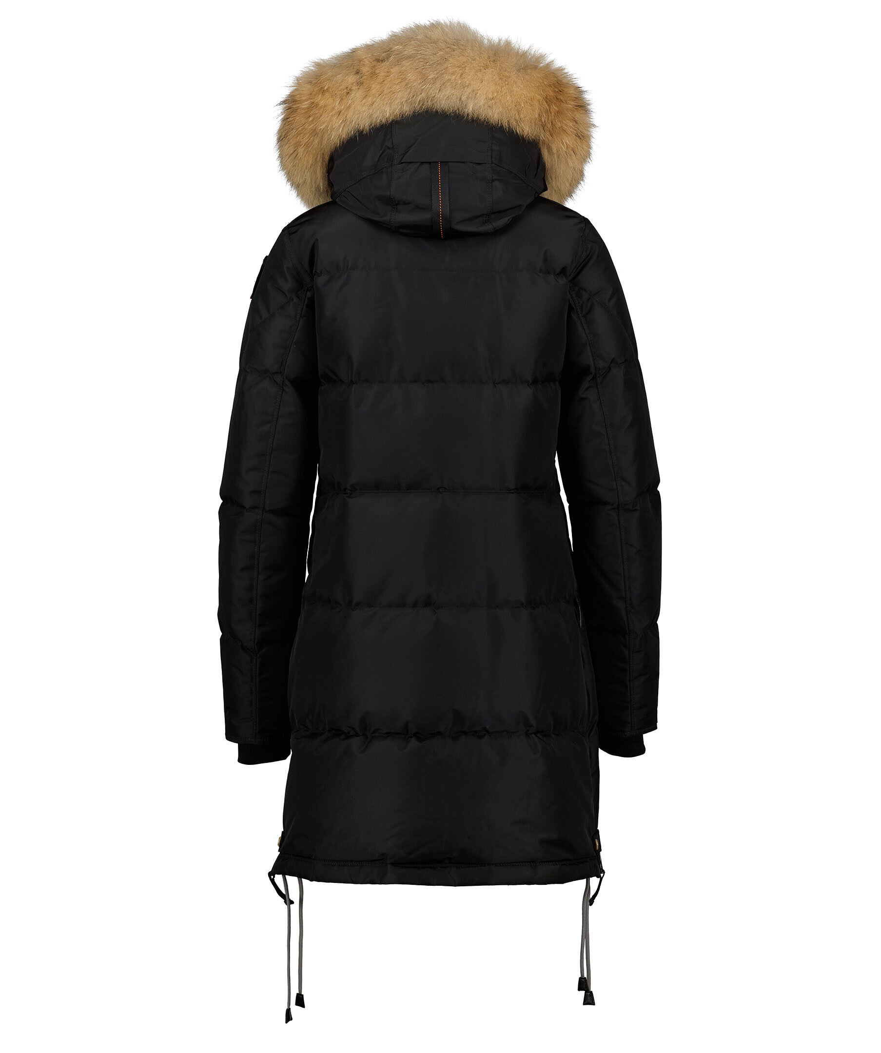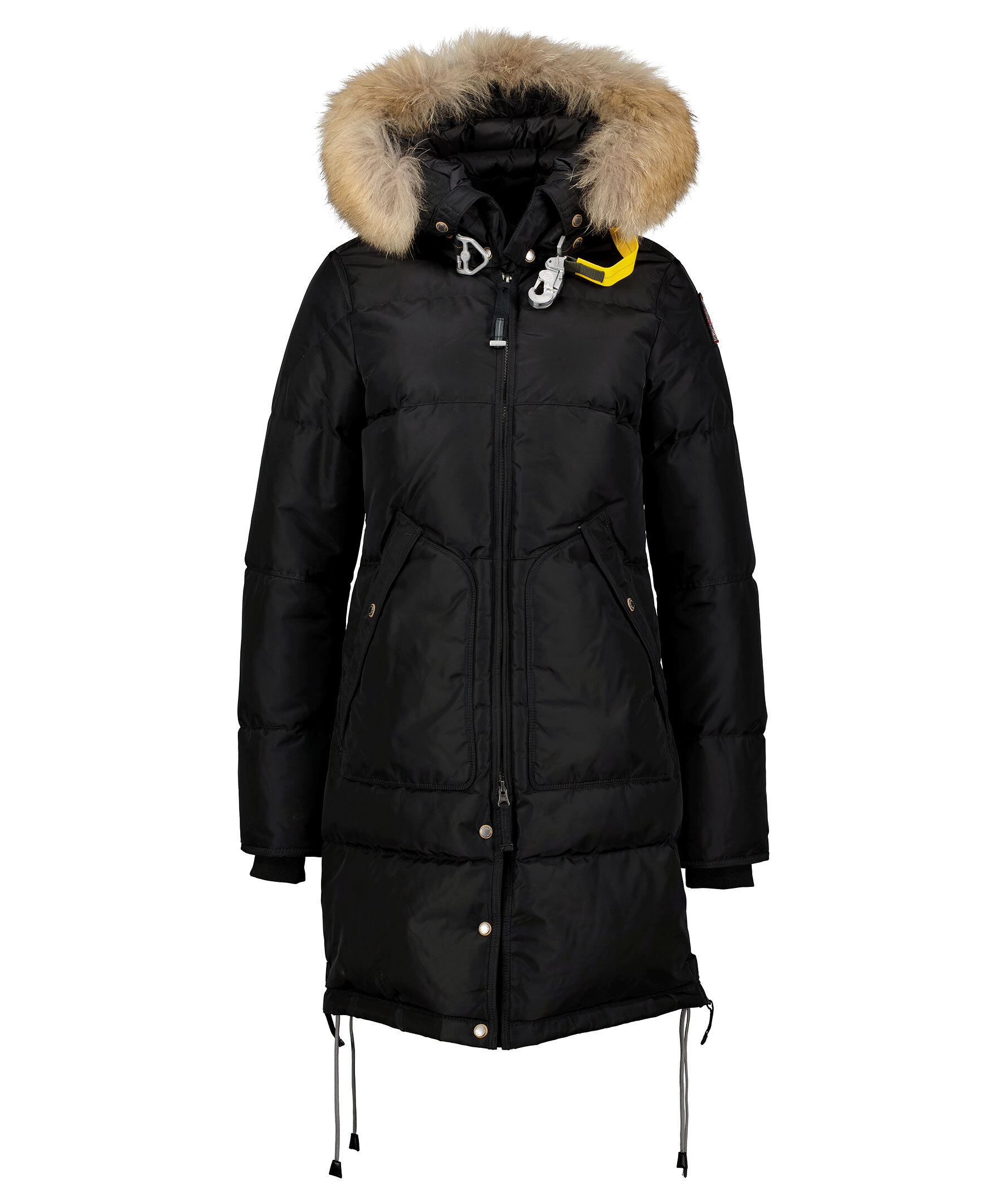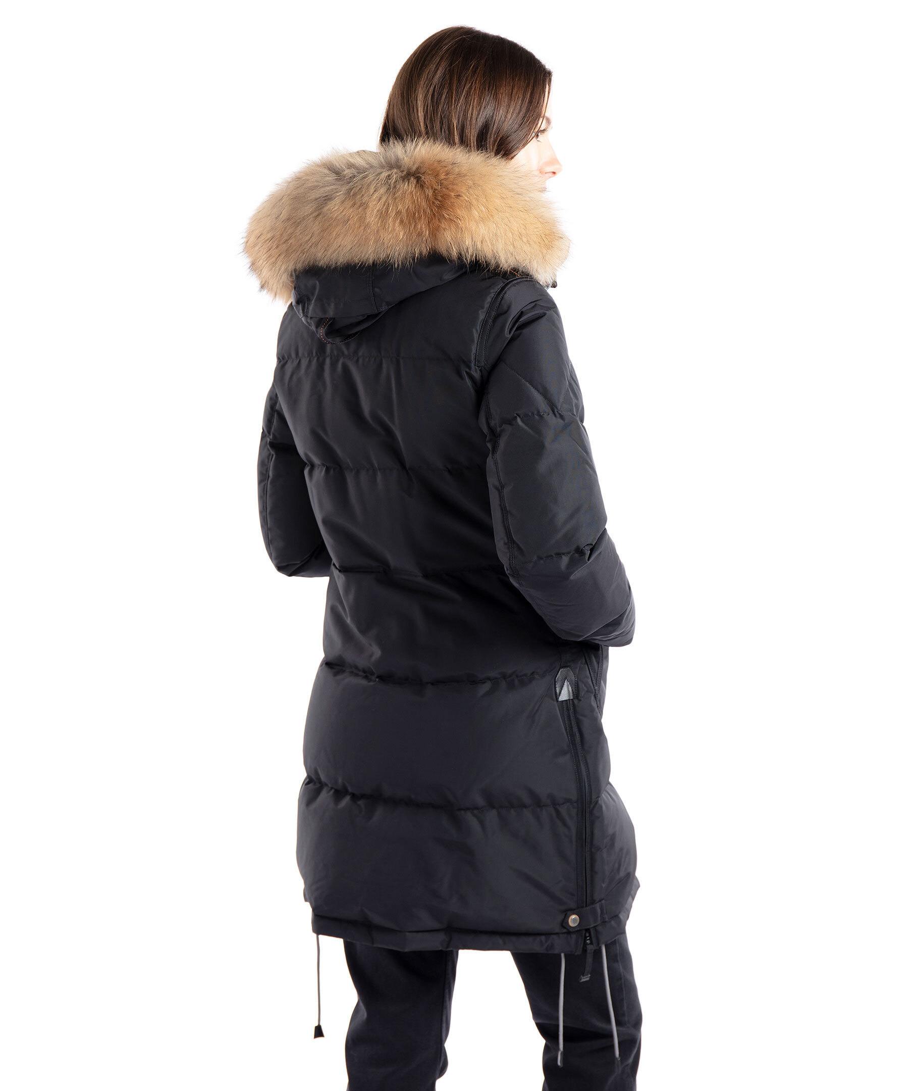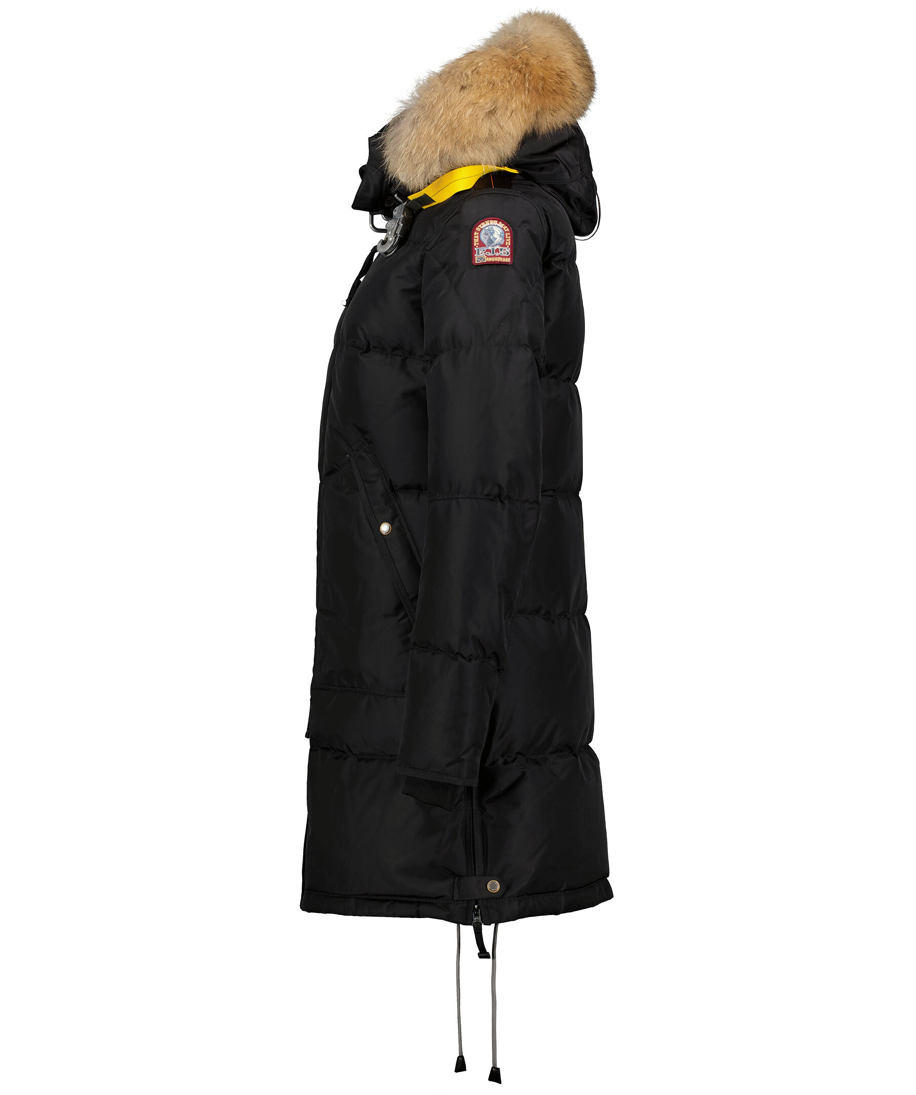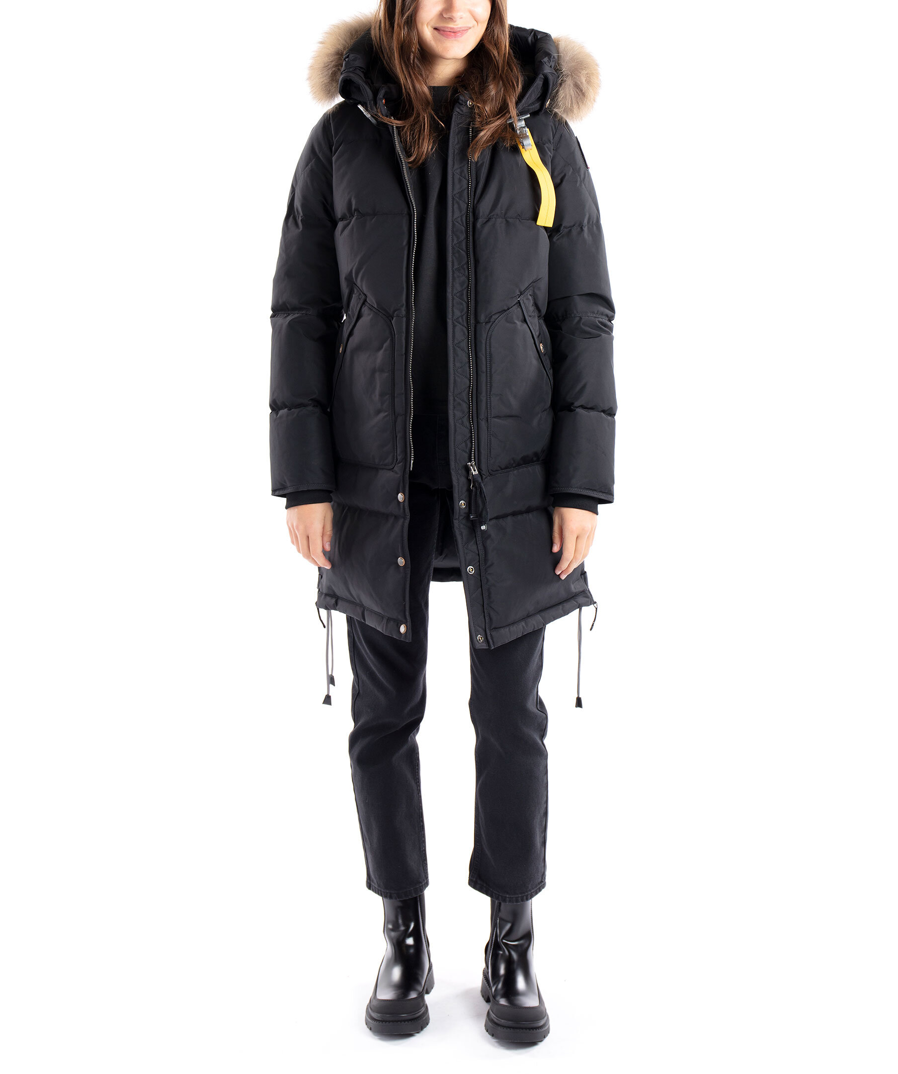 Svart lång dunjacka från Parajumpers. Två framfickor som stängs med tryckknapp, stort löstagbart spänne i halsen med en gul flärp. Avtagbar luva och avtagbar krage i beige naturpäls. Brodyrmärke på ärmen som går att ta bort. Stängs med tvåvägsdragkedja och tre tryckknappar längst ner. Muddar i ärmslut, dragsko längst ner och dragkedjor i sidorna. Ingår i Parajumpers Masterpiece Series bestående av deras exklusivaste modeller. TIPS! Ånga pälsen för att få den stor och fluffig. OBS! Naturpälsar är unika och kan skilja sig från bilden. Modellen är 178cm lång och har på sig storlek S.
