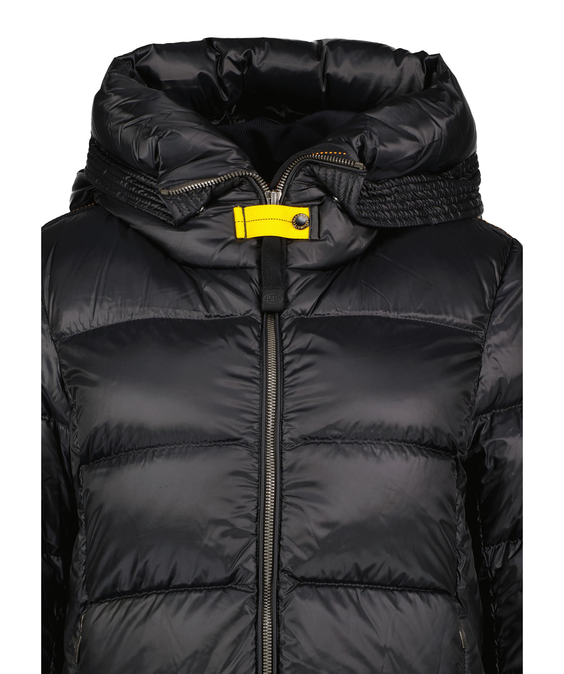 Svart, lång jacka med huva från Parajumpers. Marion är en klassisk pufferjacka med elegant design och i ett glänsande nylon-polyester twill. Stängs med tvåvägsdragkedja. Jackan har två sidfickor på utsidan samt en ficka på insidan. Patch-logotyp på vänster ärm.
