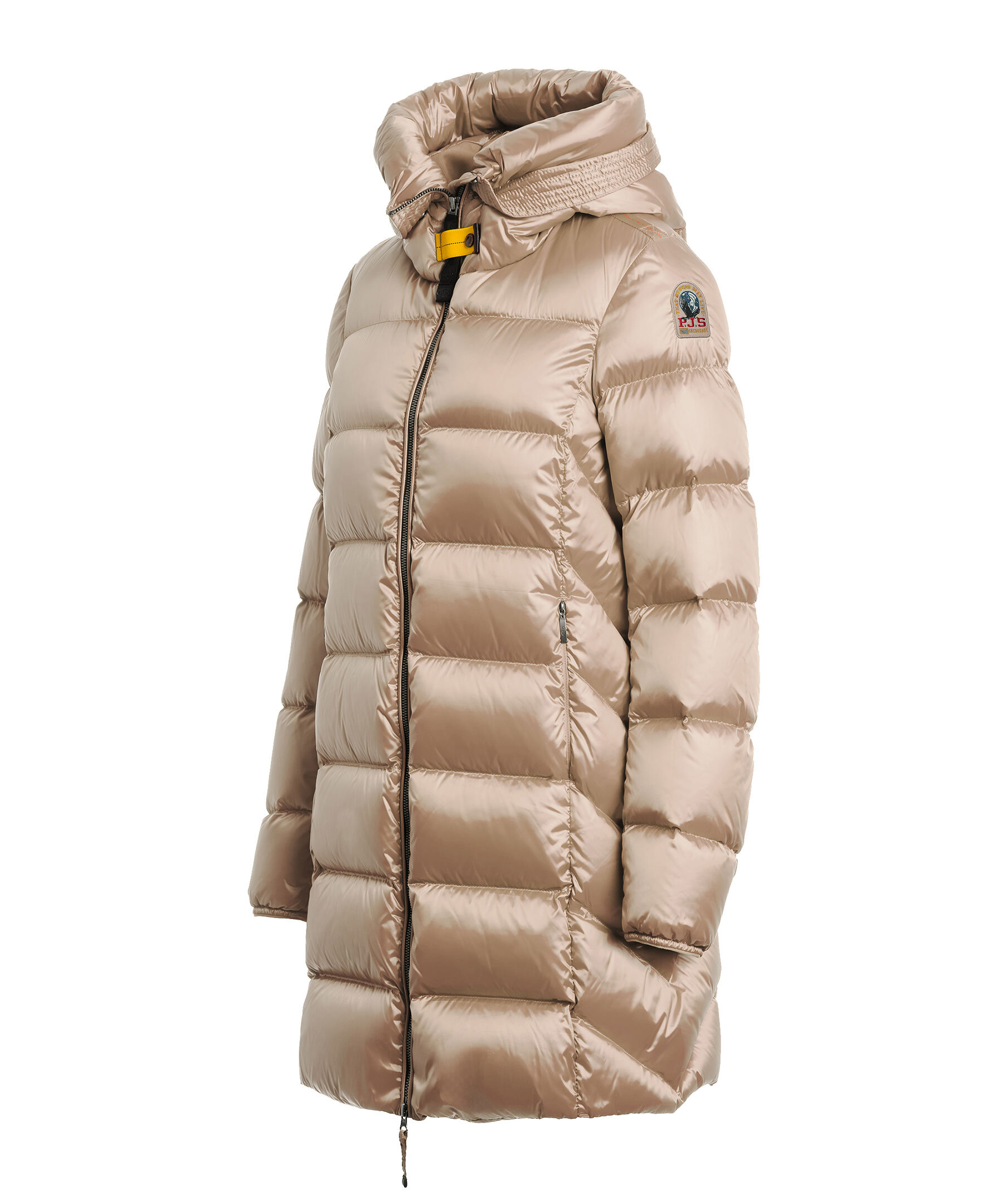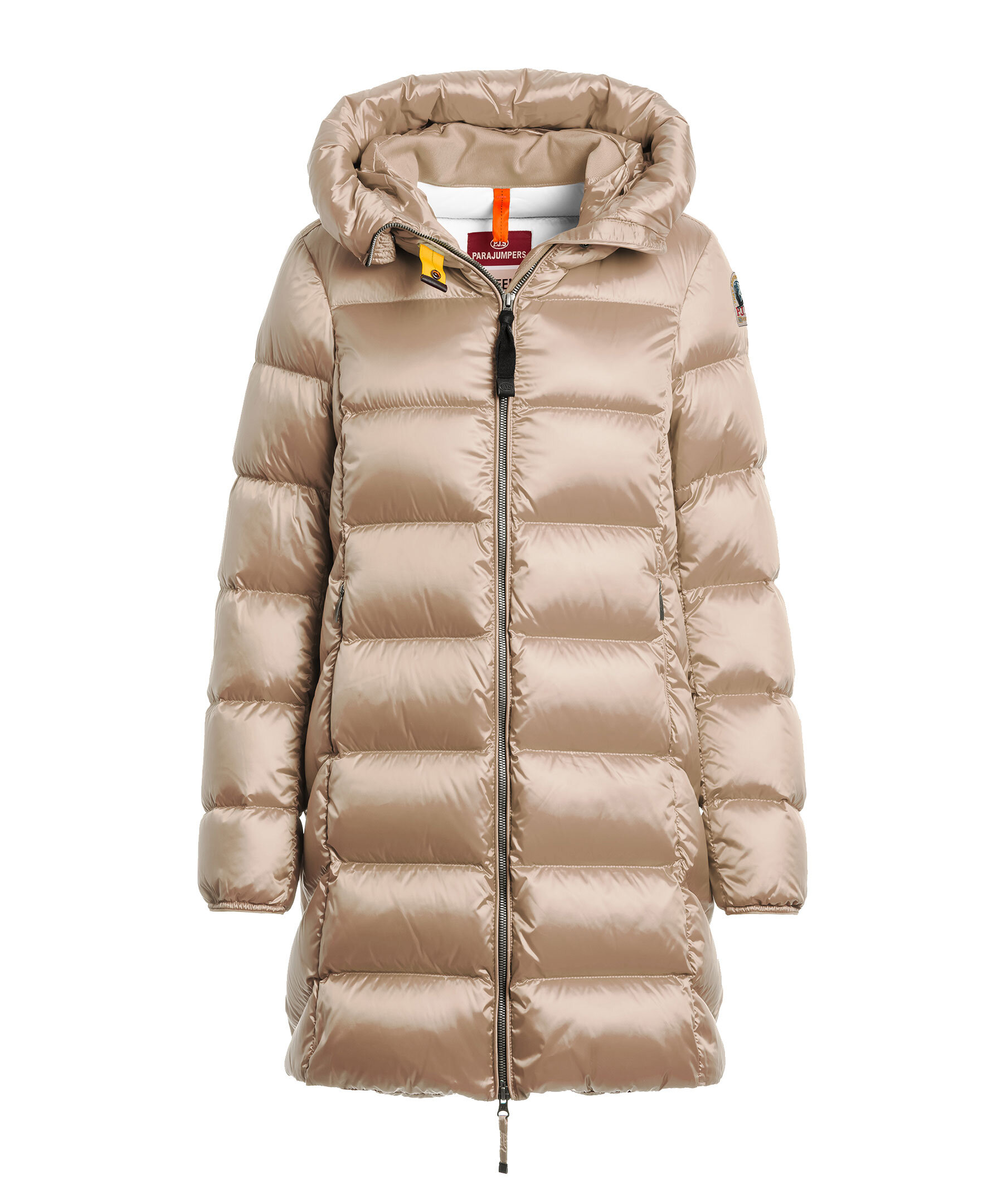 Beige, lång vinterjacka med huva från Parajumpers. Marion är en klassisk pufferjacka med elegant design och i ett glänsande nylon-polyester twill. Stängs med tvåvägsdragkedja. Jackan har två sidfickor på utsidan samt en ficka på insidan. Patch-logotyp på vänster ärm.