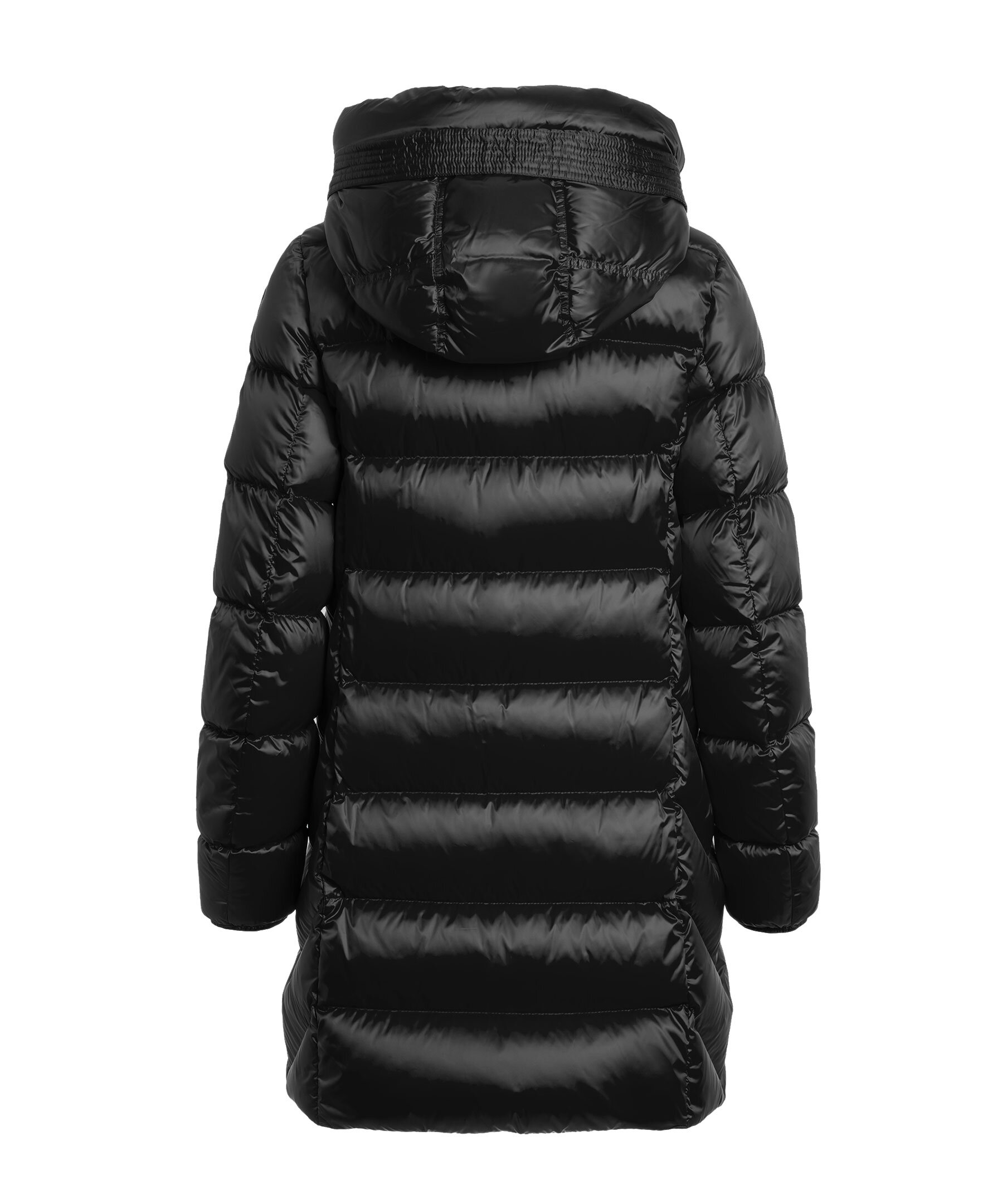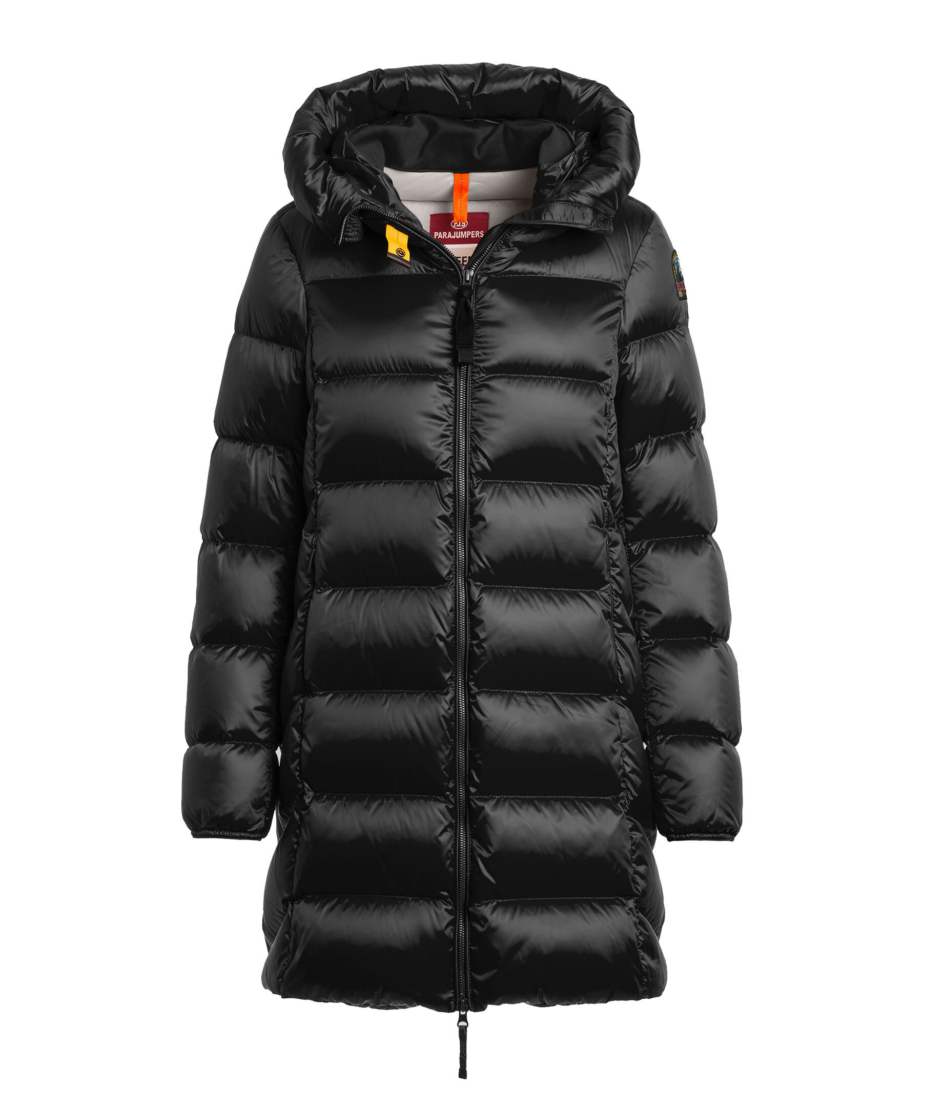 Svart, lång vinterjacka med huva från Parajumpers. Marion är en klassisk pufferjacka med elegant design och i ett glänsande nylon-polyester twill. Stängs med tvåvägsdragkedja. Jackan har två sidfickor på utsidan samt en ficka på insidan. Patch-logotyp på vänster ärm. Smal passform.