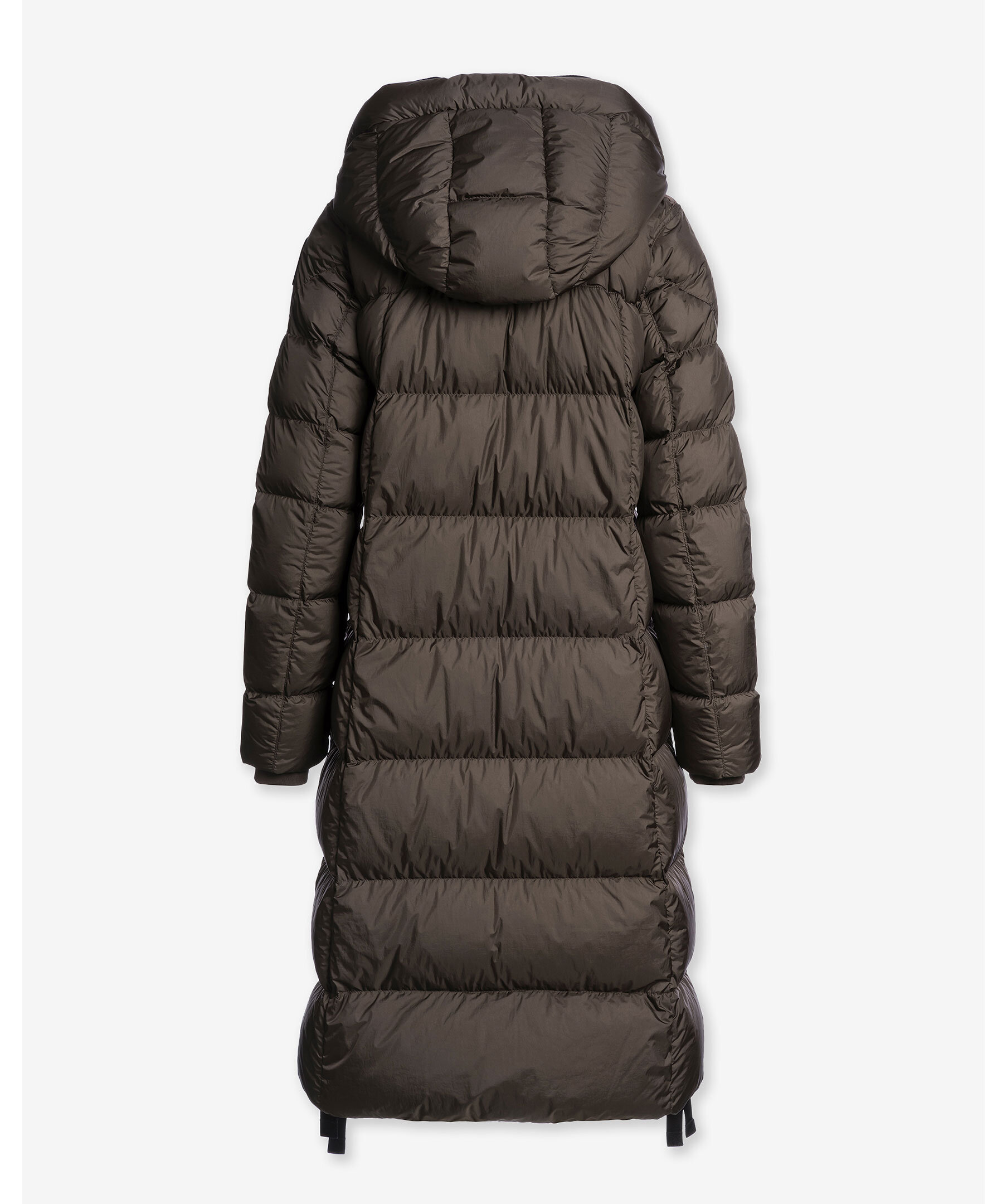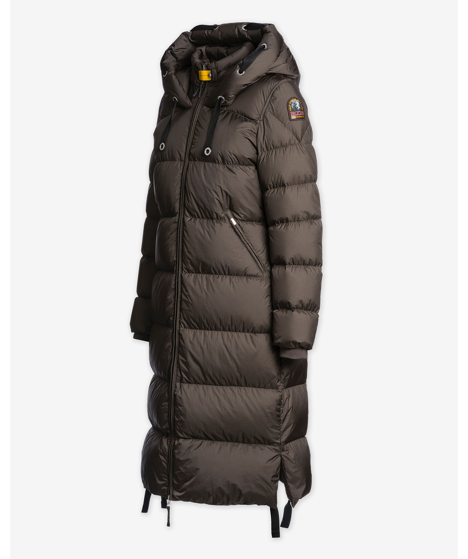 Brun, lång dunkappa från Parajumpers. Fast luva med bred, svart snörning, hög krage och tvåvägsdragkedja. Vattenavvisande, andningsbart och vindtätt tyg och har en fyllning med 100% ankdun. Två fickor med dragkedja och två innerfickor i mesh. Ribbstickade muddar och botten som är justerbar med hjälp av dragsko som knyts i sidorna. Ikoniska detaljer som det gula elastiska bandet som knäpps vid kragen och patch med logotyp på vänster ärm.