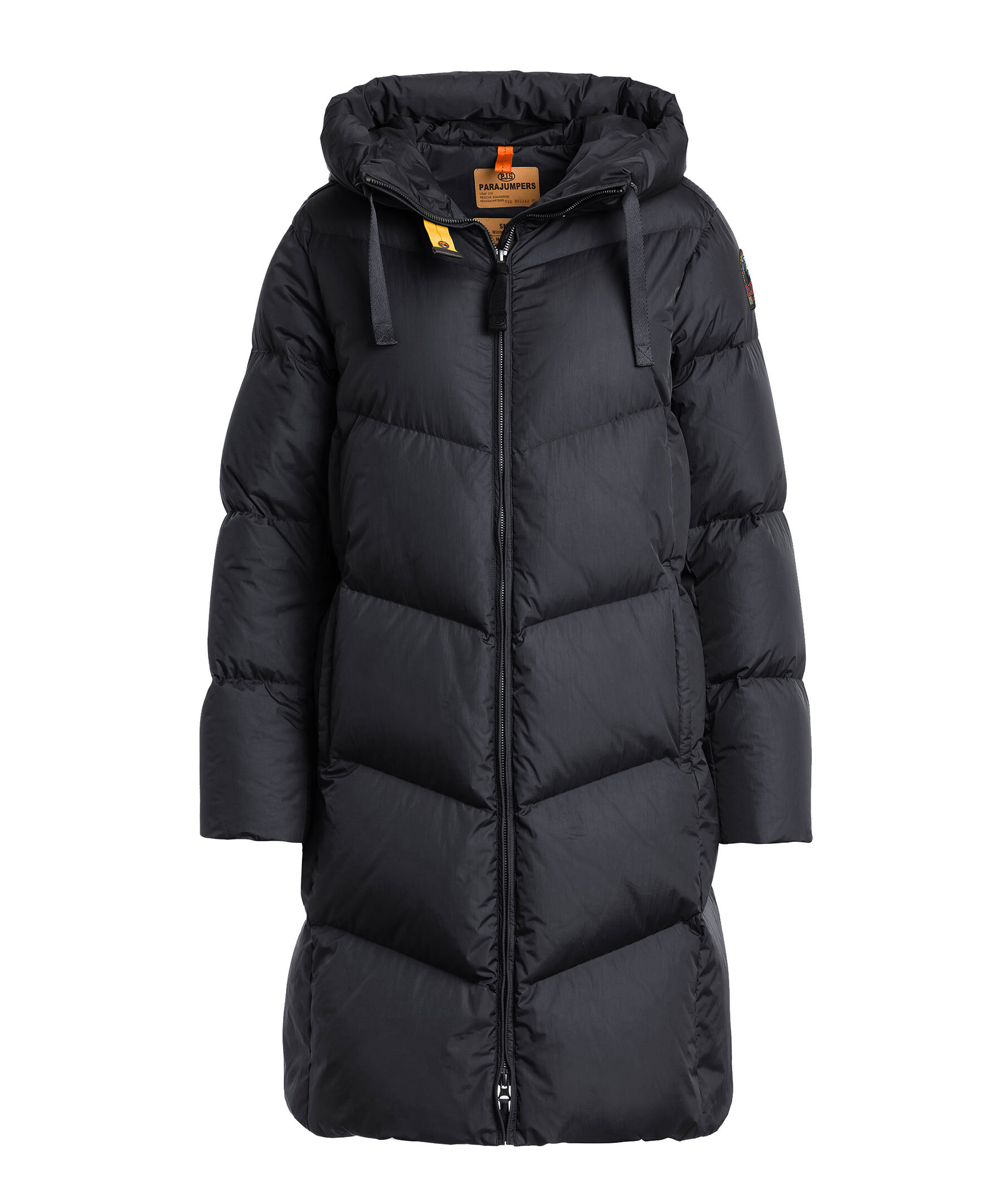 Svart, lång och quiltad pufferjacka från Parajumpers. Jacka stängs med tvåvägsdragkedja och har huva med dragsko, två sidfickor med dragkedja samt patch med logotyp på vänster ärm. Tillverkad i polyamid med dunfyllning. ■ OBS! Modellbilderna visar endast passform