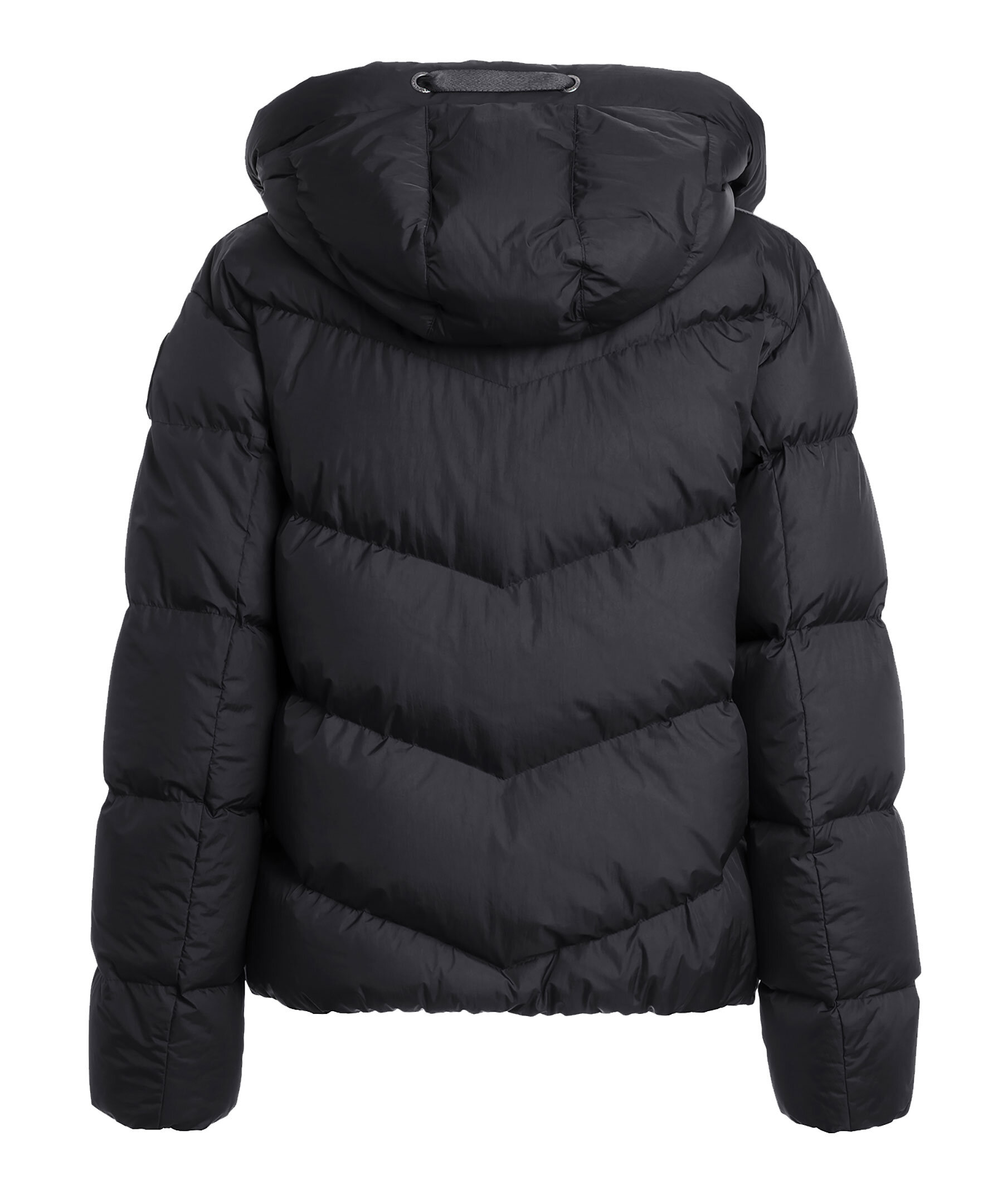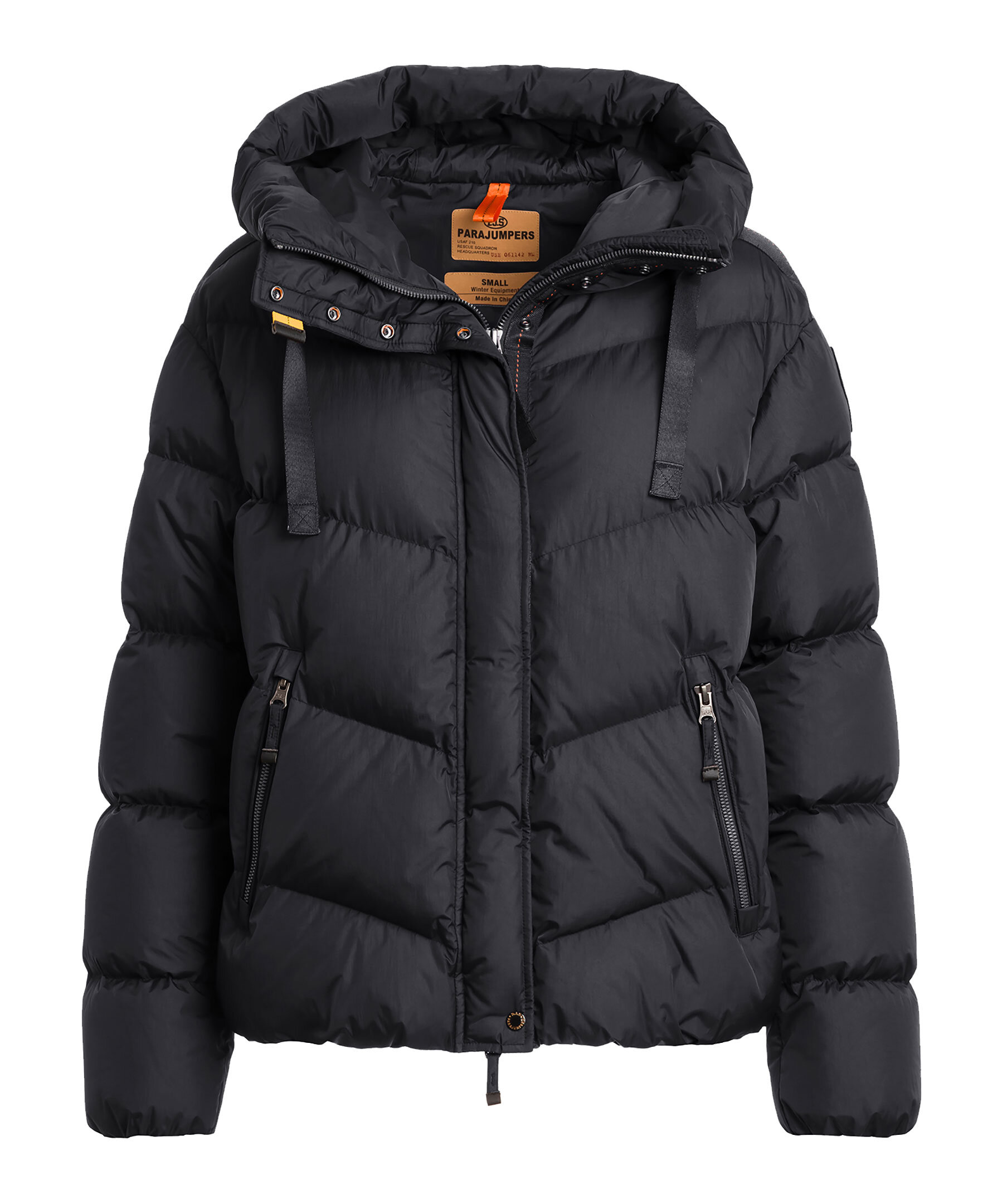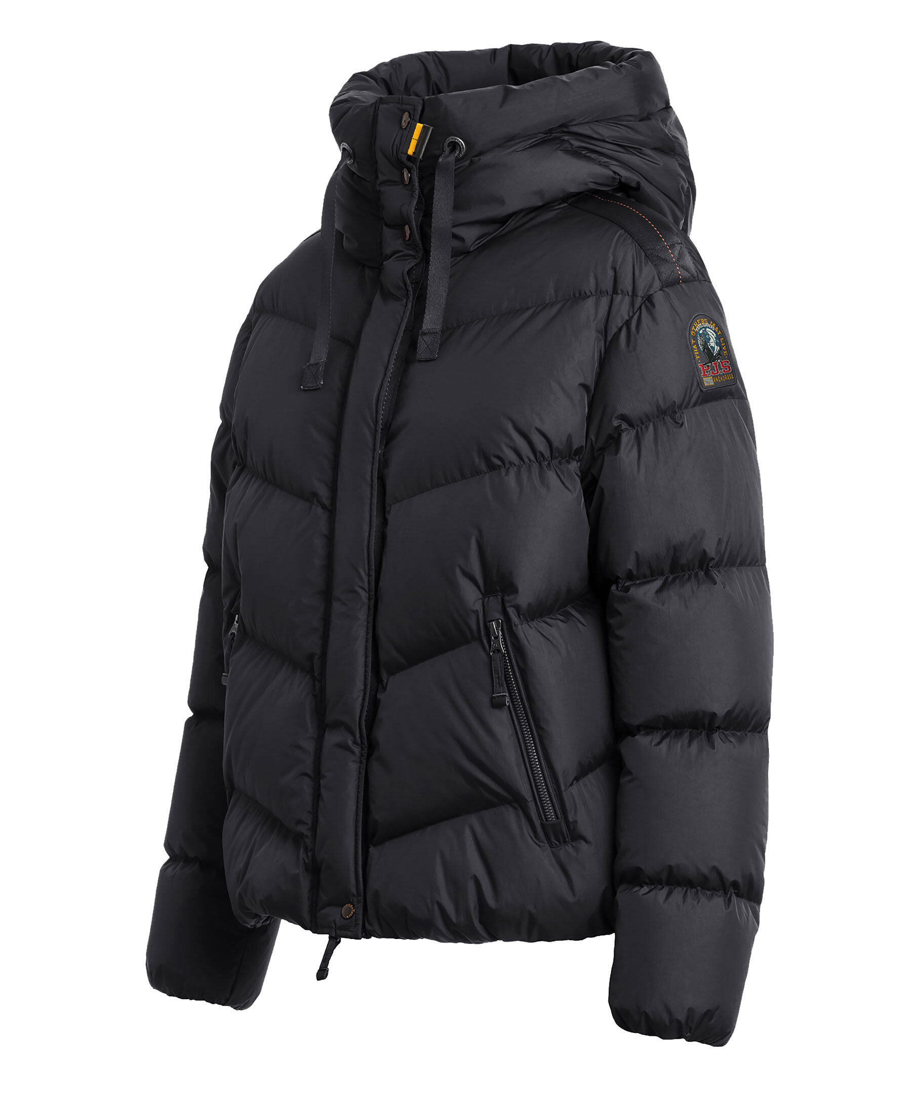 Svart, quiltad dunjacka i en kort modell från Parajumpers. Jackan stängs med dold tvåvägsdragkedja och tryckknappar och har huva med dragsko, två sidfickor med dragkedja samt patch-logotyp på vänster ärm. Tillverkad i polyamid med dunfyllning. ■ OBS! Modellbilderna visar endast passform
