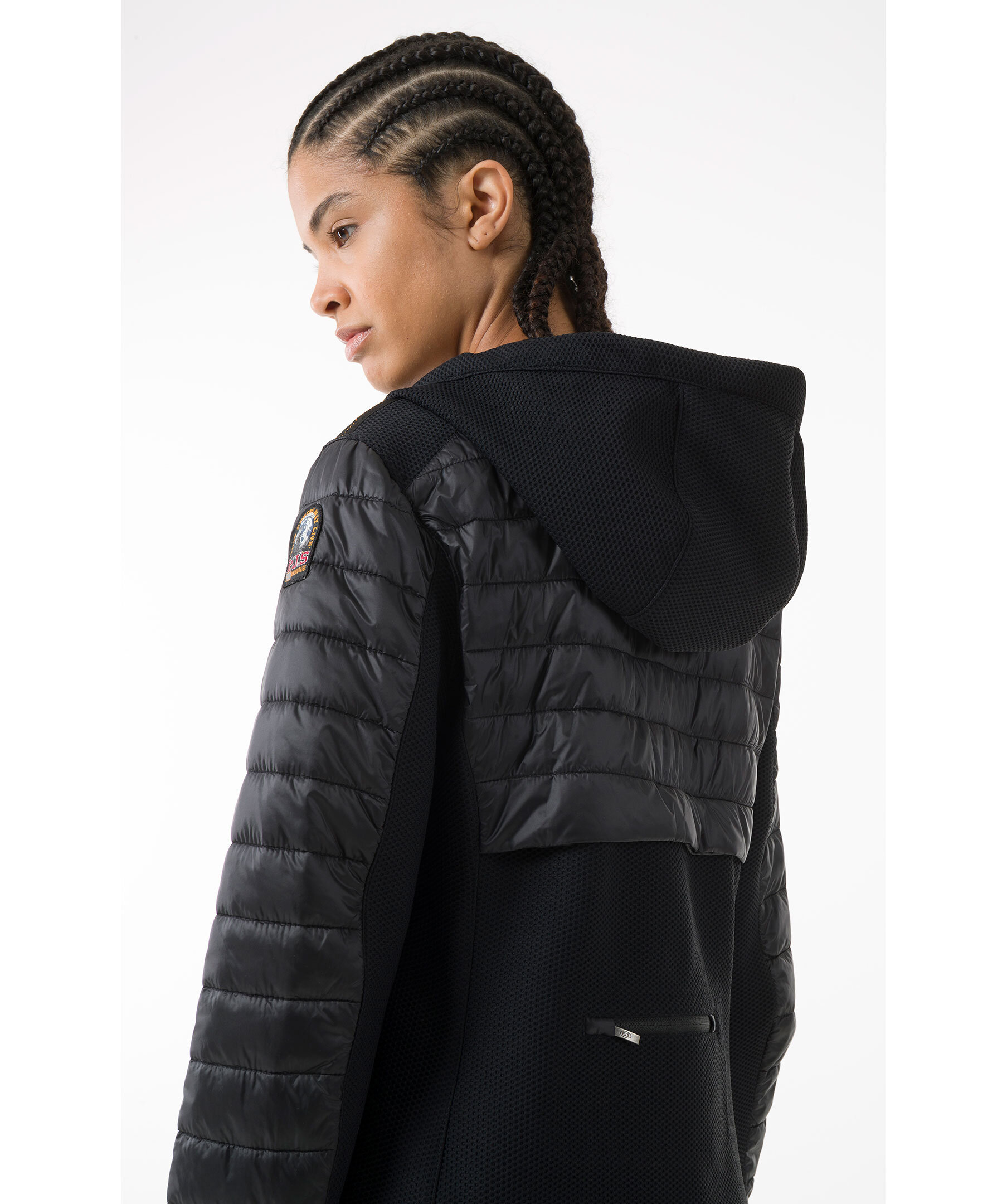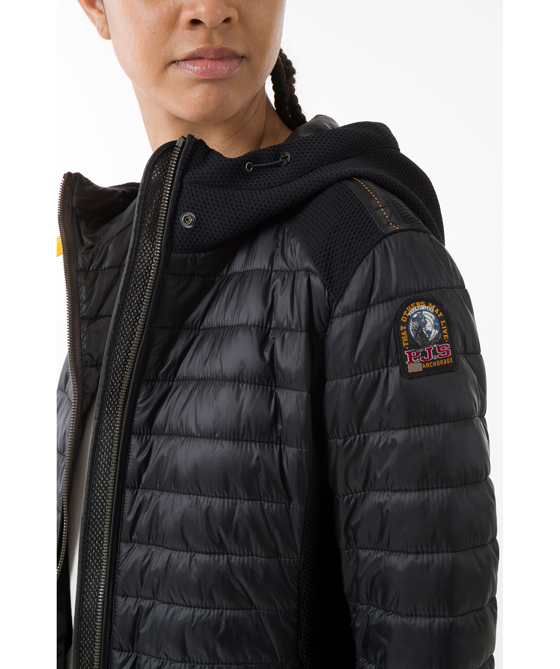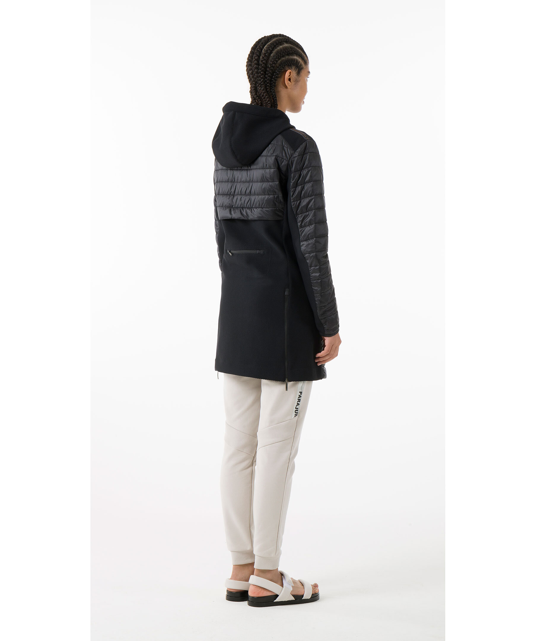 Svart lång hybridjacka från Parajumpers. Luva med dragsko Ärmar, sidor, delvis i mesh. Stängs med tvåvägsdragkedja. Två fickor framtill med smal elastisk mudd. Ficka på ryggen som stängs med dragkedja. Gult spänne vid kragen. Dragsko i luvan. Patch med logotyp på vänster ärm. Slitsar på baksidan som stängs med dragkedja.