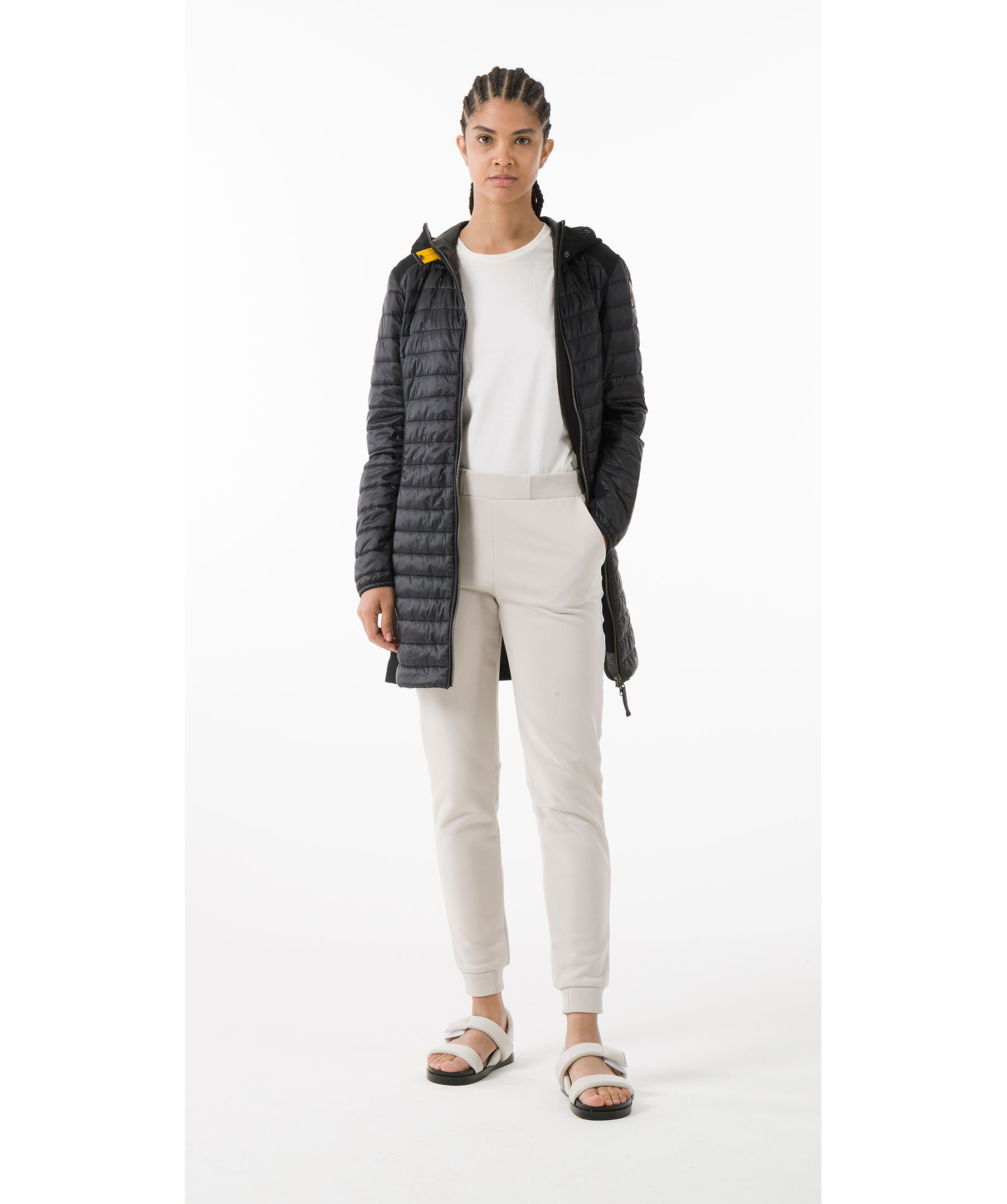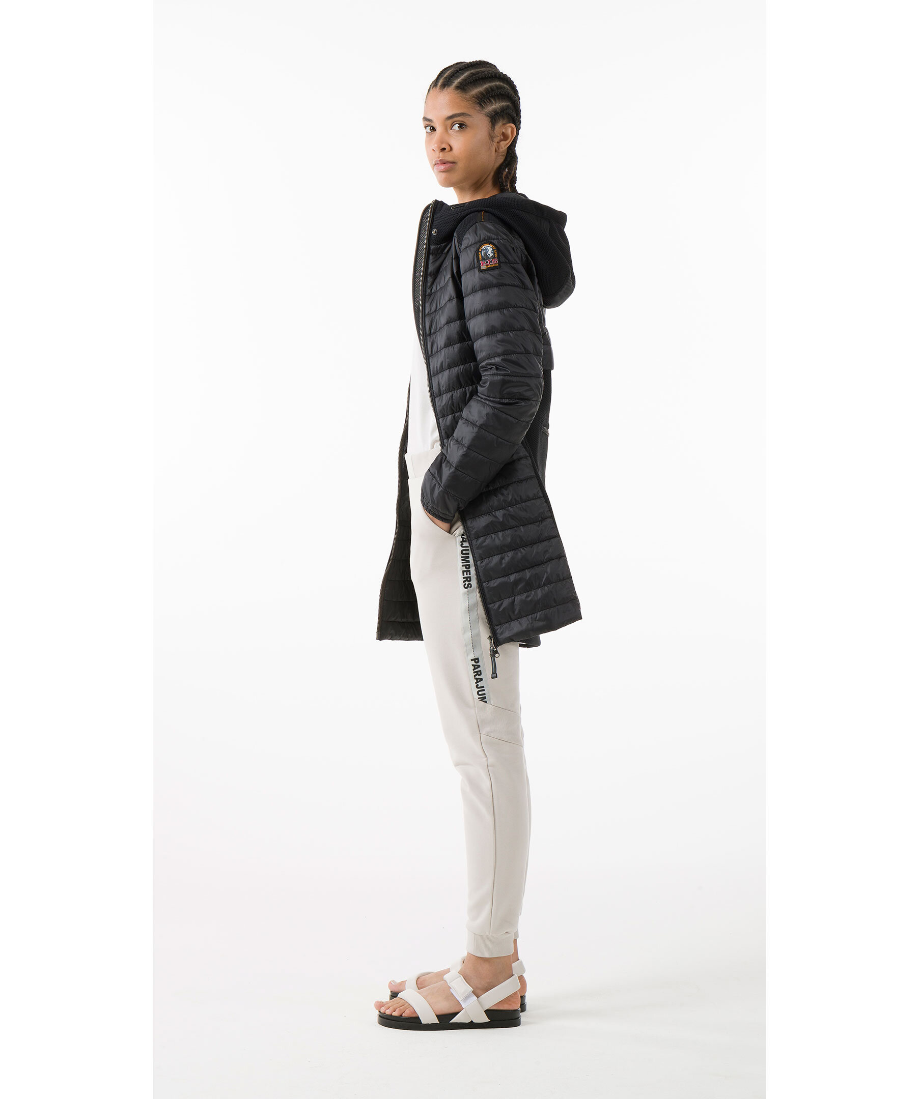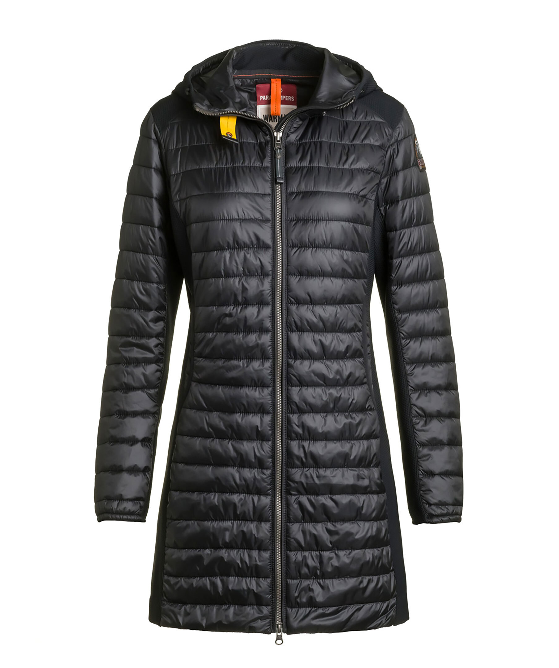 Svart lång hybridjacka från Parajumpers. Luva med dragsko Ärmar, sidor, delvis i mesh. Stängs med tvåvägsdragkedja. Två fickor framtill med smal elastisk mudd. Ficka på ryggen som stängs med dragkedja. Gult spänne vid kragen. Dragsko i luvan. Patch med logotyp på vänster ärm. Slitsar på baksidan som stängs med dragkedja.
