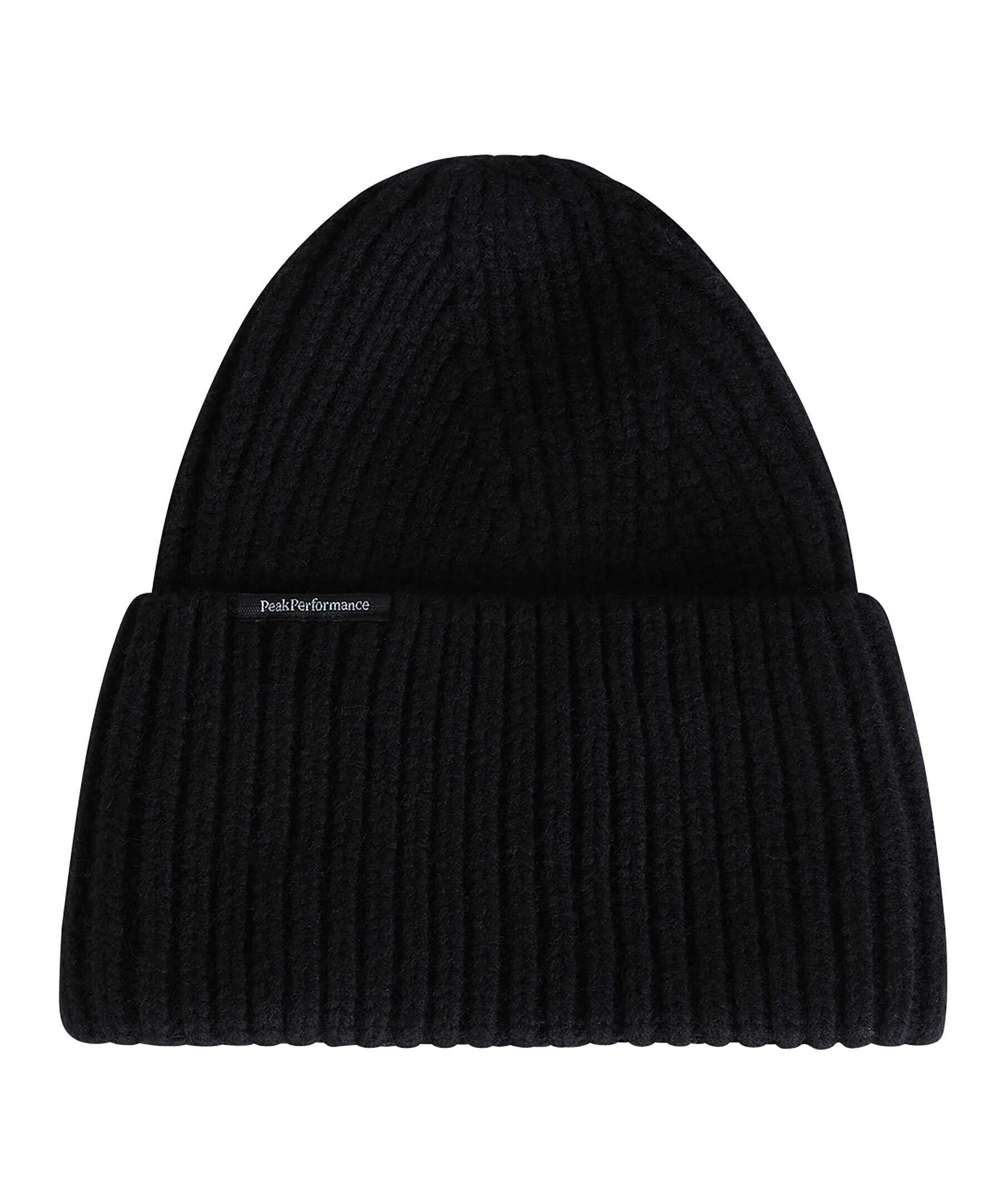 Svart, klassisk ribbstickad mössa i en ullblandning från Peak Performance. Peak Performance-flaggetikett, ribbstickad med vikt fåll och bred uppvikt kant.