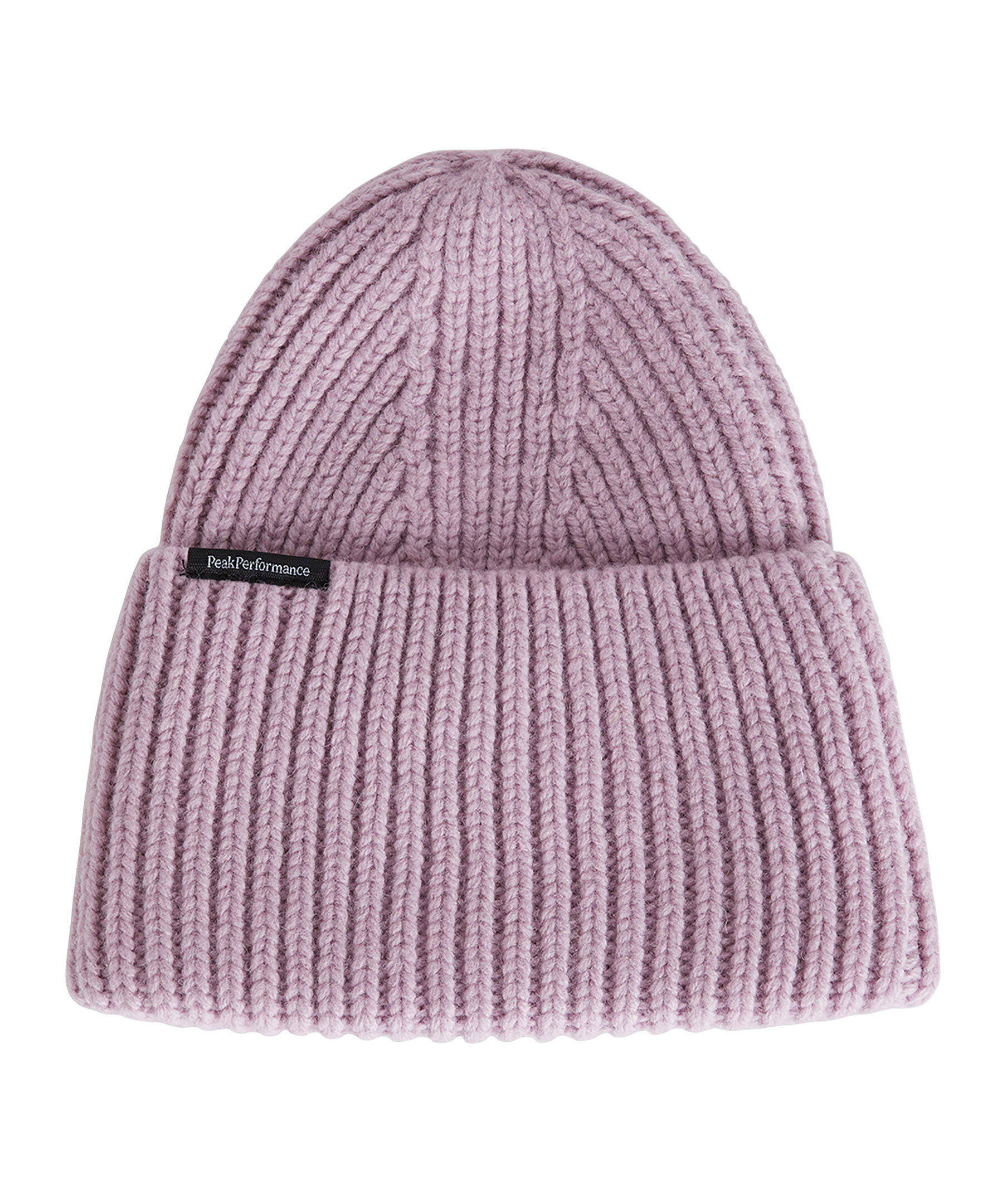 Rosa, klassisk ribbstickad mössa i en ullblandning från Peak Performance. Peak Performance-flaggetikett, ribbstickad med vikt fåll och bred uppvikt kant.